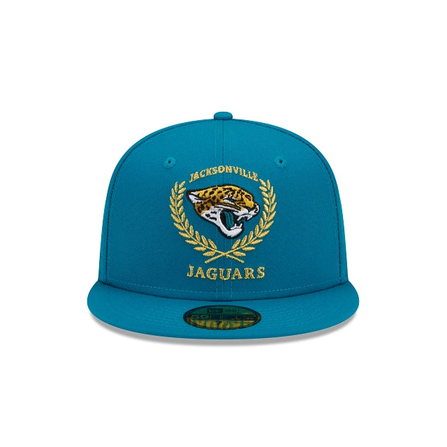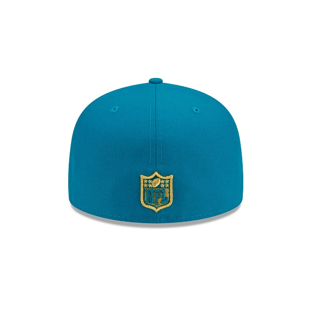 The Jacksonville Jaguars Gold Classic 59FIFTY Fitted Cap features an embroidered Jaguars insignia at the front panels with a league specific patch at the right-wear side and the NFL Shield at the rear.