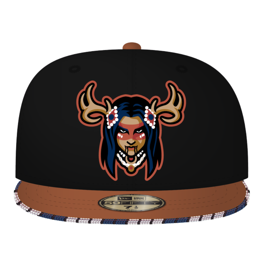 This New Era Deer Woman 59FIFTY Fitted Hat has been designed by Tóowish ‘Anó’ ~ Coyote Beadz.