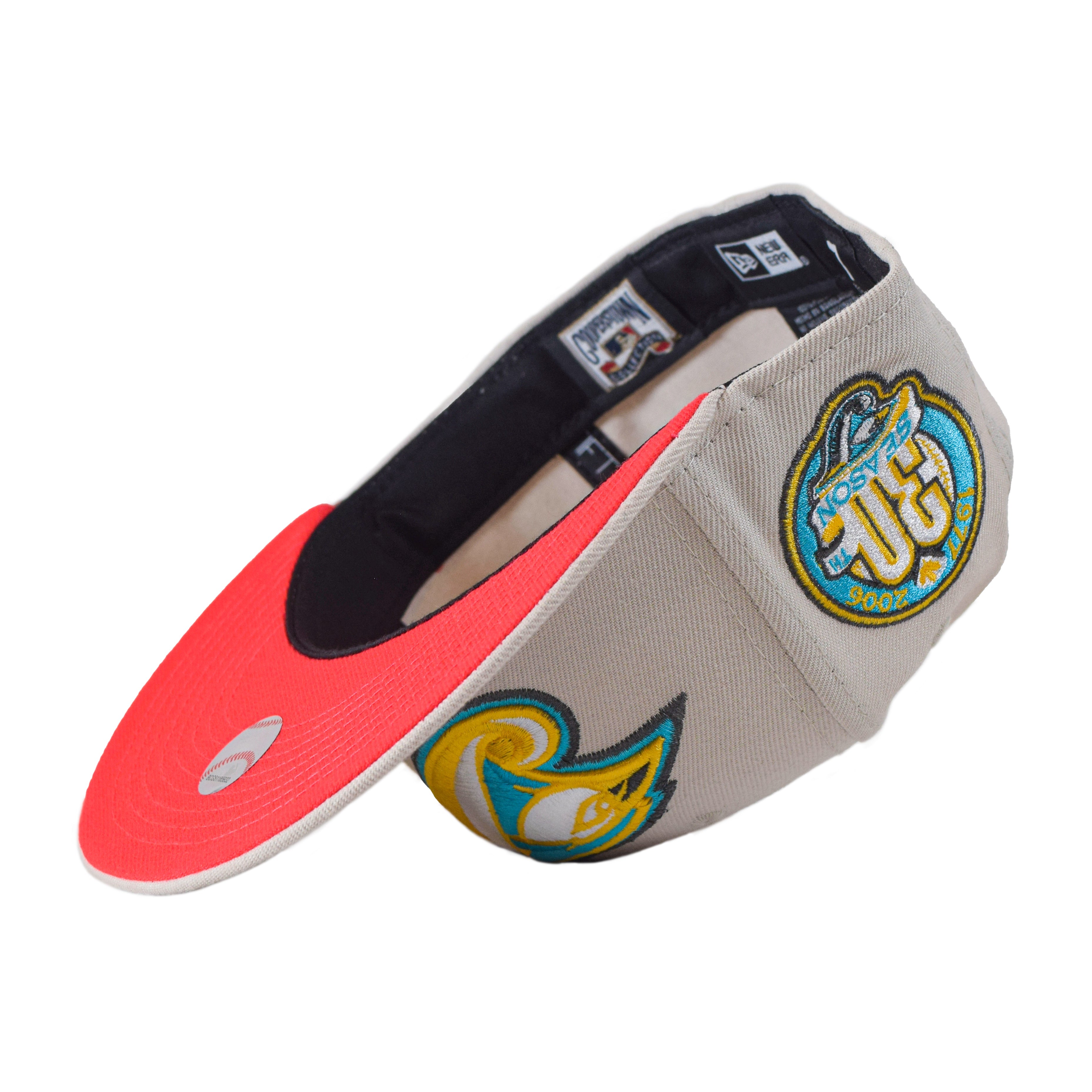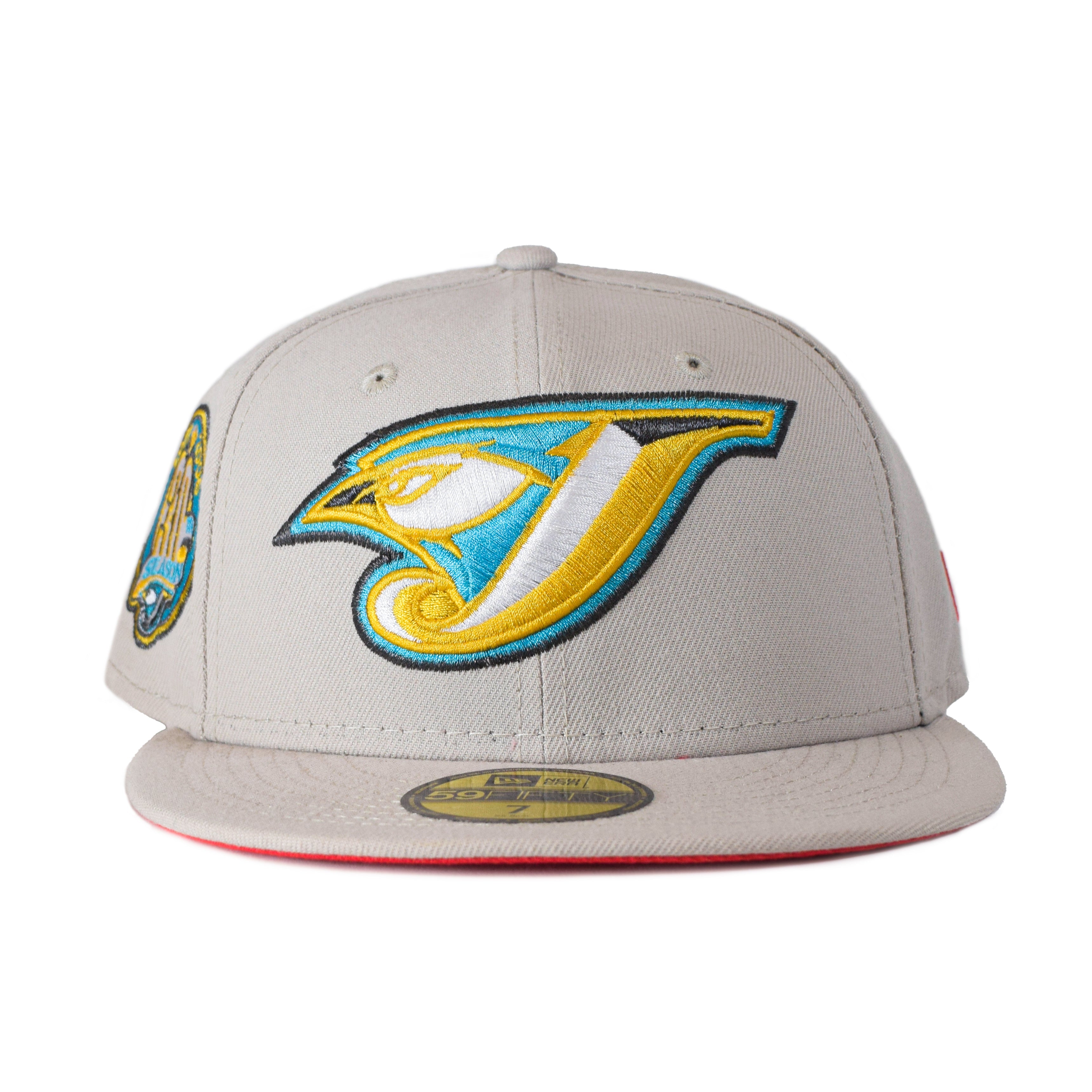 This New Era Toronto Blue Jays Stone 30th Anniversary Fluorescent Pink UV 59FIFTY Fitted Hat has a stone six panel structured high crown, embroidered eyelets with and fabric squatchee button. The fitted cap also has a stone flat bill with a fluorescent pink undervisor and black sweatband. The front panel features the Toronto Blue Jays logo embroidery and an Anniversary side patch embroidered on the right panel. The left panel of the fitted displays the New Era logo and the official MLB logo embroidery on the rear crown.