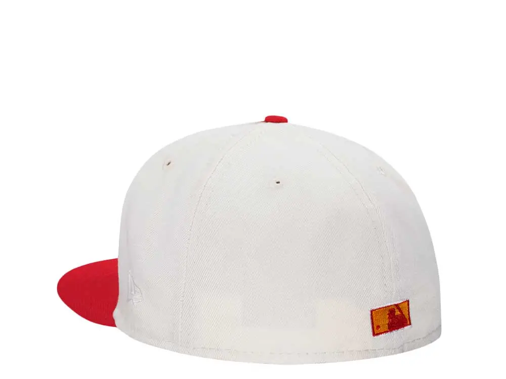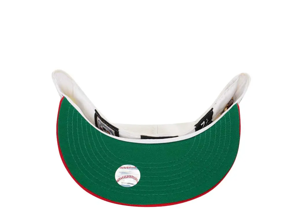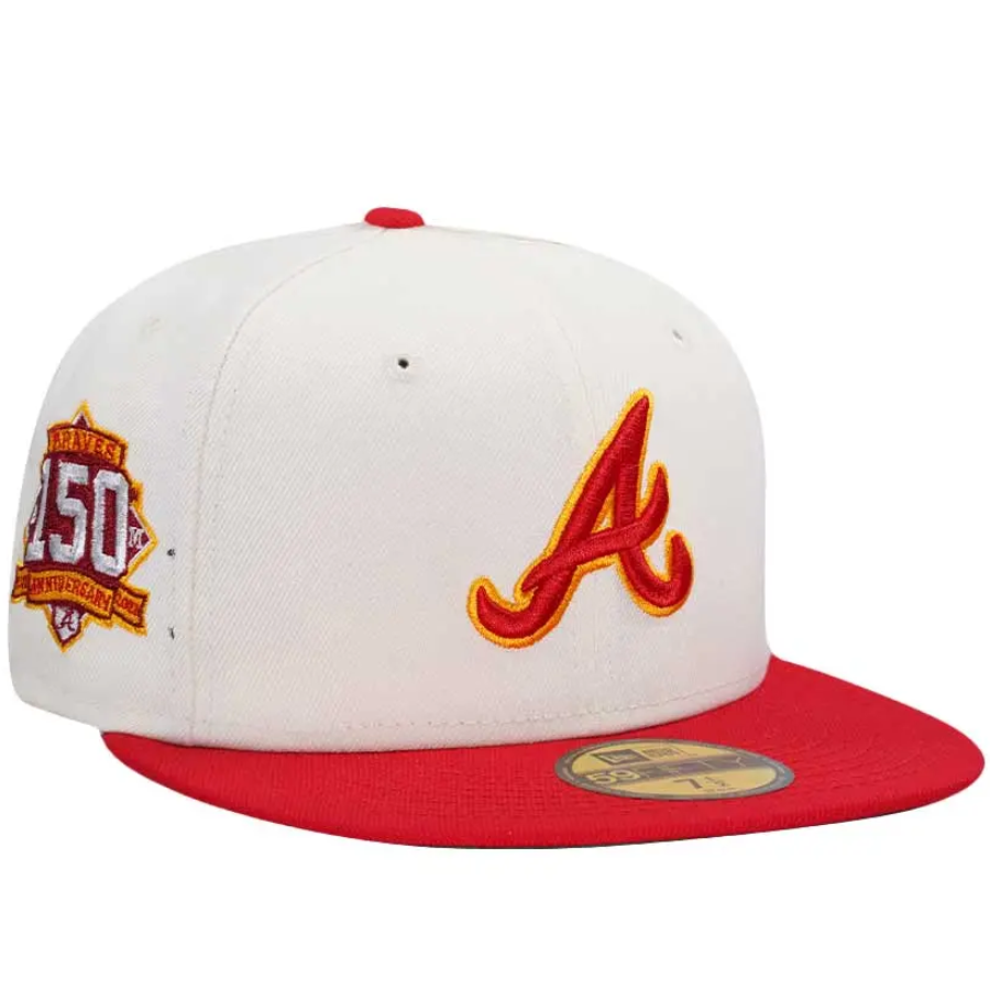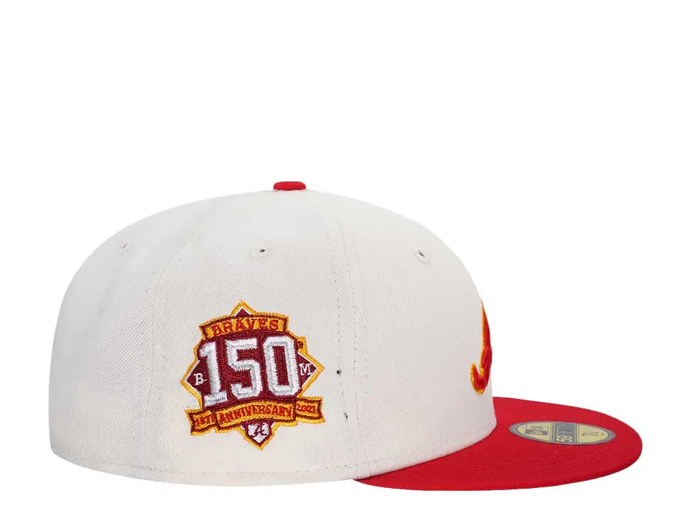 This Atlanta Braves fitted hat was released by Topperz Store. The fitted has a white six panel structured high crown and embroidered eyelets with a red fabric squatchee button. The fitted cap also has a red flat bill with a green bottom undervisor and white sweatband. The front panel features the Atlanta Braves logo embroidery and a 150th Anniversary side patch on the right panel. The left panel of the fitted displays the New Era logo and the official MLB Batterman logo embroidery on the rear crown.