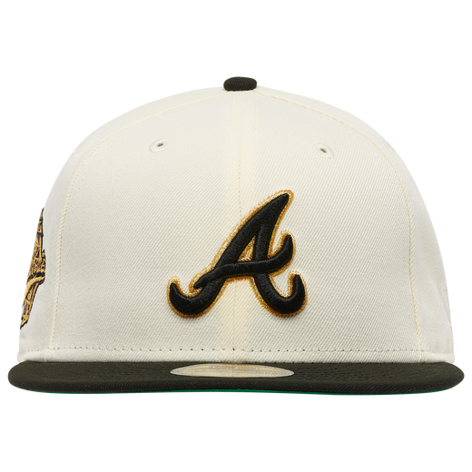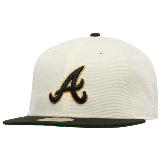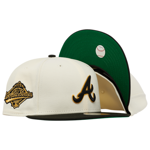 This Atlanta Braves fitted hat has a chrome six panel structured high crown and embroidered eyelets with a black fabric squatchee button. The fitted cap also has a black flat bill with a kelly green undervisor and black sweatband. The front panel features the Atlanta Braves logo embroidery and a 1995 World Series side patch embroidery on the right panel. The left panel of the fitted displays the New Era logo and the official MLB Batterman logo embroidery on the rear crown.