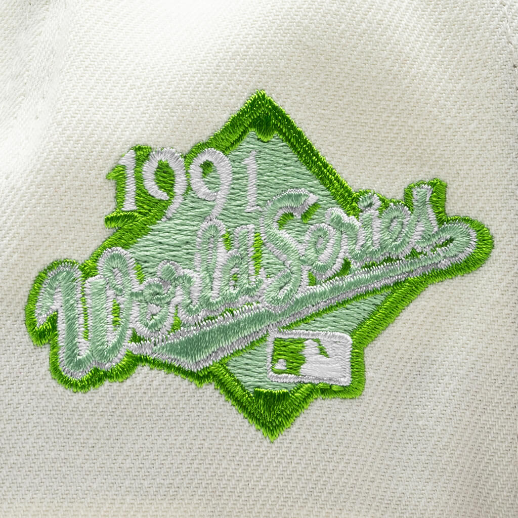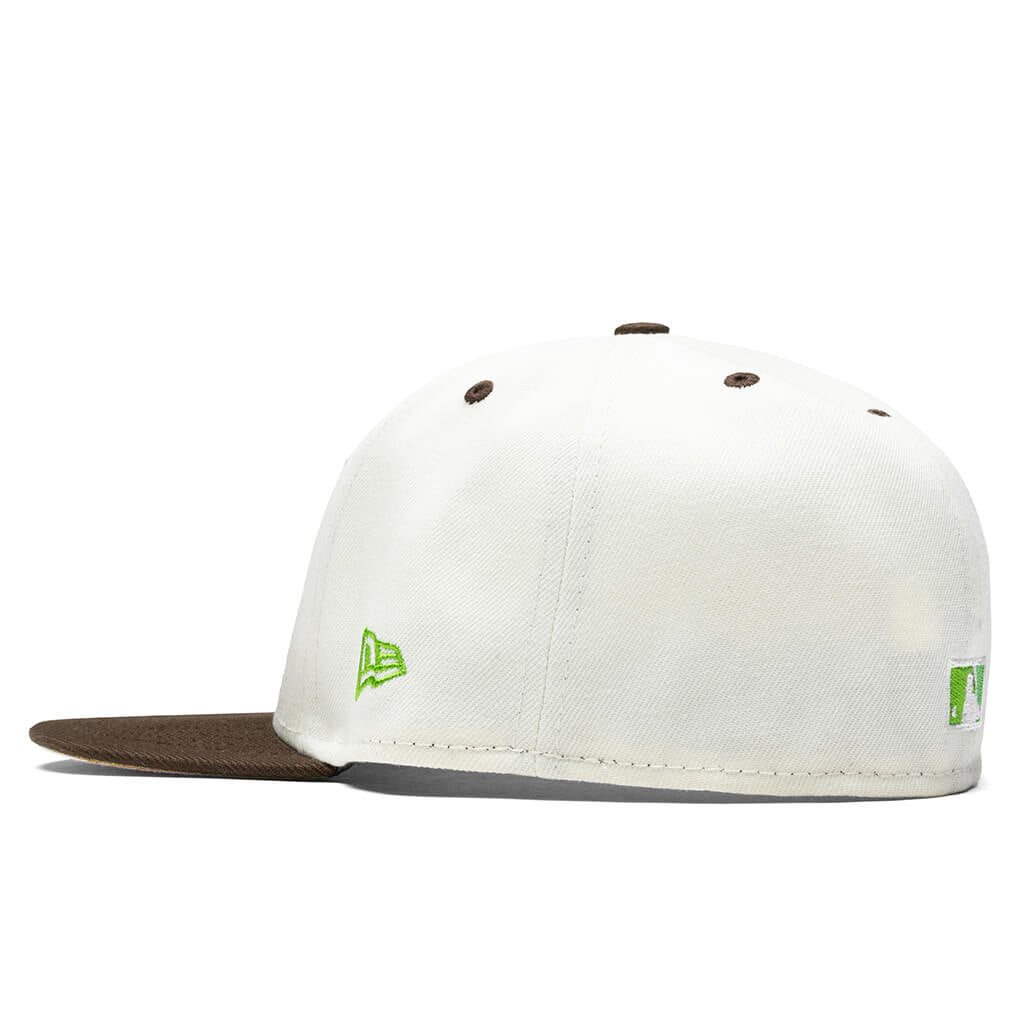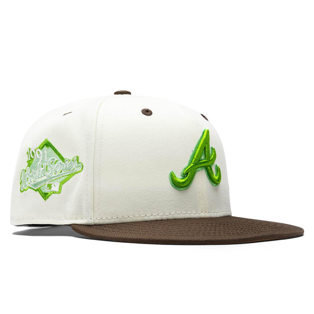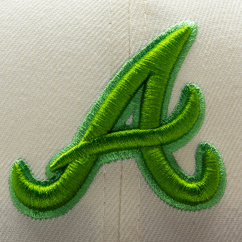 This New Era x Feature Atlanta Braves Bamboo 2023 59FIFTY Fitted Hat was released by Feature. The fitted has a chrome/white six panel structured high crown, dark brown embroidered eyelets & fabric squatchee button. The flat bill of the fitted cap is also dark brown with a lime green bottom undervisor with a white sweatband. The front panel features the Atlanta Braves logo embroidered in lime stitching with a side patch on the right panel in the same lime colorway. The left panel of the fitted displays the New Era logo and the official MLB Batterman on the rear-crown .