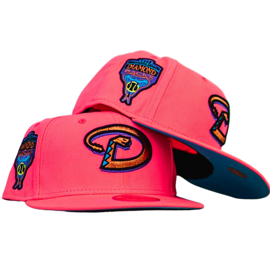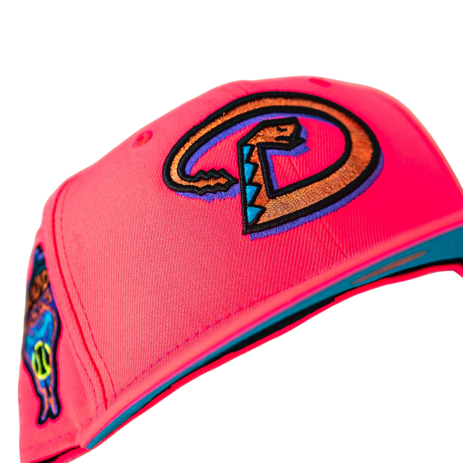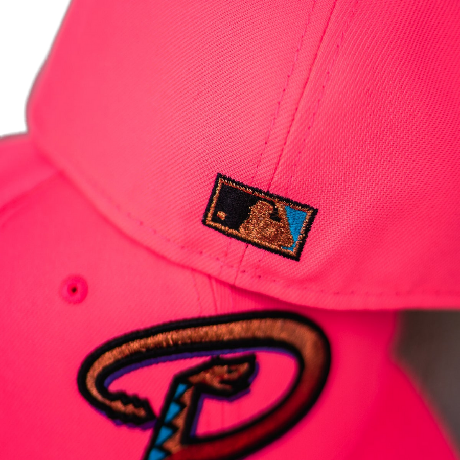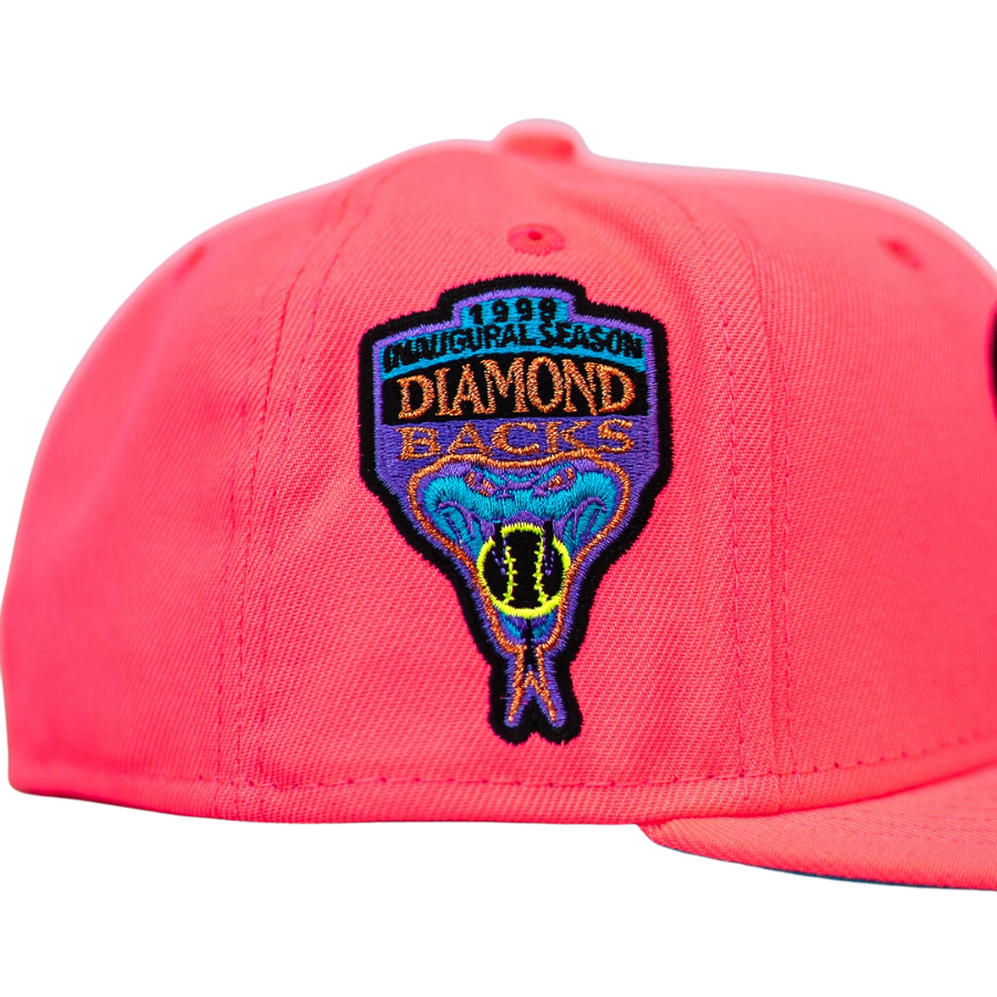 This New Era Arizona Diamondbacks fitted hat has a hot pink six panel structured high crown, embroidered eyelets and fabric squatchee button. The flat bill of the fitted is also hot pink with a aqua undervisor and black sweatband. The front panel features the Arizona Diamondbacks logo embroidery and a 1999 Inaugural Season side patch embroidered on the right panel.