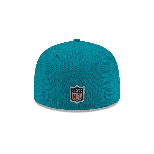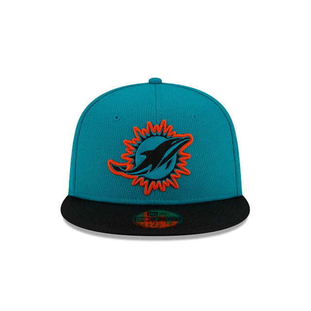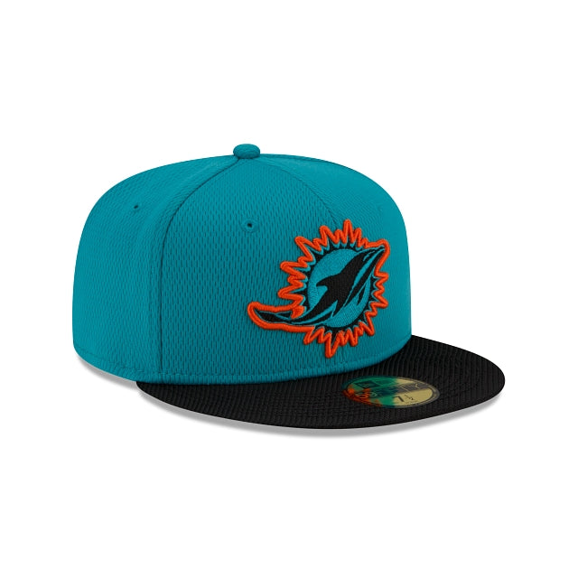 Travel in style with the Miami Dolphins Official NFL Sideline Road 59FIFTY Fitted Cap featuring a unique two-tone dashmark fabrication with an embroidered team logo at the front panels. Team color accents and the Official NFL Shield at the rear complete the official cap that players, coaches and staff will wear on the sidelines during the 2021 NFL season.