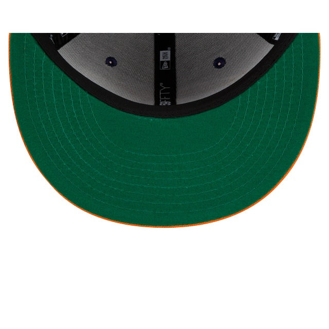 The Phoenix Suns Two-Tone Hoops 59FIFTY Fitted Cap features a team specific two-tone fabrication with a day of establishment graphic and Suns logo at the front panels and the NBA logo at the rear. Additional details include a Kelly Green undervisor.