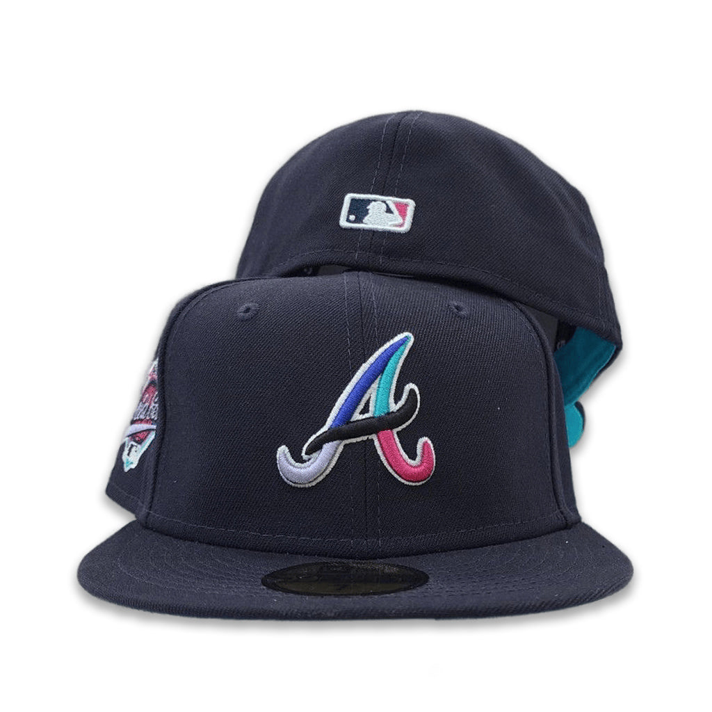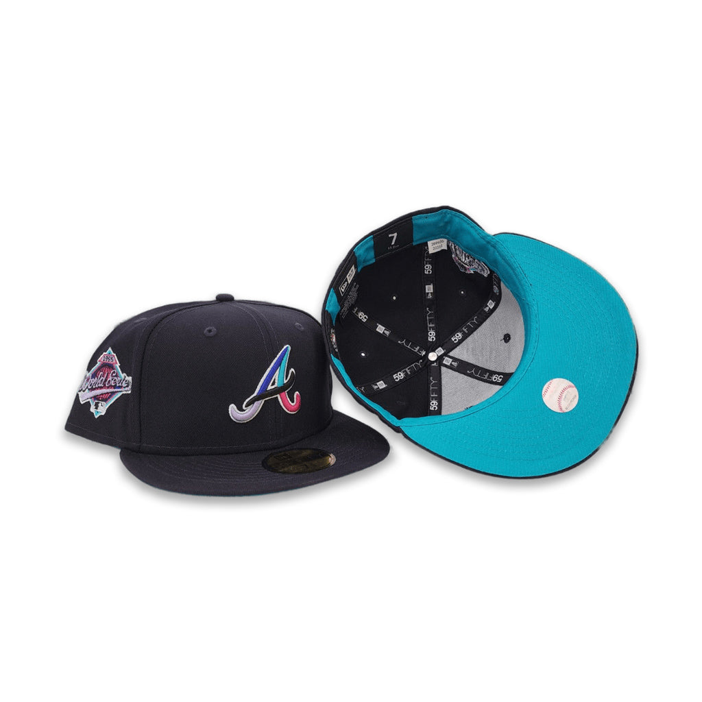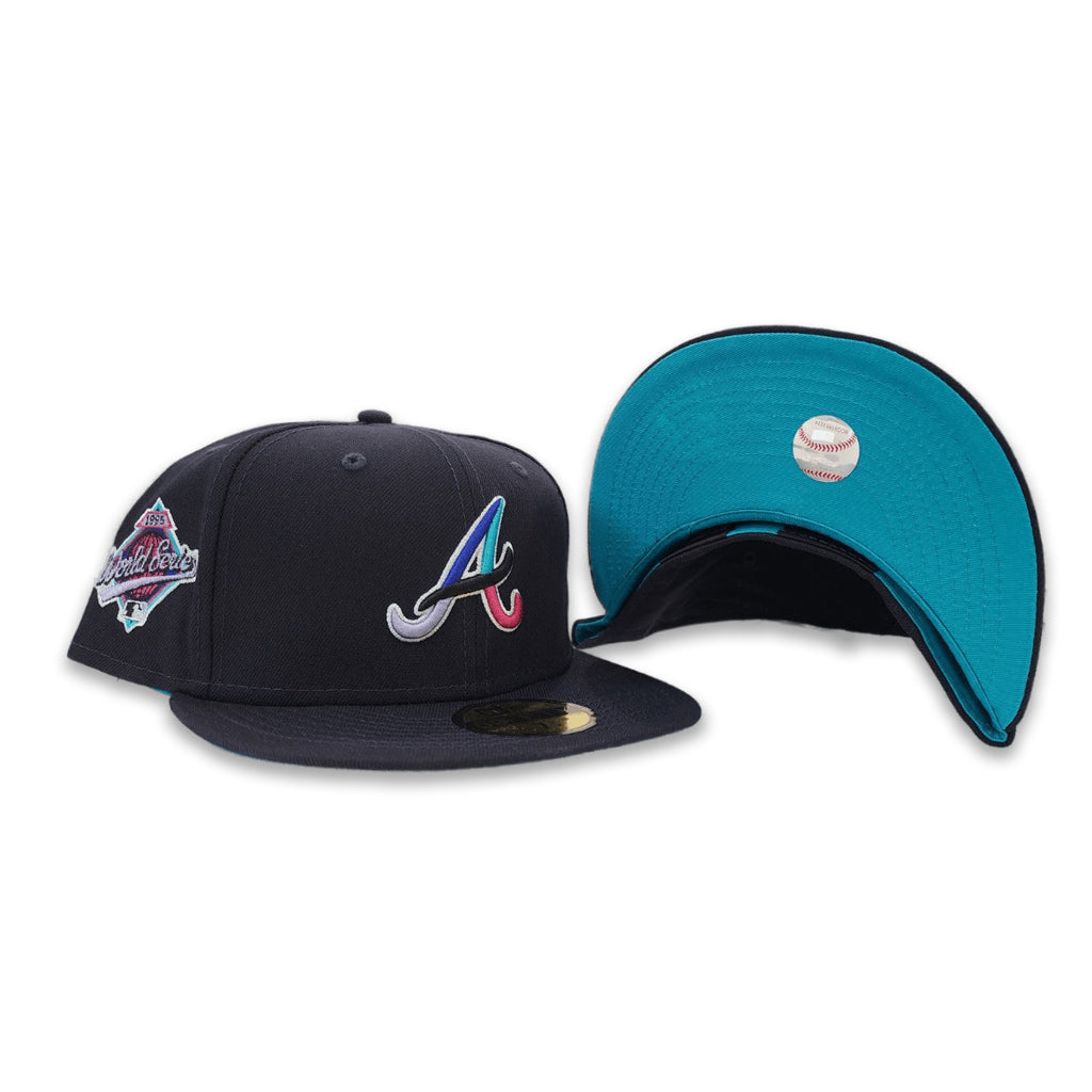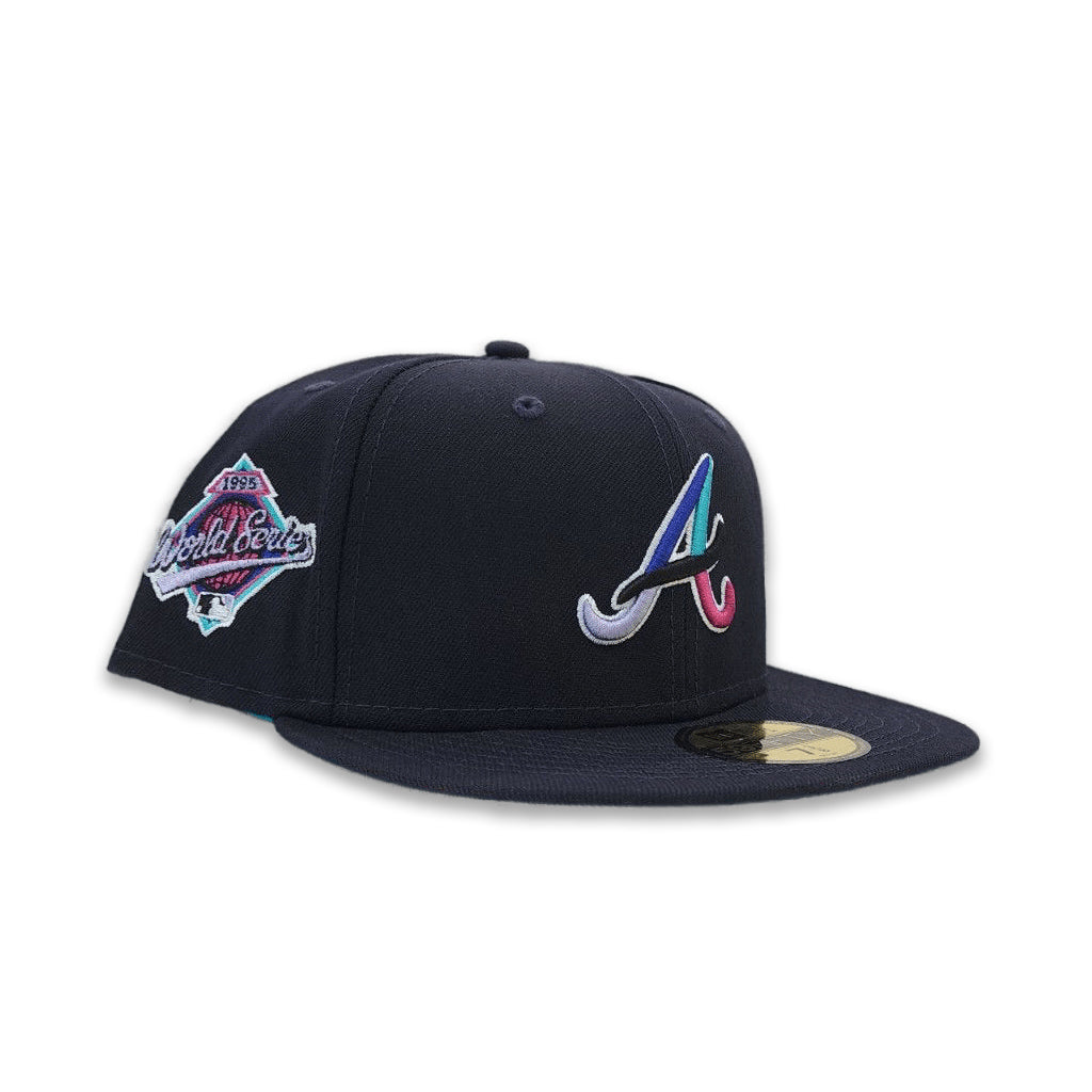 This New Era Polar Lights Navy Blue Atlanta Braves Turquoise Blue Bottom 1995 World Series Side Patch 59FIFTY Fitted Hat was released by Exclusive Fitted. The fitted has a navy blue six panel structured high crown and embroidered eyelets with a navy blue fabric squatchee button. The fitted cap also has a navy blue flat bill with a turquoise undervisor. The front panel features the Atlanta Braves logo embroidery and a 1995 World Series side patch embroidery on the right panel. The left panel of the fitted displays the New Era logo and the official MLB logo embroidery on the rear crown.