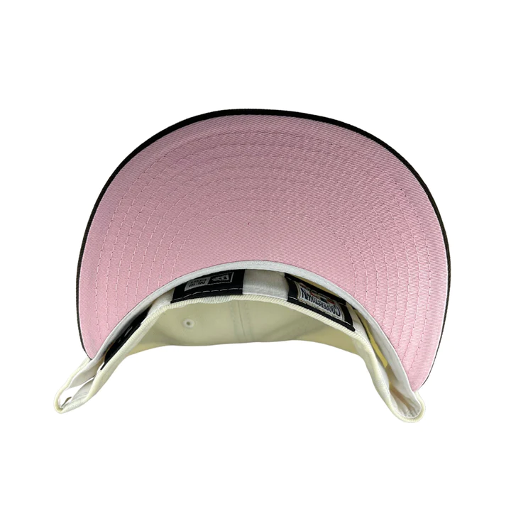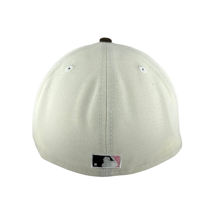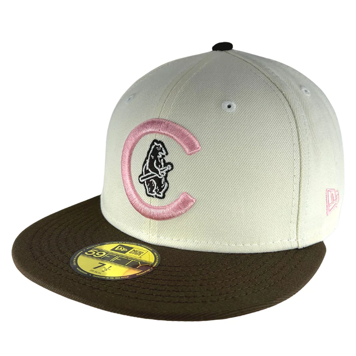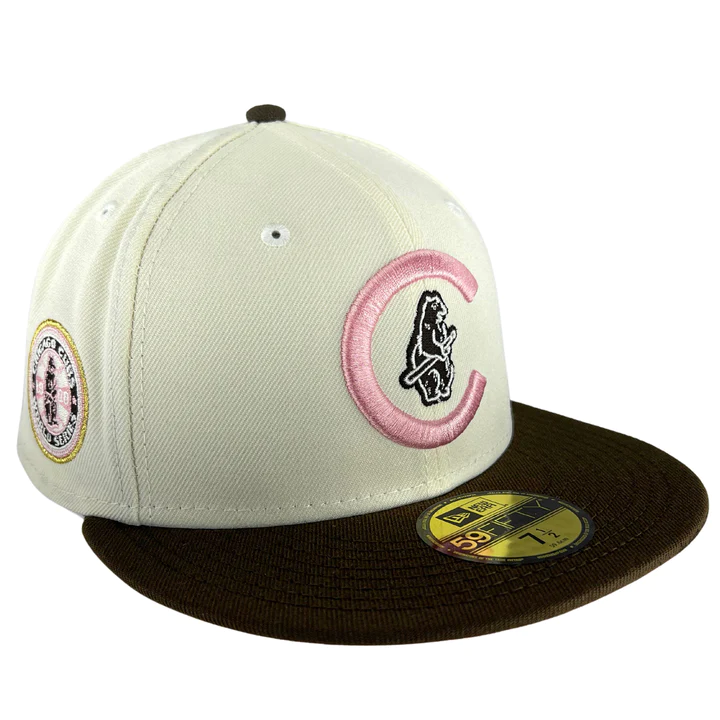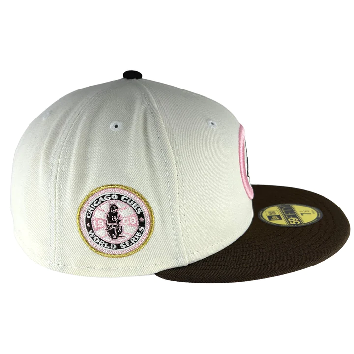 This New Era Chicago Cubs 1908 World Series Chrome/Walnut 59FIFTY Fitted Hat has a chrome six panel structured high crown and embroidered eyelets with a walnut brown fabric squatchee button. The fitted cap has a walnut brown flat bill with a pink undervisor. The front panel features the Chicago Cubs logo embroidery and a 1908 World Series side patch embroidery on the right panel. The left panel of the fitted displays the New Era logo and the official MLB logo embroidery on the rear crown.