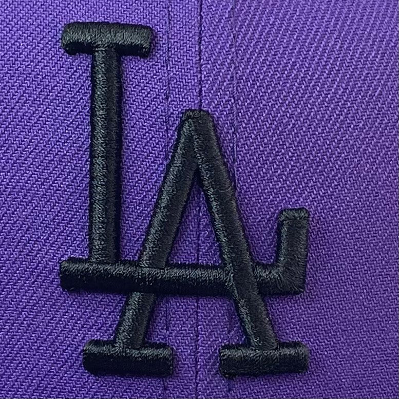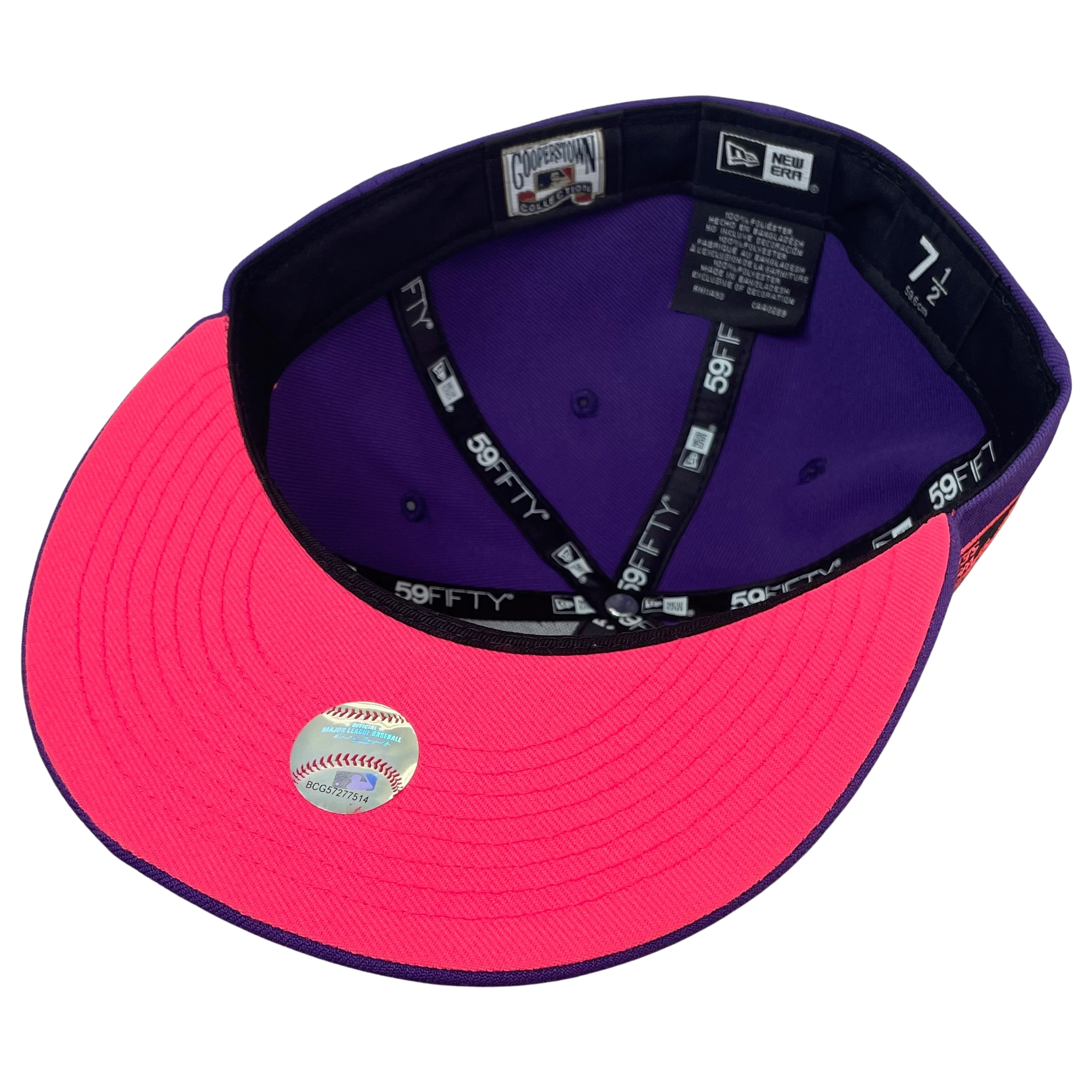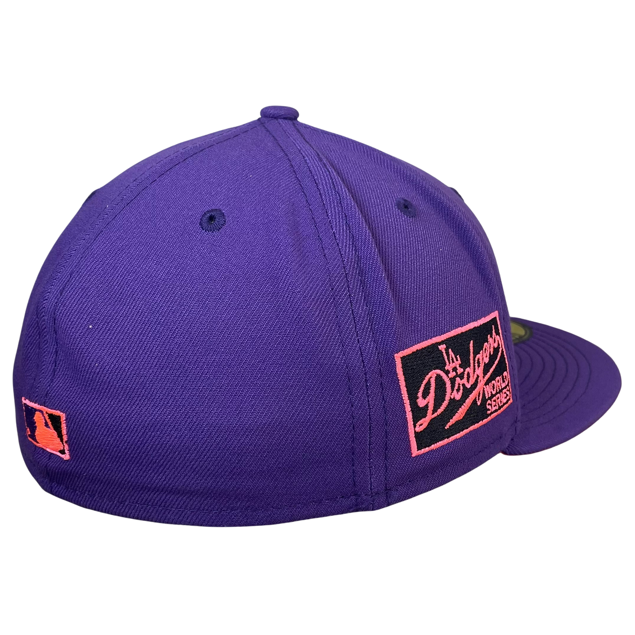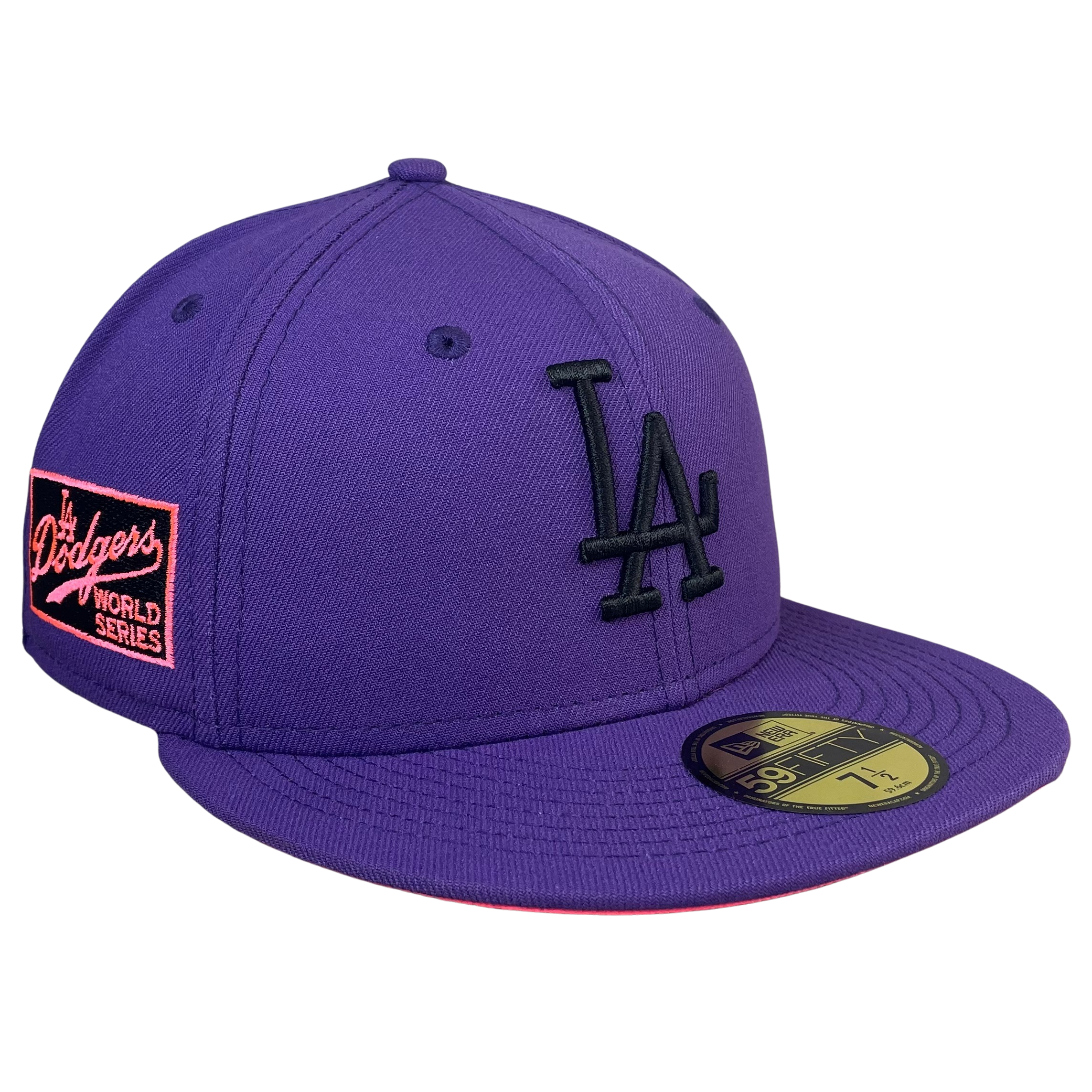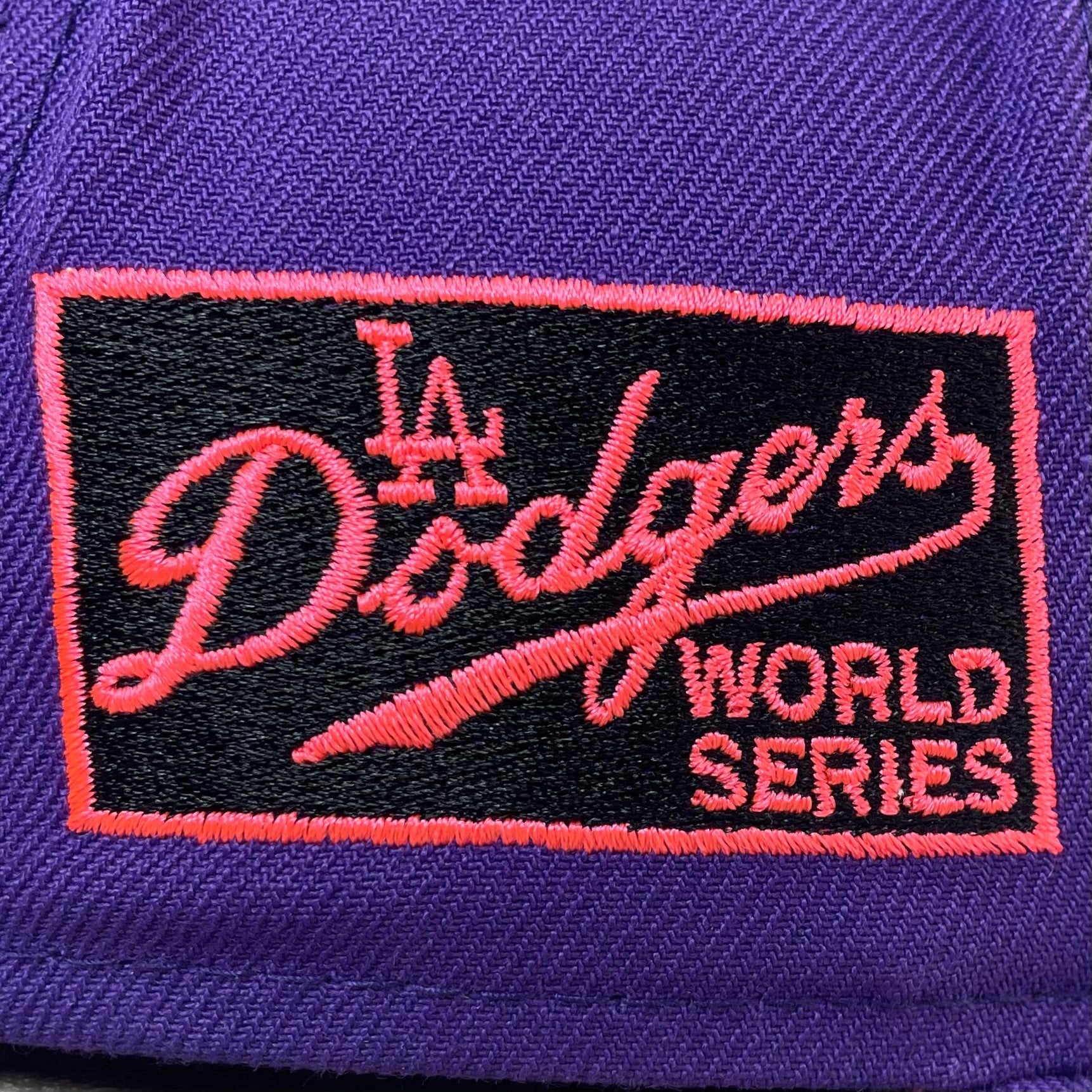 This New Era Los Angeles Dodgers Purple/Pink 1965 World Series 59FIFTY Fitted Hat has a purple six panel structured high crown and embroidered eyelets with a purple fabric squatchee button. The fitted cap has a purple flat bill with a hot pink undervisor. The front panel features the Los Angeles Dodgers logo embroidery and a 1965 World Series side patch embroidery on the right panel. The left panel of the fitted displays the New Era logo and the official MLB logo embroidery on the rear crown.