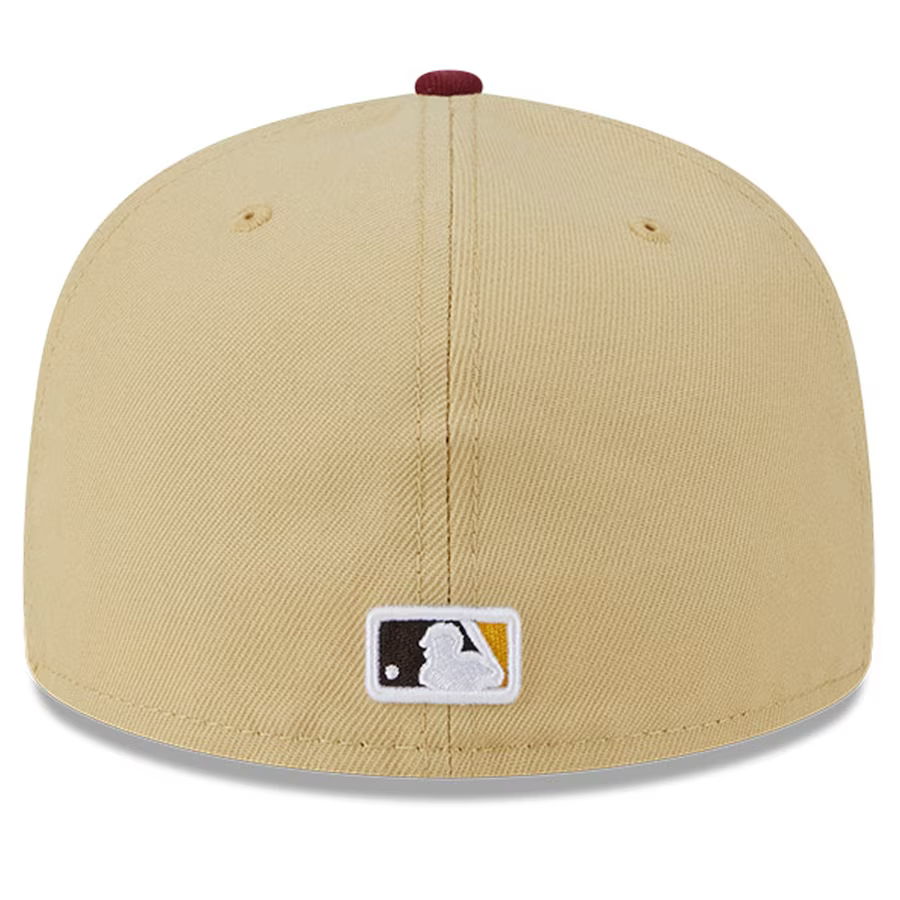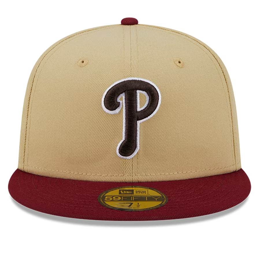 Add a distinctive touch to your team spirit with the Philadelphia Phillies Vegas Gold and Cardinal 59FIFTY hat by New Era. This hat showcases a raised embroidered team logo on the front crown and a patch on the right side panel. With its structured build, this fitted cap offers a secure and comfortable fit, making it ideal for all-day wear while cheering on the Philadelphia Phillies.