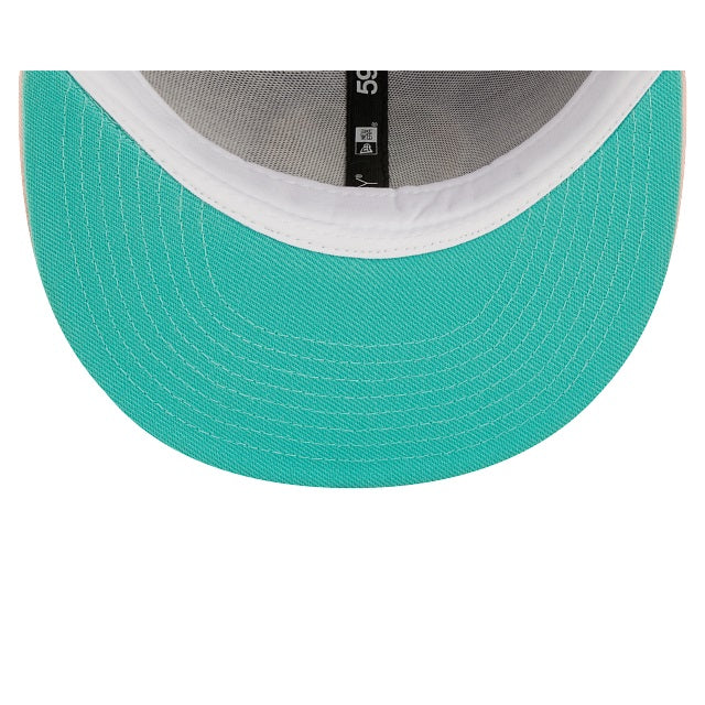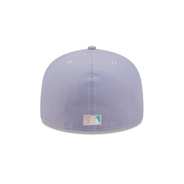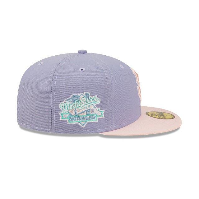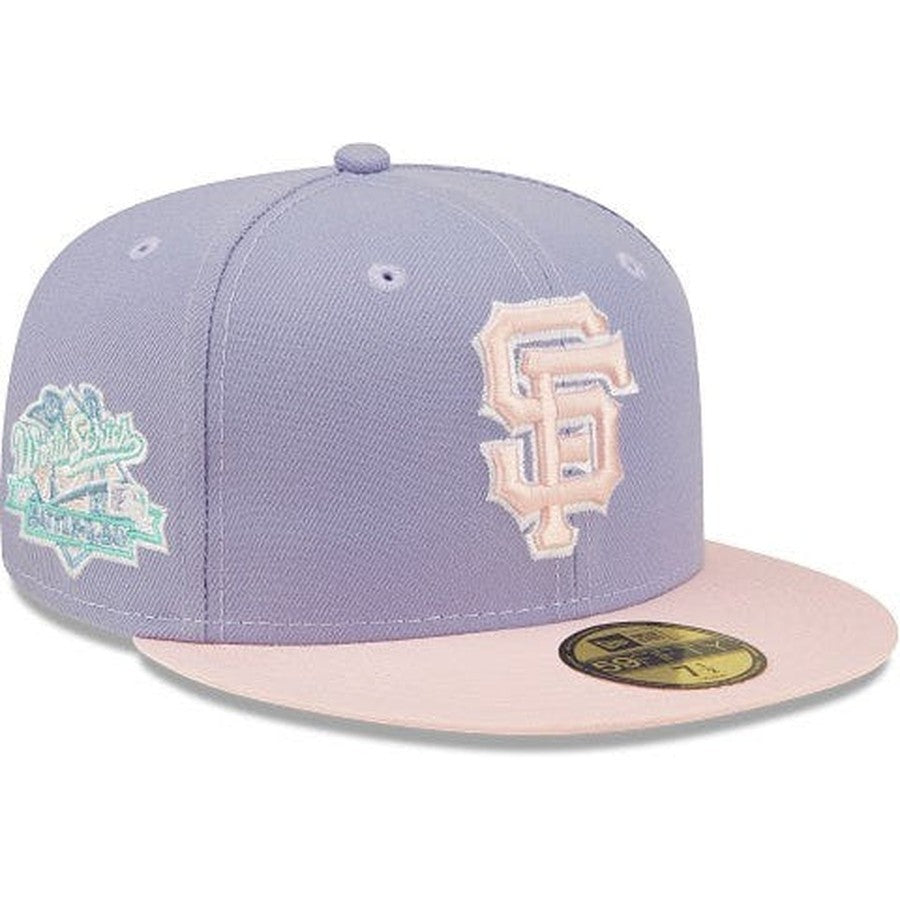 This San Francisco Giants fitted hat was released by Burdeens Chicago. The fitted has a lavender six panel structured high crown and embroidered eyelets with a lavender fabric squatchee button. The flat bill of the cap is soft pink with a teal undervisor and white sweatband. The front panel features the San Francisco Giants logo embroidery and a 1989 World Series side patch embroidery on the right panel. The left panel of the fitted displays the New Era logo and the official MLB Batterman logo embroidery on the rear crown.