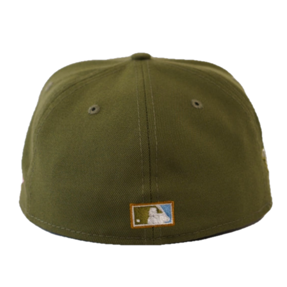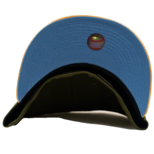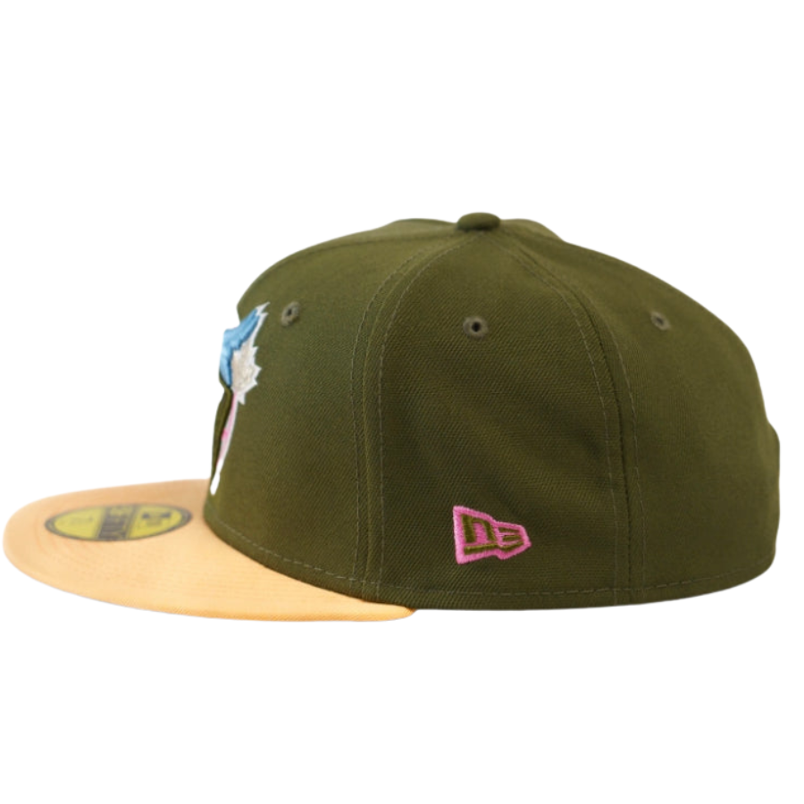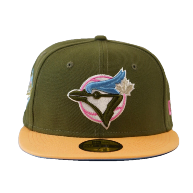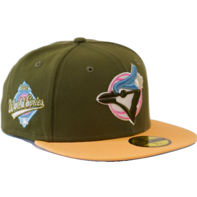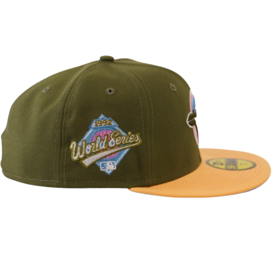 This New Era Toronto Blue Jays Olive Green 1992 World Series Blue UV 59FIFTY Fitted Hat was released by Energie. The fitted has a six panel structured high crown and embroidered eyelets with a fabric squatchee button. The fitted cap has a flat bill with a undervisor and sweatband. The front panel features the Toronto Blue Jays logo embroidery. The left panel of the fitted displays the New Era logo and the official MLB logo embroidery on the rear crown.