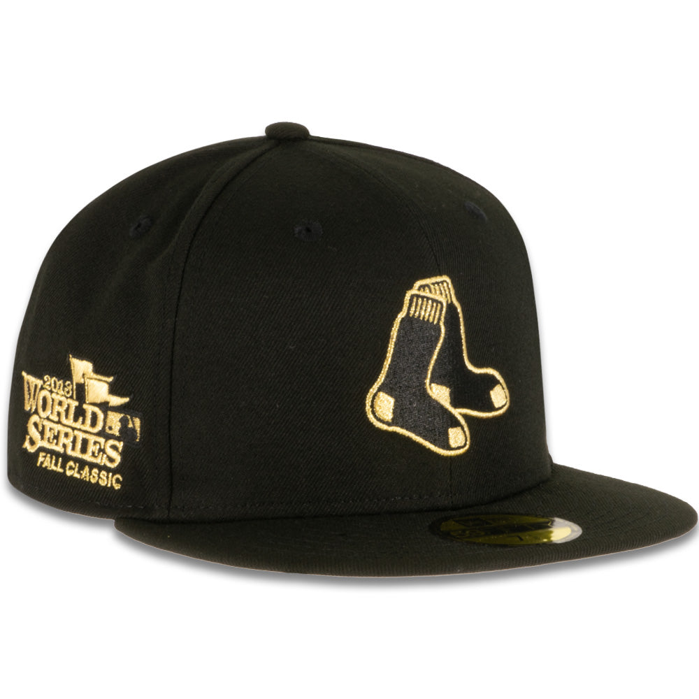 This Boston Red Sox fitted hat was released by Just Sports. The fitted has a black six panel structured high crown and embroidered eyelets with a black fabric squatchee button. The flat bill of the cap is black. The front panel features a gold embroidered Boston Red Sox logo embroidery and a side patch embroidery on the right panel. The left panel of the fitted displays the New Era logo and the official MLB Batterman logo embroidery on the rear crown.