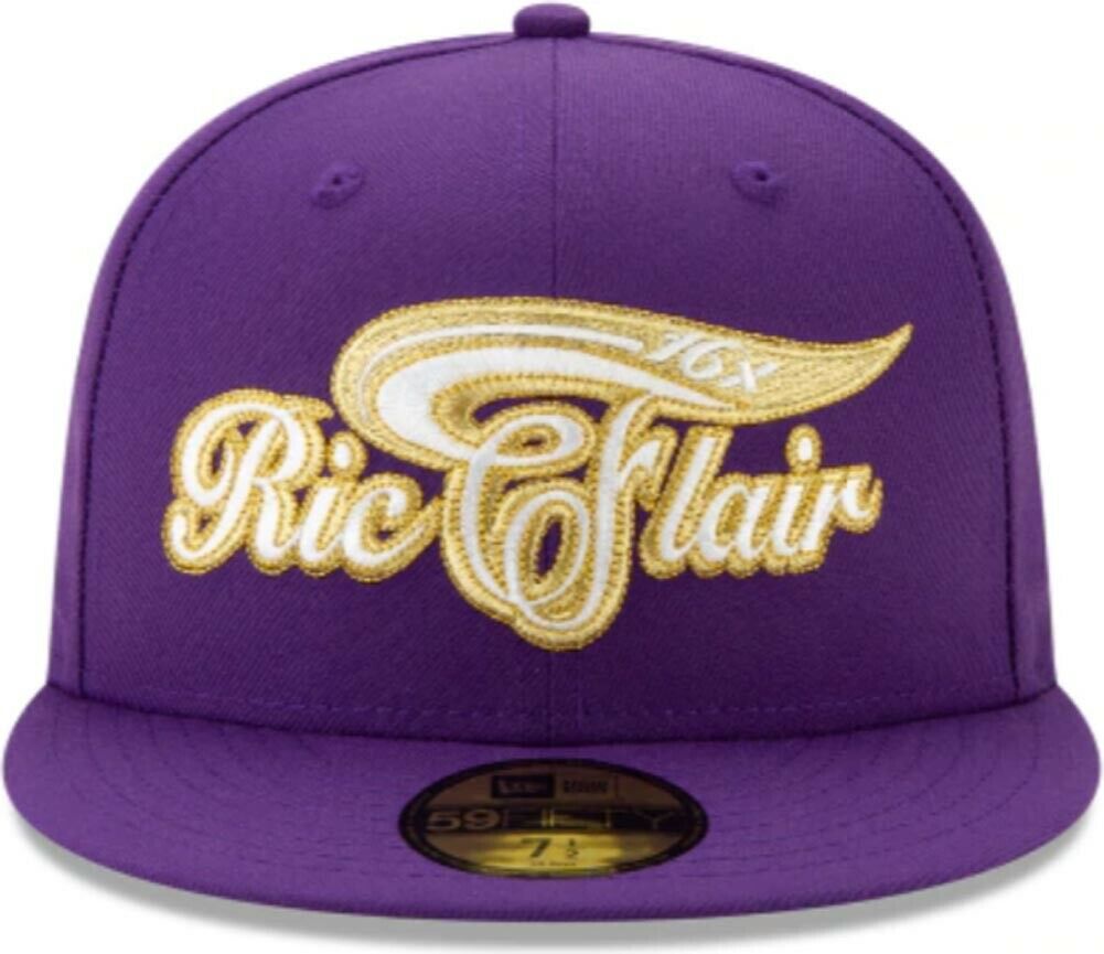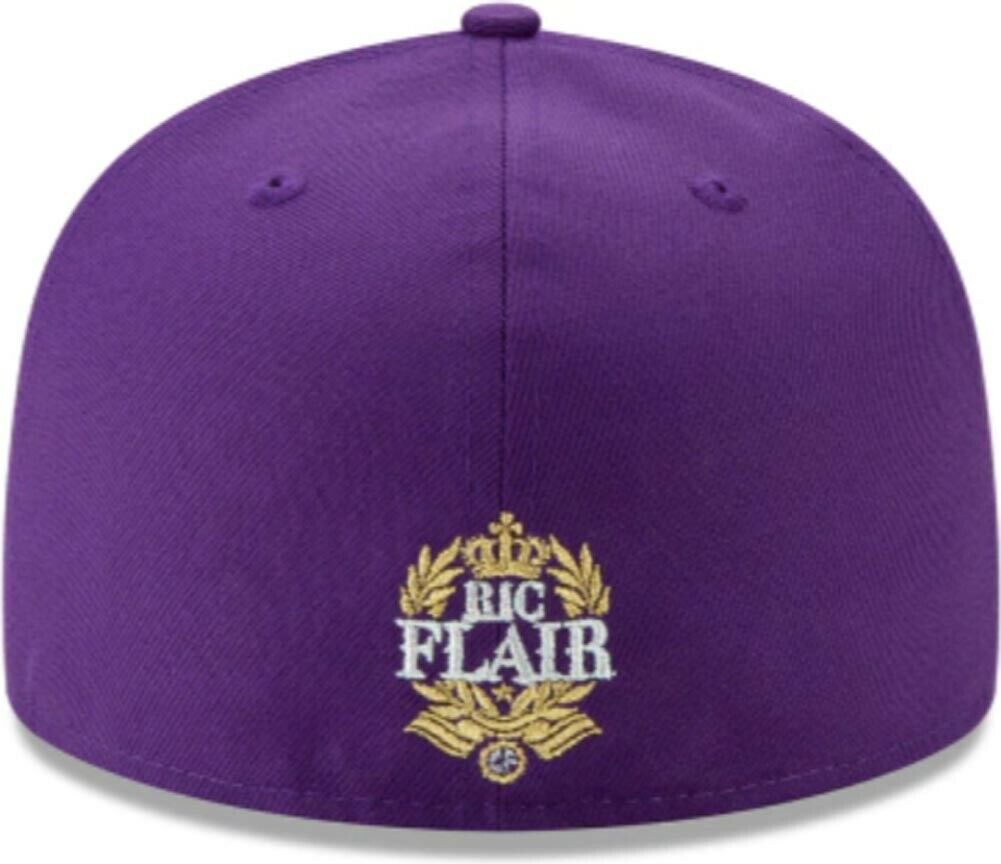 The New Era Ric Flair 16x Champion fitted hat has a purple and gold colorway. The six panel structured high crown and embroidered eyelets are solid purple. The fabric squatchee button and flat bill of the cap is also purple. The front panel of the fitted features the former pro wrestler Ric "Nature Boy" Flair and 16x script embroidered in white and gold threads. The back of the high crown features Ric Flair's logo.