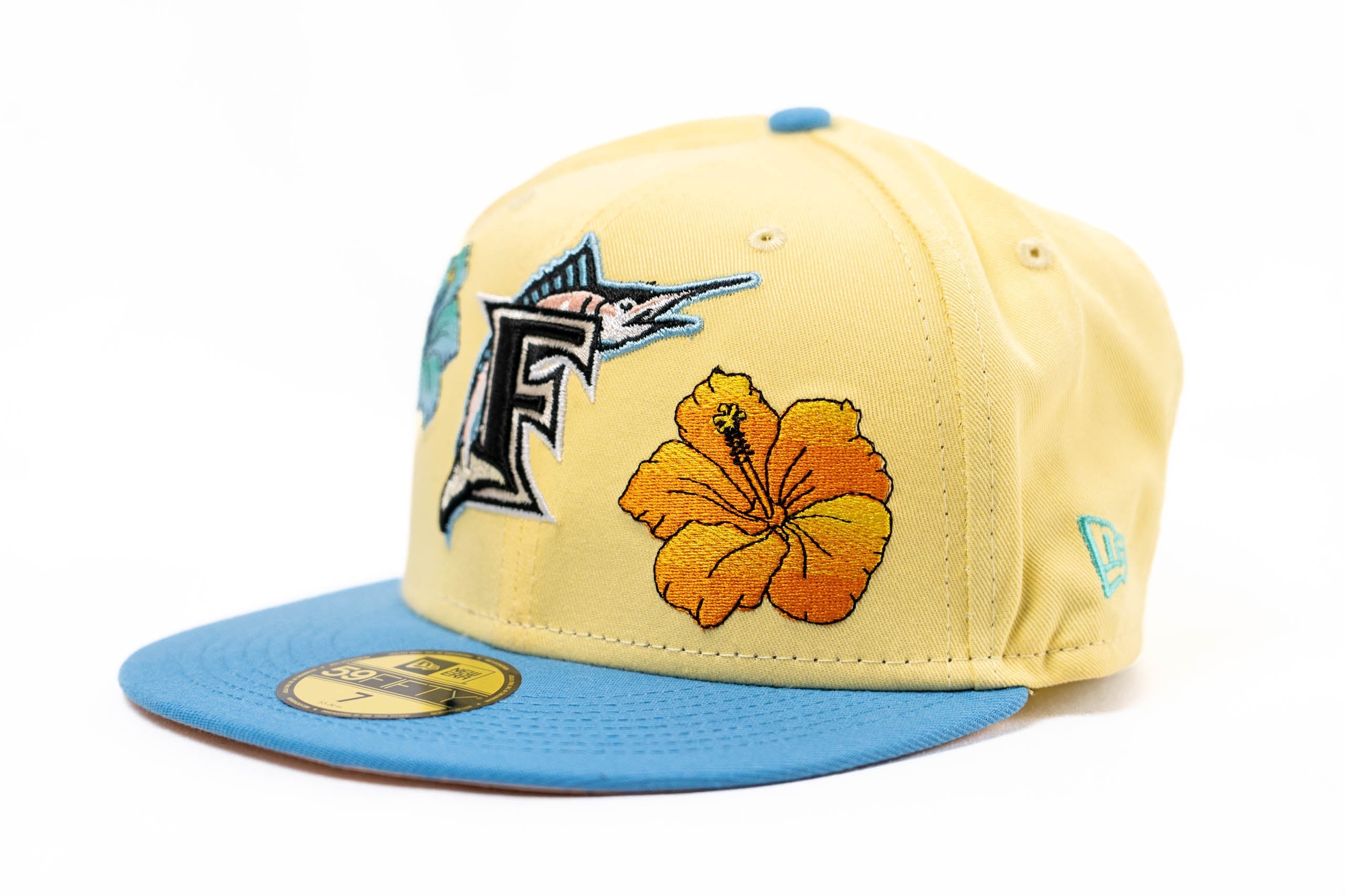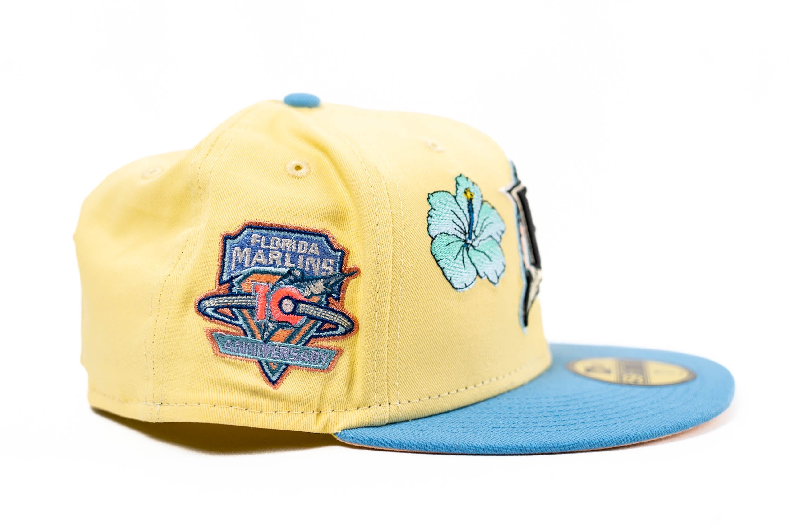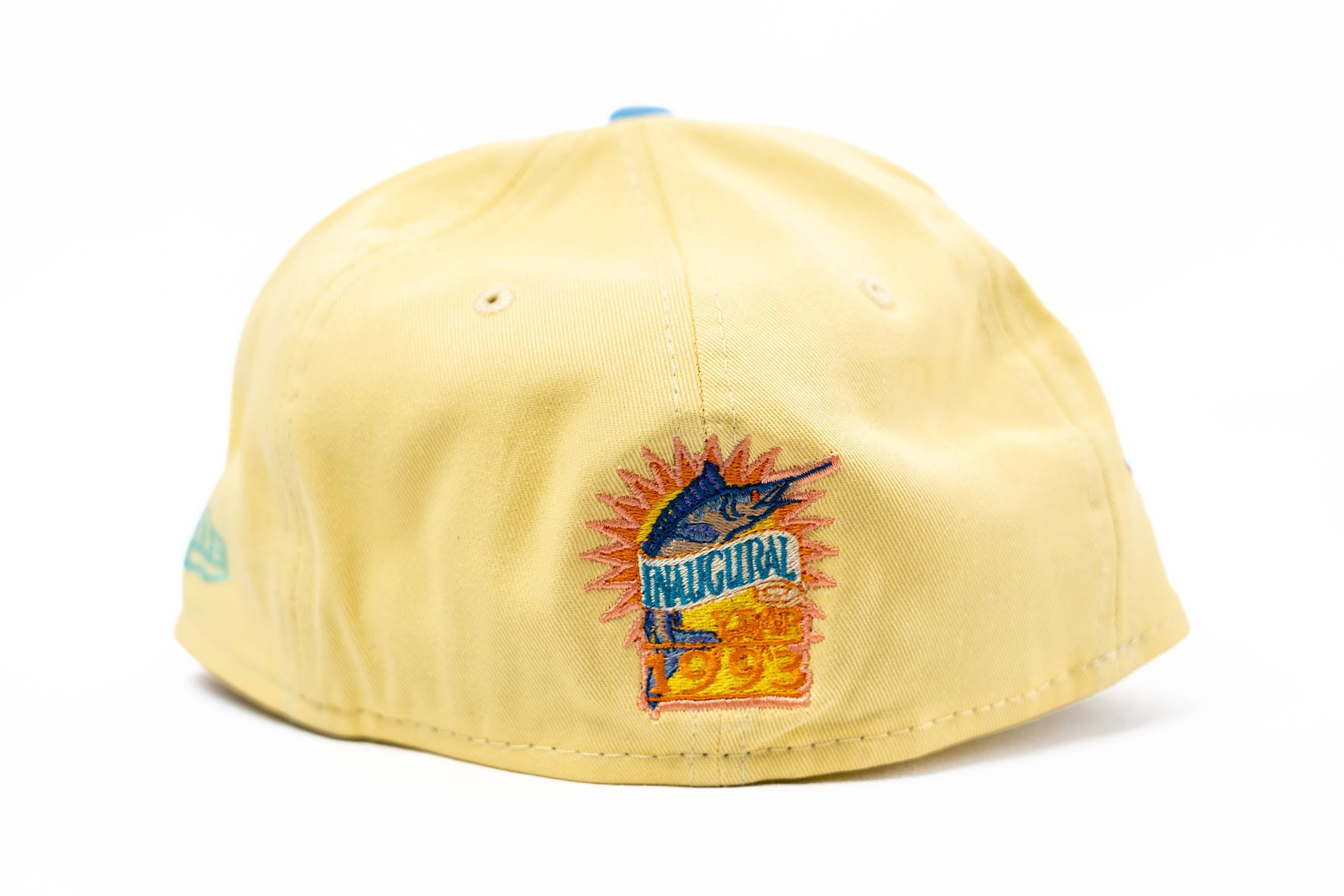 This New Era Florida Marlins Soft yellow/Peach 19th Anniversary 59FIFTY Fitted Hat was released by Energie. The fitted has a six panel structured high crown and embroidered eyelets with a fabric squatchee button. The fitted cap has a flat bill with a undervisor and sweatband. The front panel features the Florida Marlins logo embroidery. The left panel of the fitted displays the New Era logo and the official MLB logo embroidery on the rear crown.