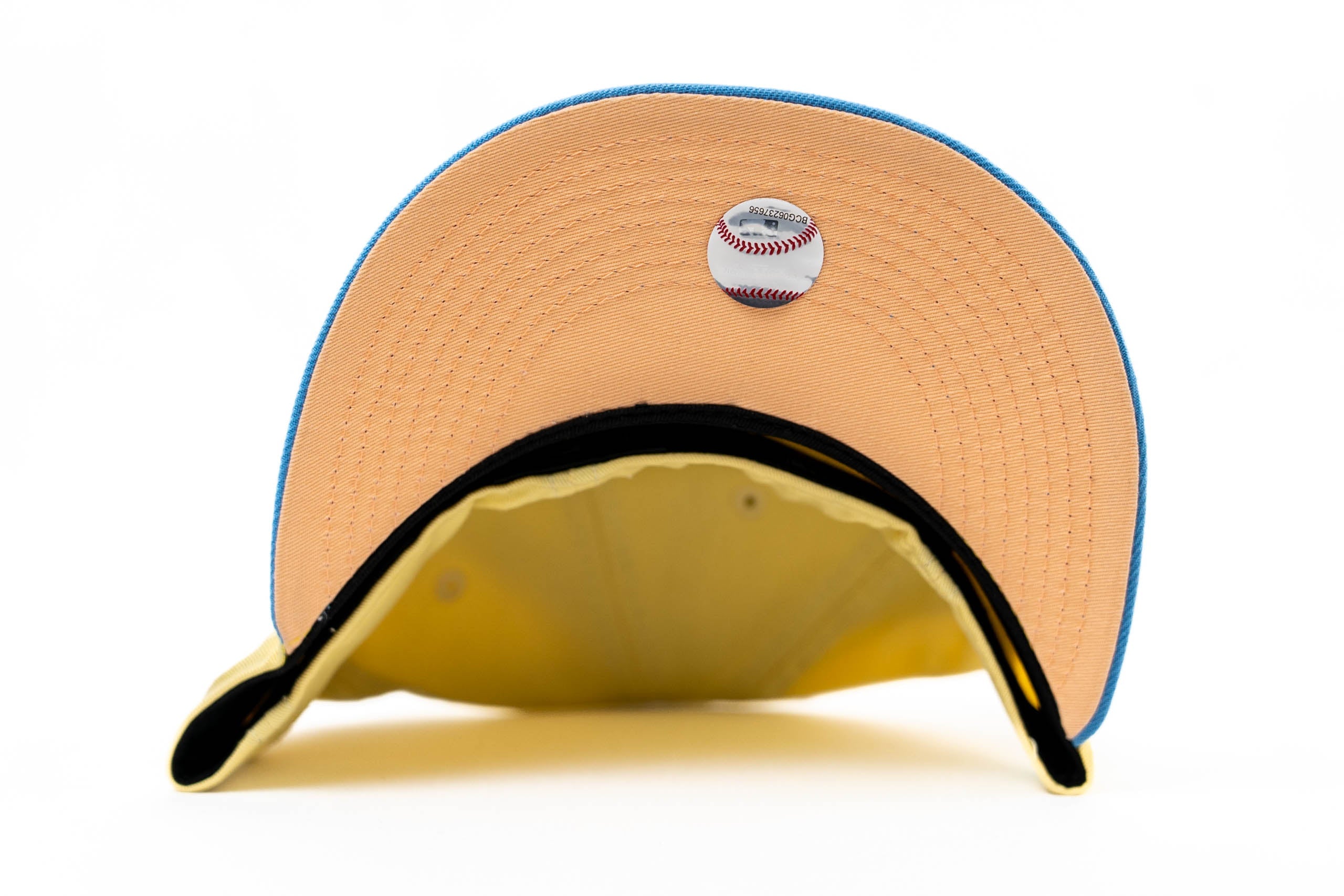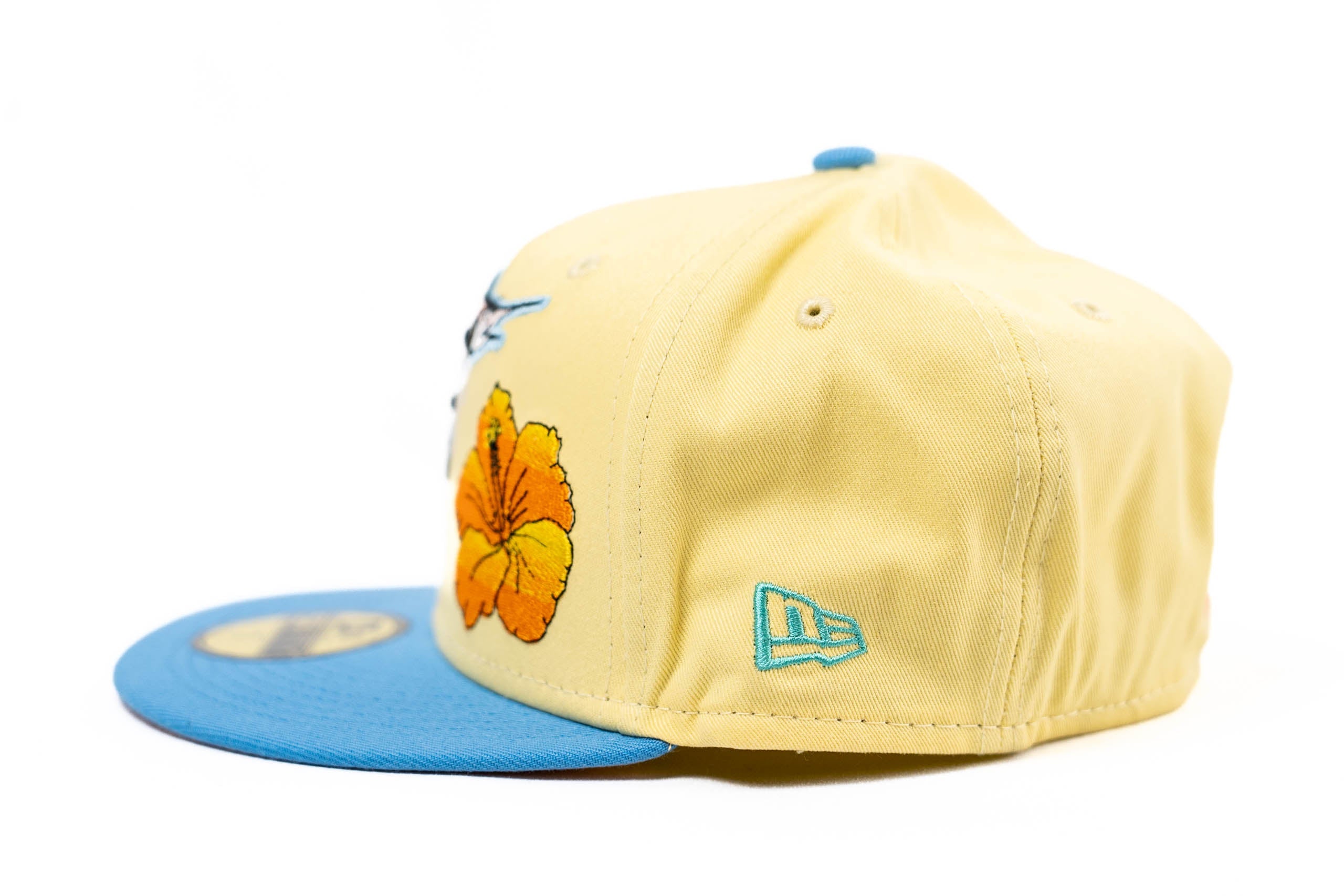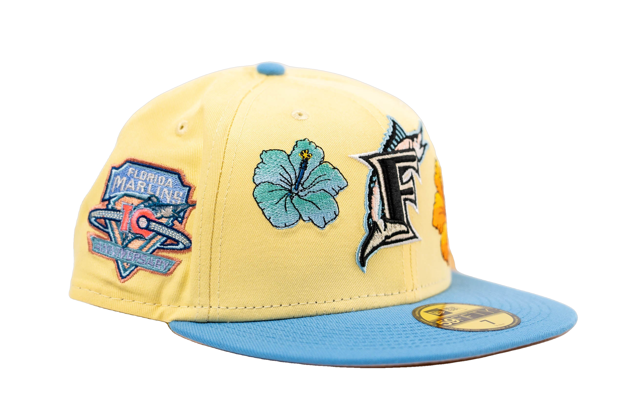 This New Era Florida Marlins Soft yellow/Peach 19th Anniversary 59FIFTY Fitted Hat was released by Energie. The fitted has a six panel structured high crown and embroidered eyelets with a fabric squatchee button. The fitted cap has a flat bill with a undervisor and sweatband. The front panel features the Florida Marlins logo embroidery. The left panel of the fitted displays the New Era logo and the official MLB logo embroidery on the rear crown.