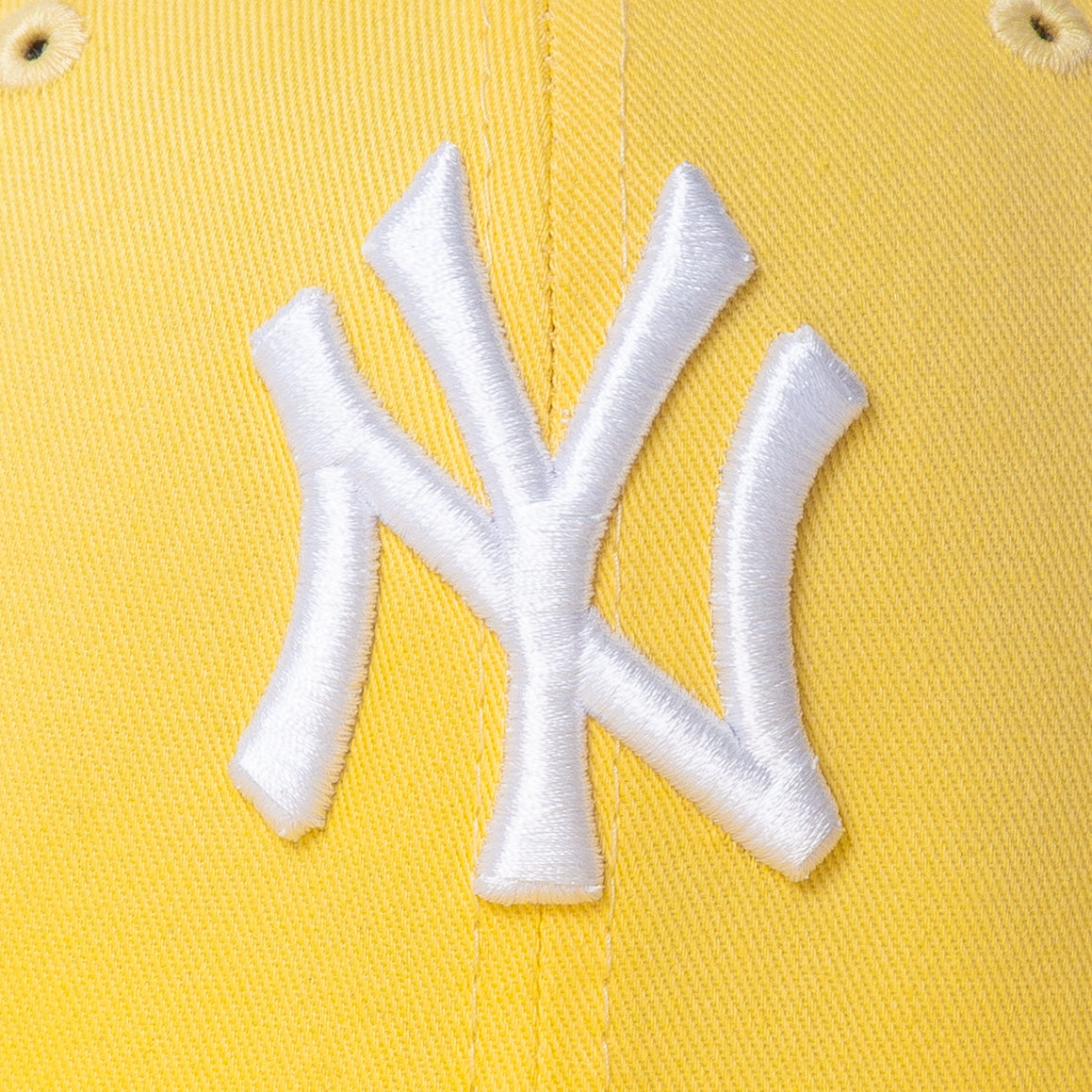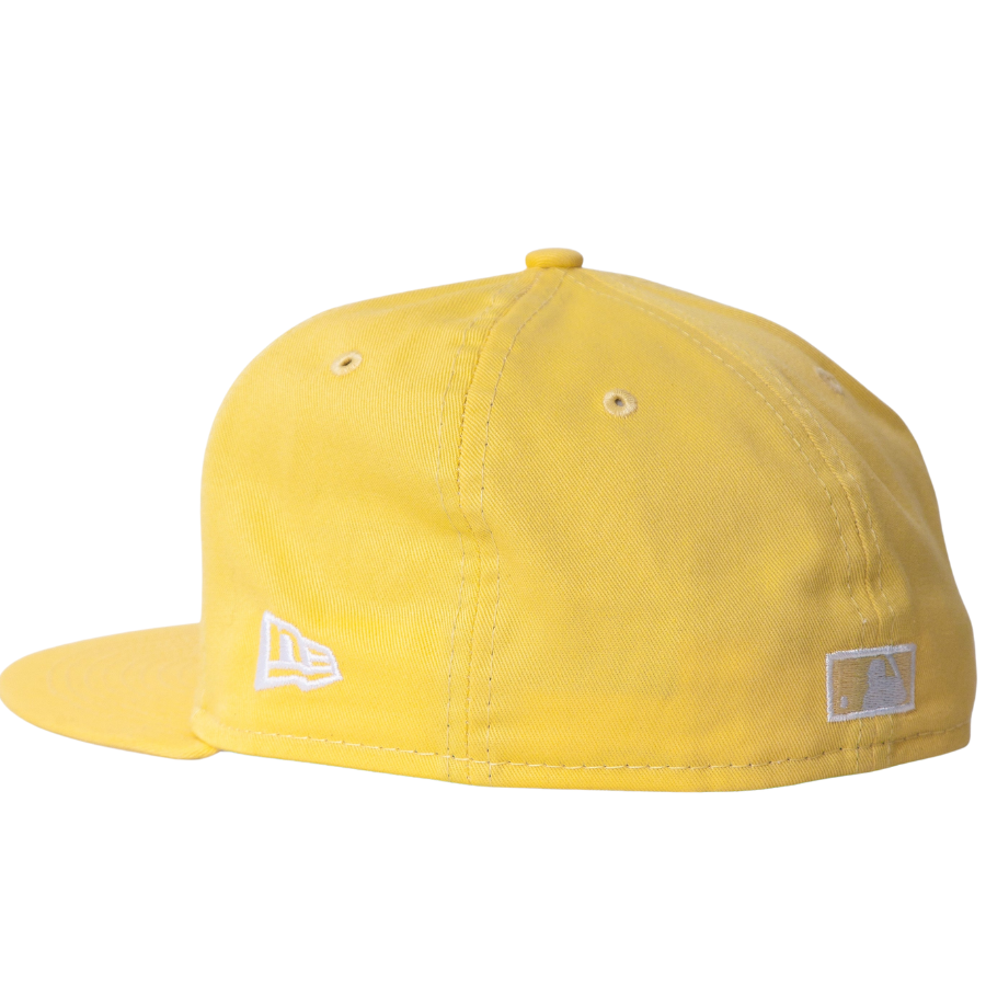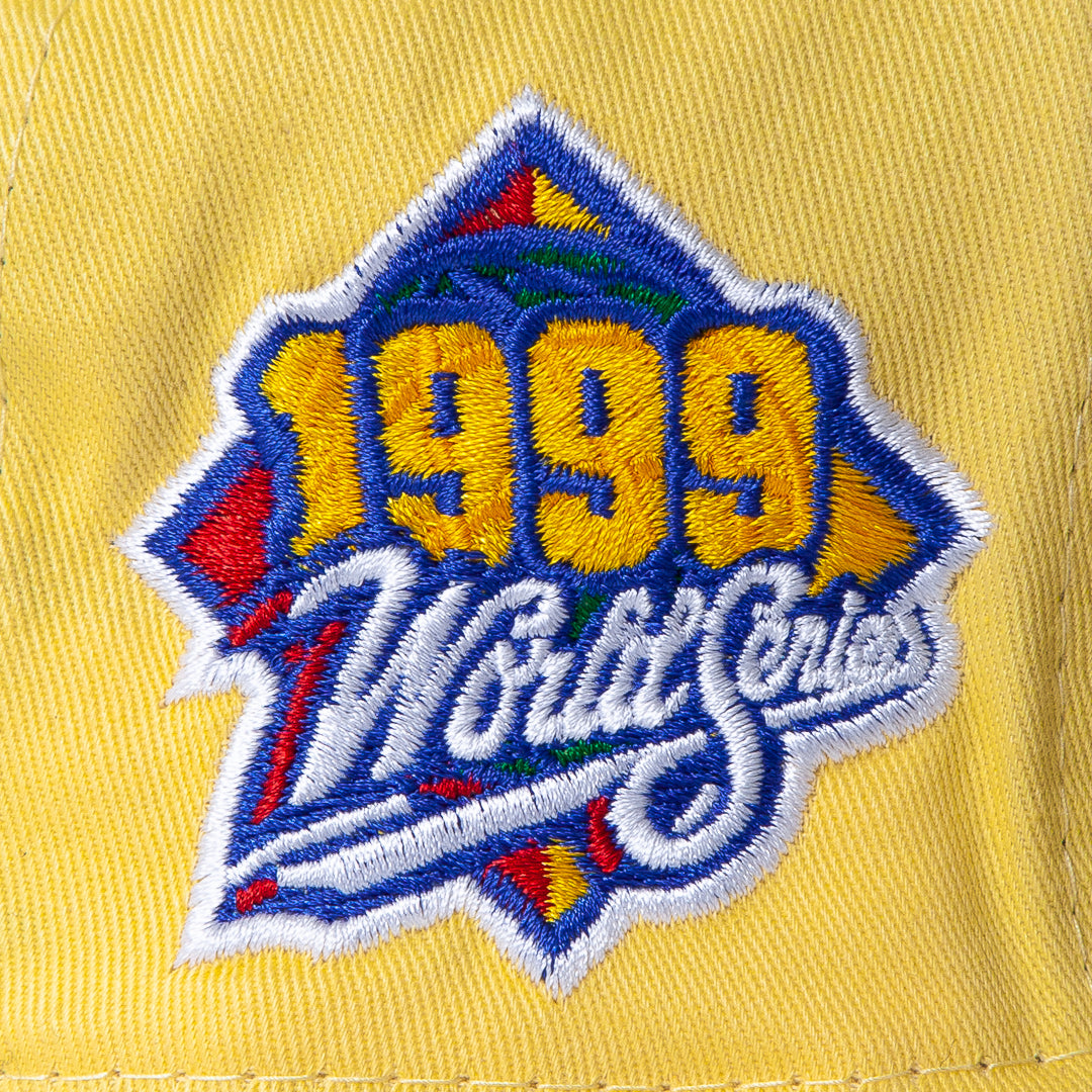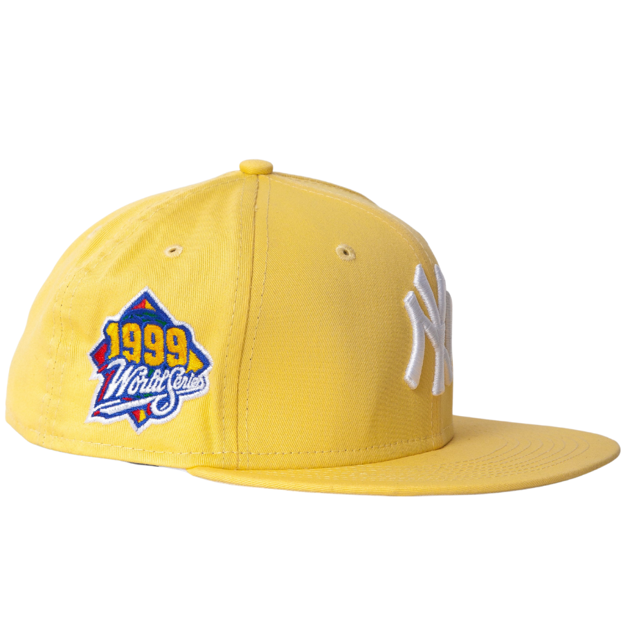 This New York Yankees fitted hat was released by Nohble. The fitted has a yellow six panel structured high crown and embroidered eyelets, a yellow fabric squatchee button and flat bill with a gray undervisor and white sweatband. The front panel features a white stitched New York Yankees logo embroidery and a 1999 World Series side patch on the right panel. The left panel of the fitted displays the New Era "Fly Your Own Flag" logo and the official MLB Batterman embroidery on the rear crown.