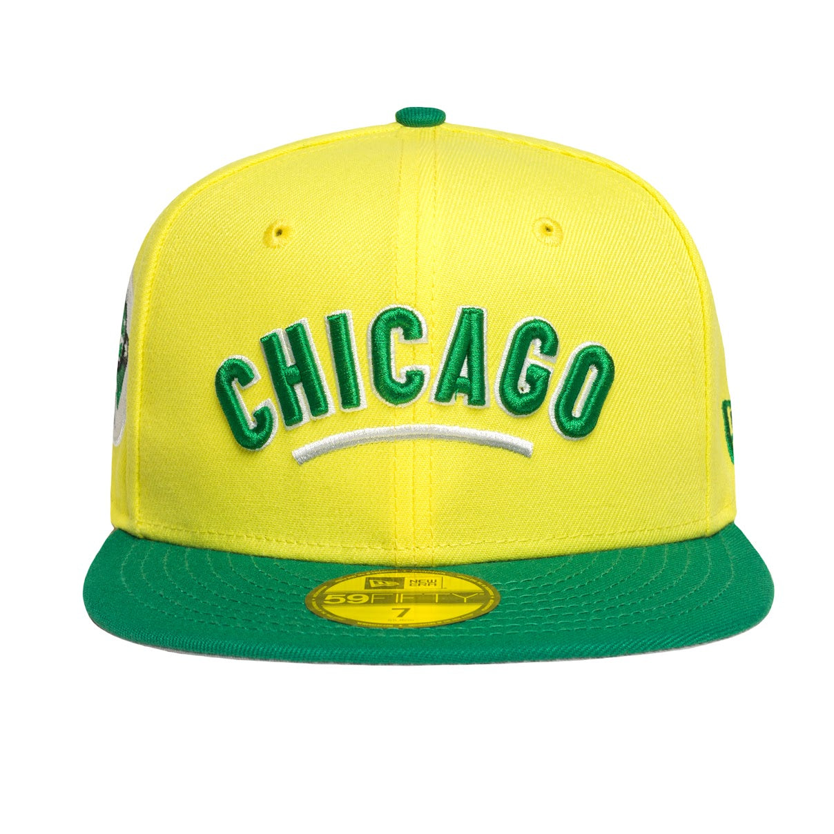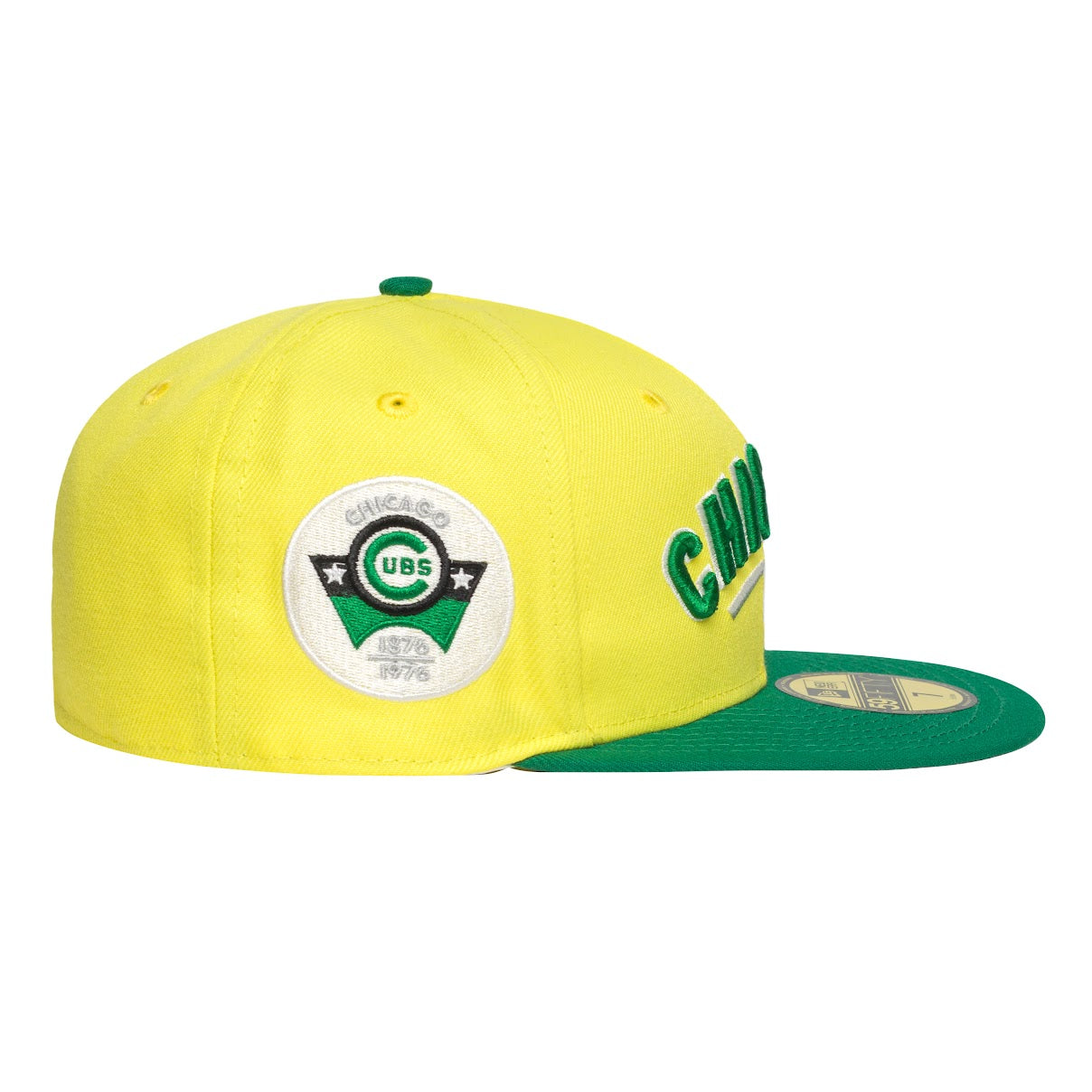 This New Era x Leaders 1354 Chicago Cubs "Key Lime Pie" 1876-1976 59FIFTY Fitted Hat has a yellow six panel structured high crown and embroidered eyelets with a green fabric squatchee button. The fitted cap has a green flat bill. The front panel features the Chicago Cubs logo embroidery and a 1876-1976 100 year side patch embroidery on the right panel. The left panel of the fitted displays the New Era logo and the official MLB logo embroidery on the rear crown.