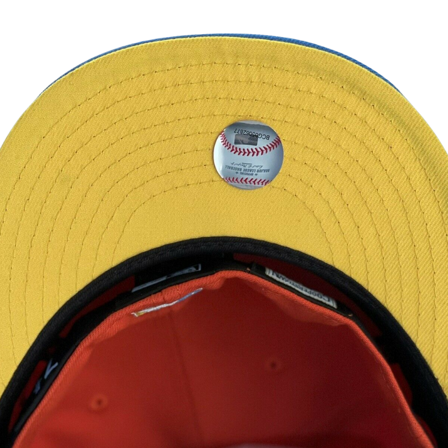 This Boston Red Sox "Bart Simpson" inspired fitted hat is a Sneaker Town exclusive release. The six panel structured high crown and embroidered eyelets are orange with a yellow fabric squatchee button. The flat bill of the fitted is sky blue with a yellow undervisor and black sweatband. The front panel features the Boston Red Sox logo embroidered in yellow thread outlined in white thread with a '99 All-Star Game side patch embroidered on the right panel. The colorway was inspired by Bart Simpson, a character from The Simpsons.