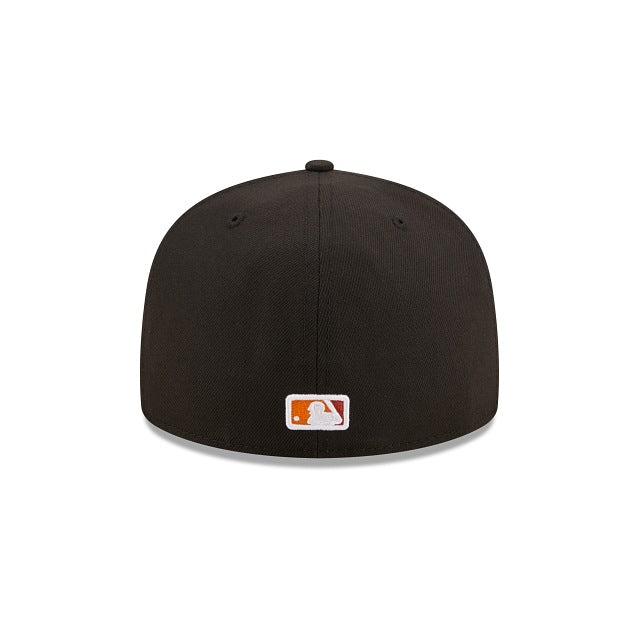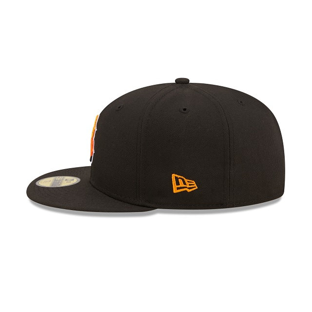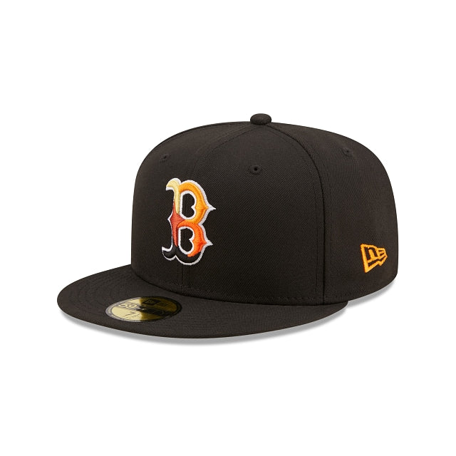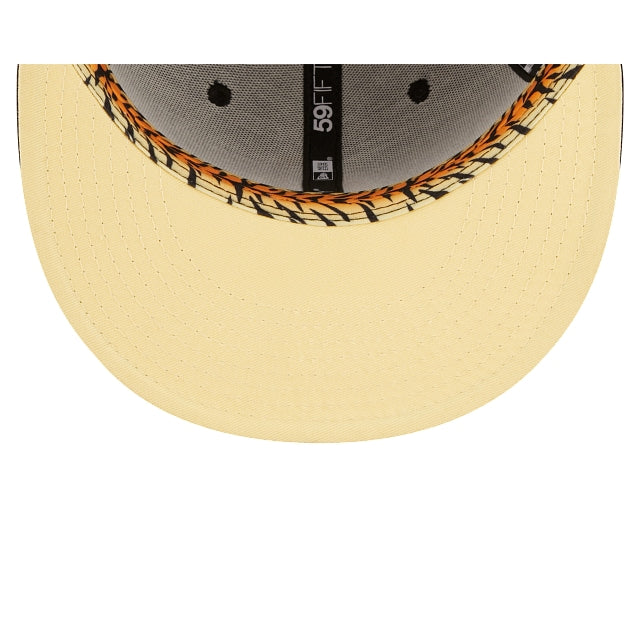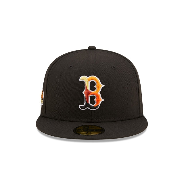 The Boston Red Sox Jungle 59FIFTY Fitted Cap features an embroidered Red Sox multi-colored logo at the front panels, a 2004 World Series patch at the right-wear side, and a matching MLB Batterman logo at the rear. Additional details include a tiger inspired striped inner sweatband and yellow undervisor.