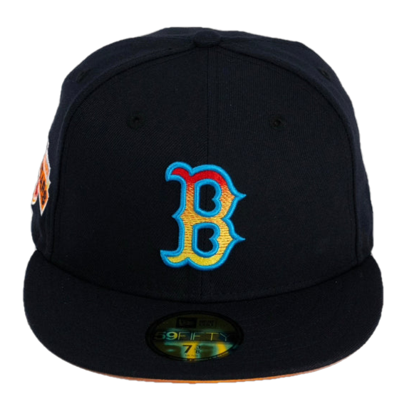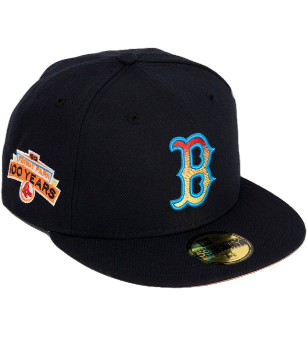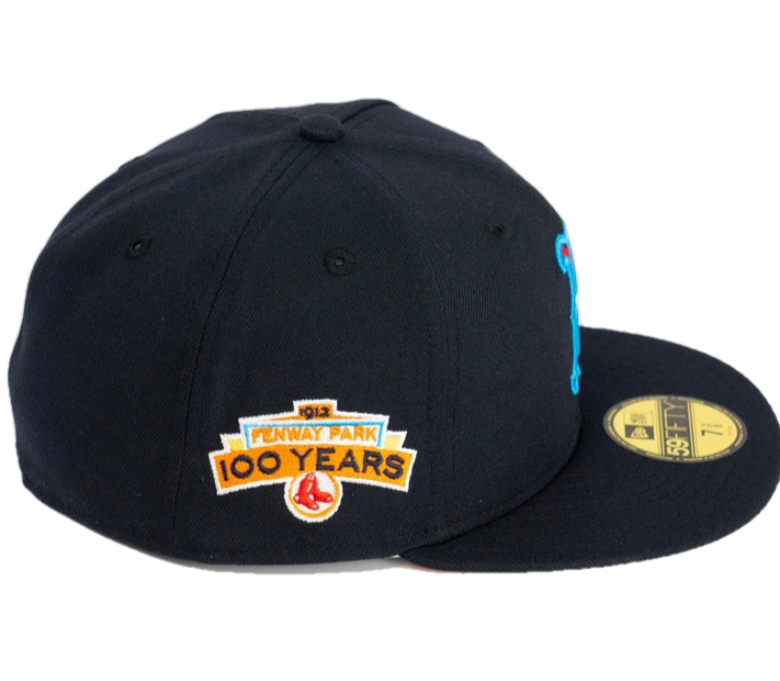 This New Era Boston Red Sox "Movie Pack" 100 Years Fenway Park 59FIFTY Fitted Hat was released by Energie. The fitted has a six panel structured high crown and embroidered eyelets with a fabric squatchee button. The fitted cap has a flat bill with a undervisor and sweatband. The front panel features the Boston Red Sox logo embroidery. The left panel of the fitted displays the New Era logo and the official MLB logo embroidery on the rear crown.