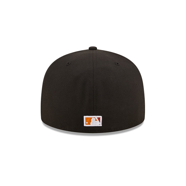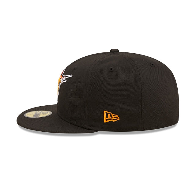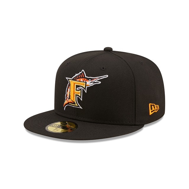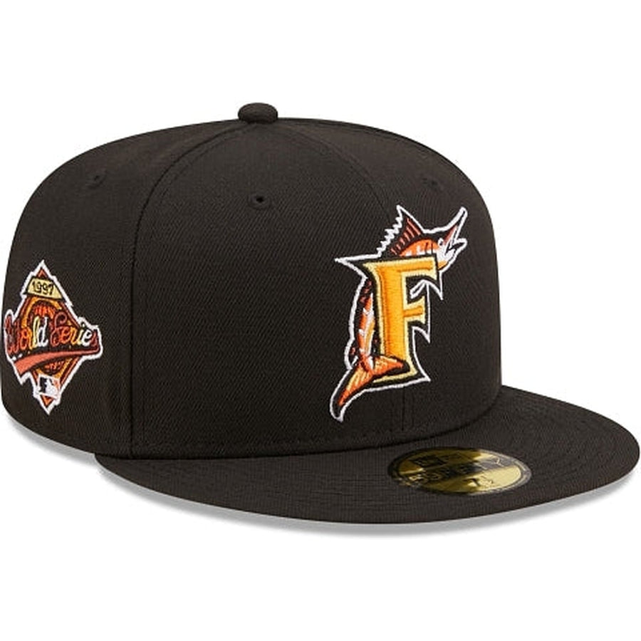 The Florida Marlins Jungle 59FIFTY Fitted Cap features an embroidered Marlins multi-colored logo at the front panels, a 1997 World Series patch at the right-wear side, and a matching MLB Batterman logo at the rear. Additional details include a tiger inspired striped inner sweatband and yellow undervisor.