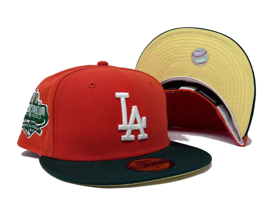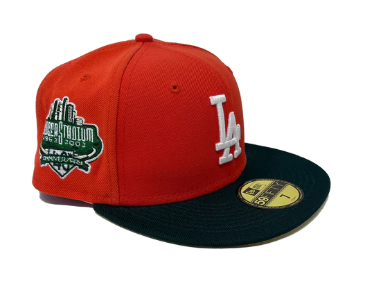 This New Era Los Angeles Dodgers 59FIFTY fitted hat was released by Sports World 165. The fitted features an orange six panel construction with a black fabric squatchee button and flat bill. The fitted has a soft yellow undervisor and white sweatband. The front panel include the LA Dodgers logo embroidery and a 40th Anniversary side patch on the right panel.