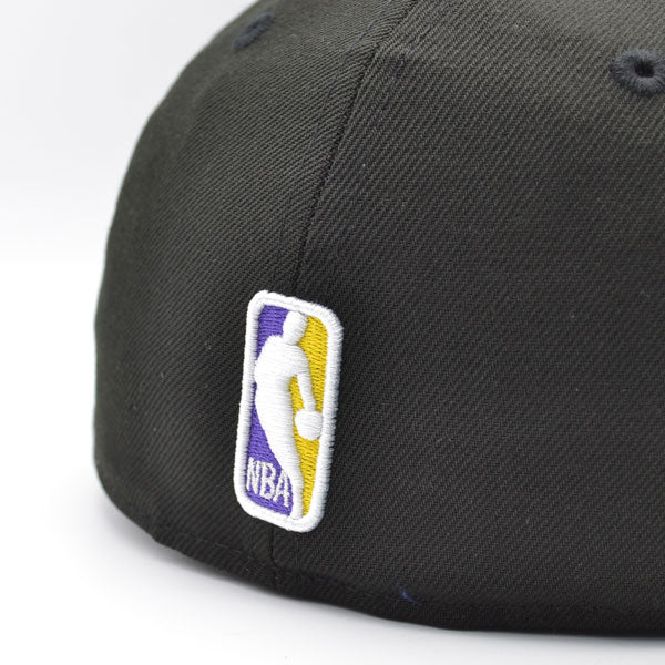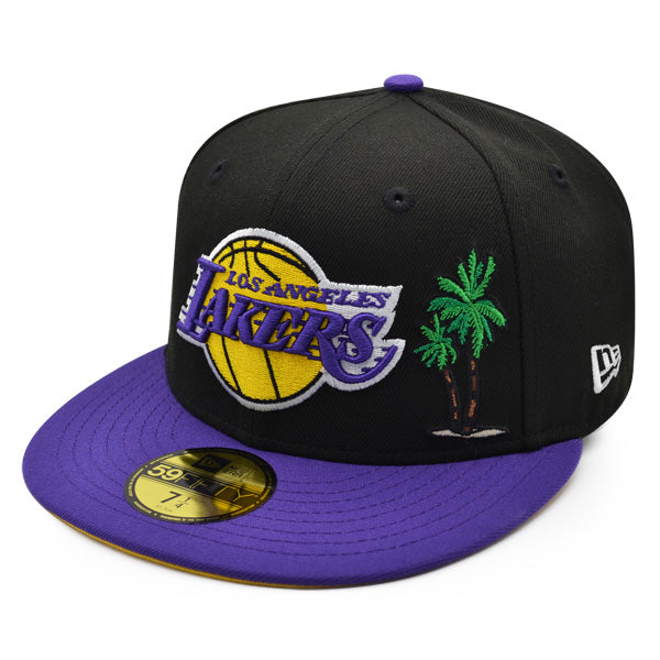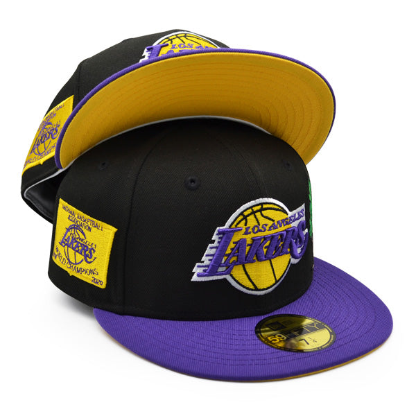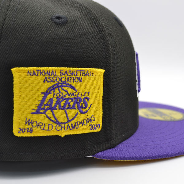 This New Era Los Angeles Lakers 2020 World Champions Black/Purple/Yellow UV 59FIFTY Fitted Hat has a black six panel structured high crown and embroidered eyelets with a purple fabric squatchee button. The fitted cap has a purple flat bill with a yellow undervisor. The front panel features the Los Angeles Lakers logo embroidery and a 2020 World Champions side patch embroidery on the right panel. The left panel of the fitted displays the New Era logo and the official NBA logo embroidery on the rear crown.