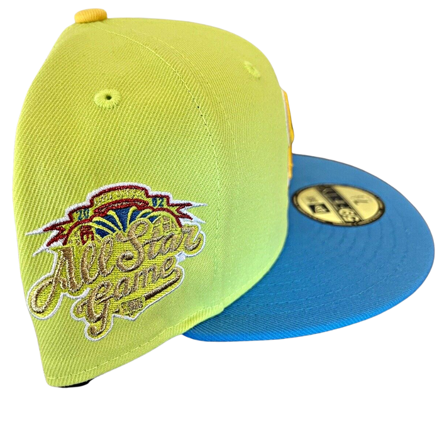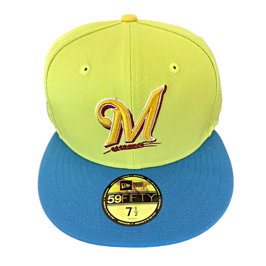 This Milwaukee Brewers "Marge Simpson" inspired fitted hat is a Sneaker Town exclusive release. The six panel structured high crown, embroidered eyelets and fabric squatchee button are yellow. The flat bill of the fitted is sky blue with a yellow undervisor and black sweatband. The front panel features the Milwaukee Brewers logo embroidery and a 2002 All-Star Game side patch embroidered on the right panel. The colorway was inspired by Marge Simpson, a character from The Simpsons.