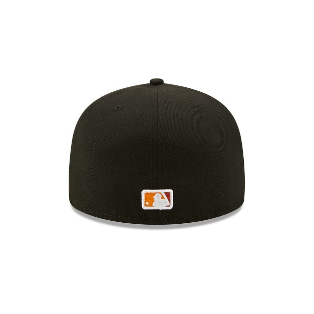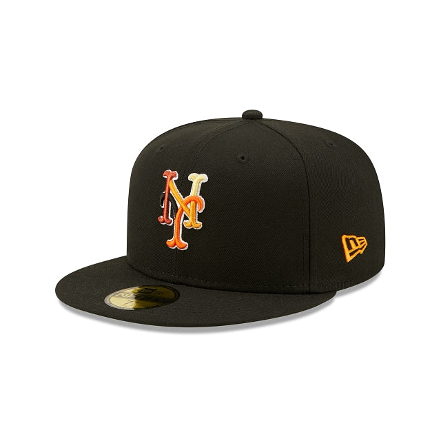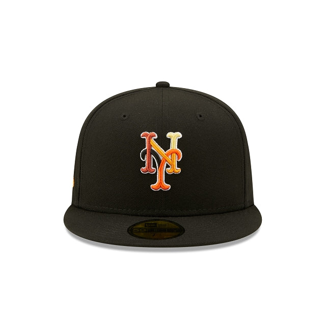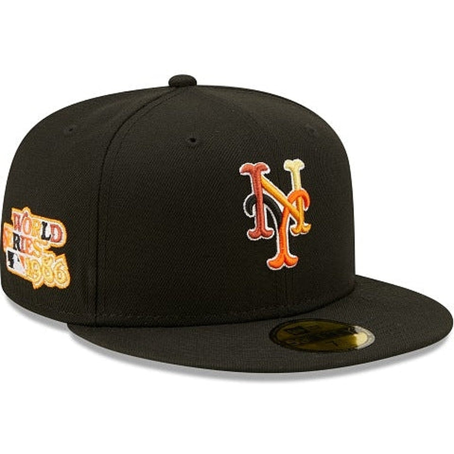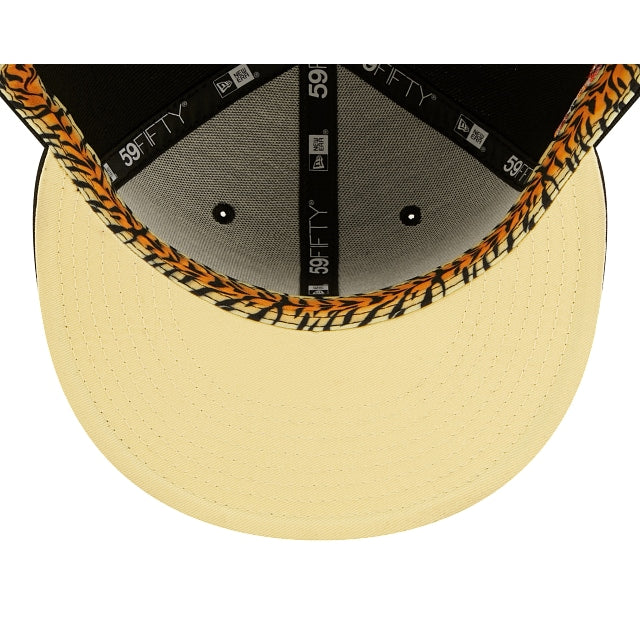 The New York Mets Jungle 59FIFTY Fitted Cap features an embroidered Mets multi-colored logo at the front panels, a 1986 World Series patch at the right-wear side, and a matching MLB Batterman logo at the rear. Additional details include a tiger inspired striped inner sweatband and yellow undervisor.