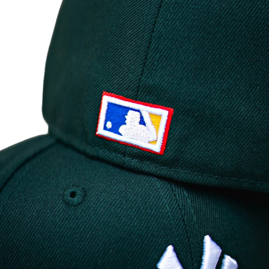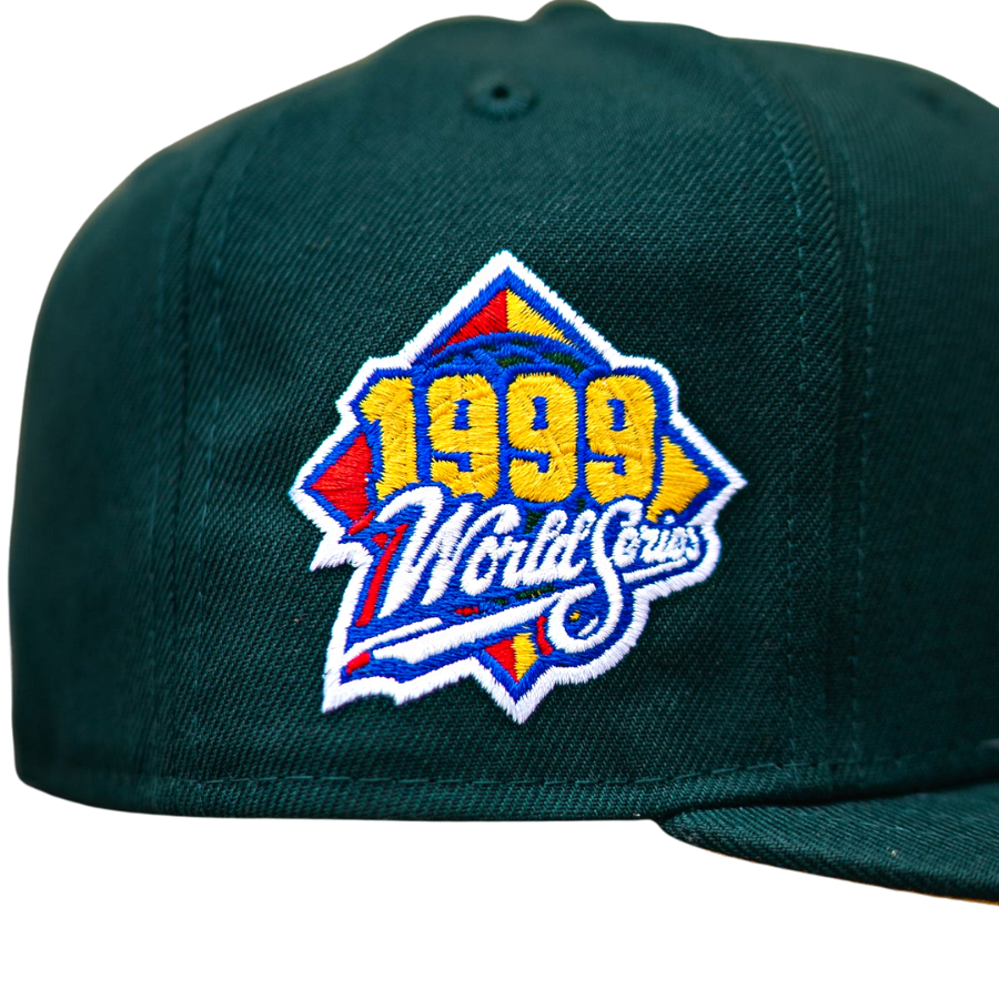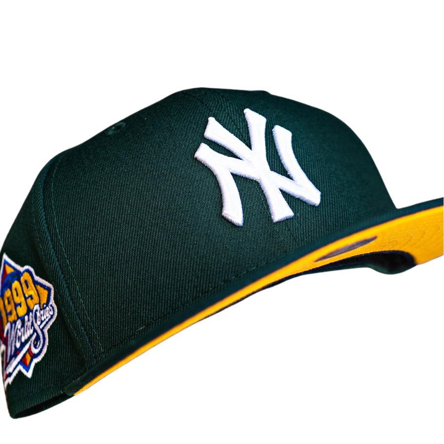 This New Era New York Yankees fitted hat has a forest green six panel structured high crown, embroidered eyelets and fabric squatchee button. The flat bill of the fitted is also forest green with a yellow undervisor and black sweatband. The front panel features the New York Yankees logo embroidery and a 1999 World Series side patch embroidered on the right panel.