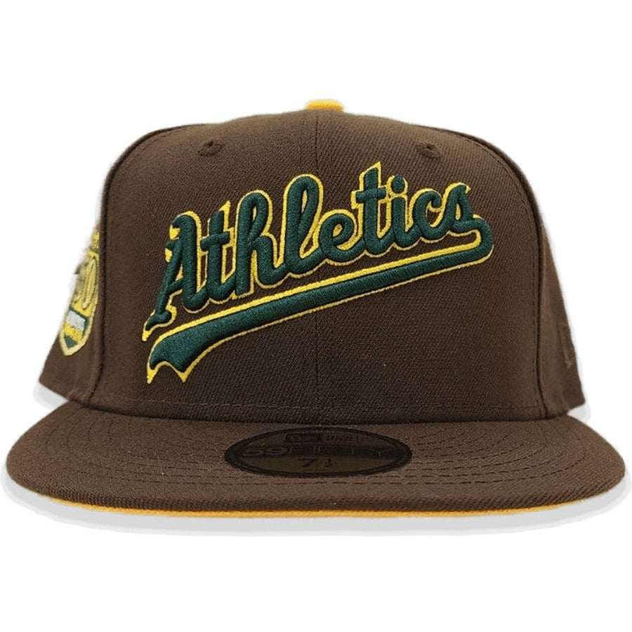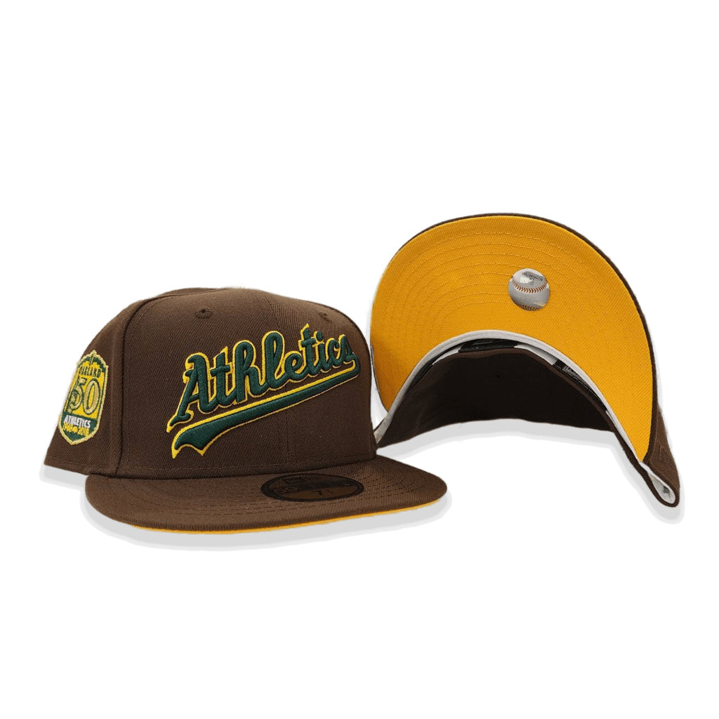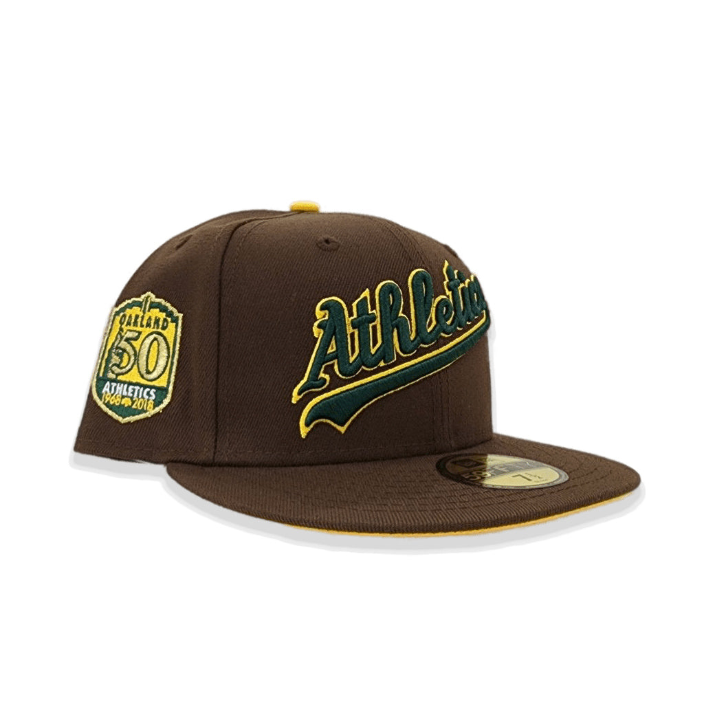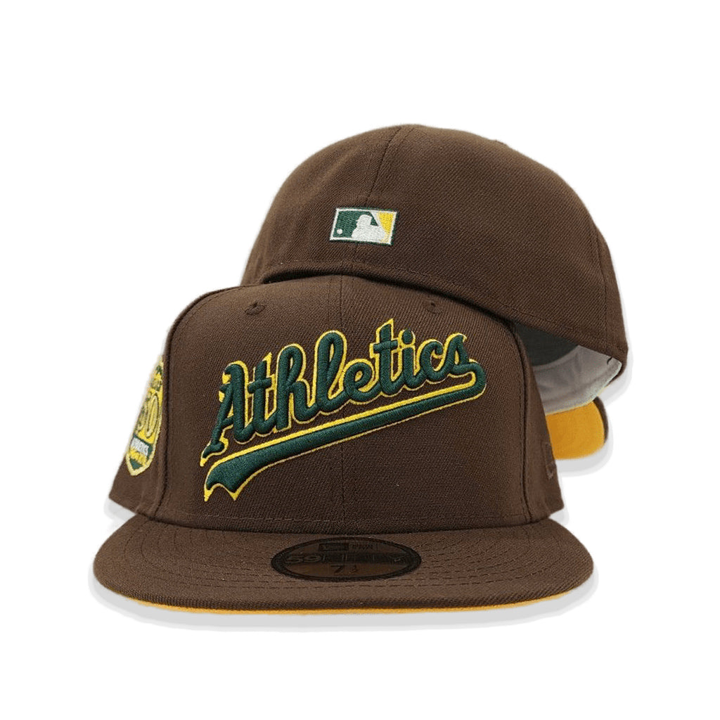 This New Era Brown Script Oakland Athletics yellow Bottom 50th Anniversary Side Patch 59FIFTY Fitted Hat was released by Exclusive Fitted. The fitted has a dark brown six panel structured high crown and embroidered eyelets with a dark brown fabric squatchee button. The fitted cap also has a dark brown flat bill with a yellow undervisor. The front panel features the Oakland Athletics logo embroidery and a 50th Anniversary side patch embroidery on the right panel. The left panel of the fitted displays the New Era logo and the official MLB logo embroidery on the rear crown.