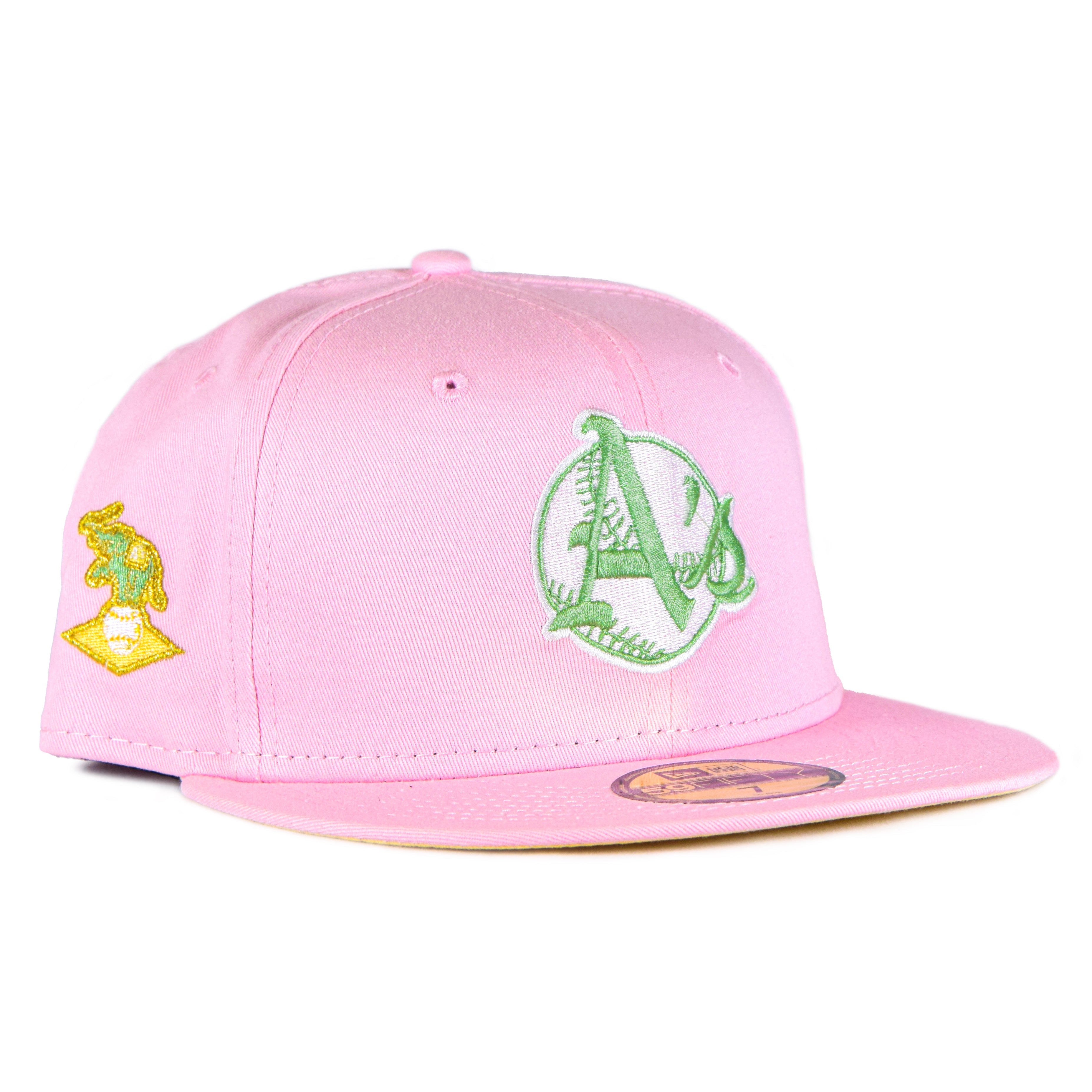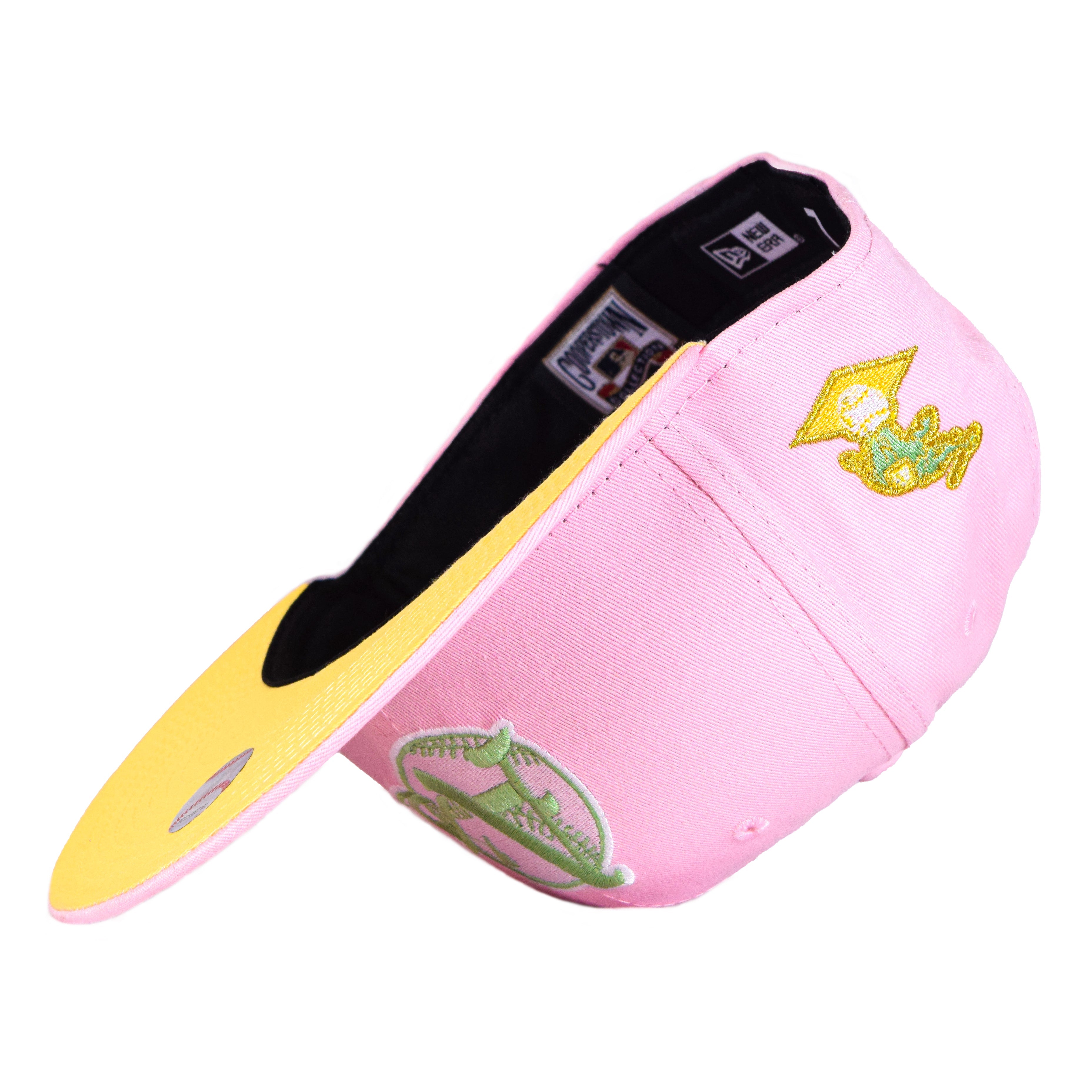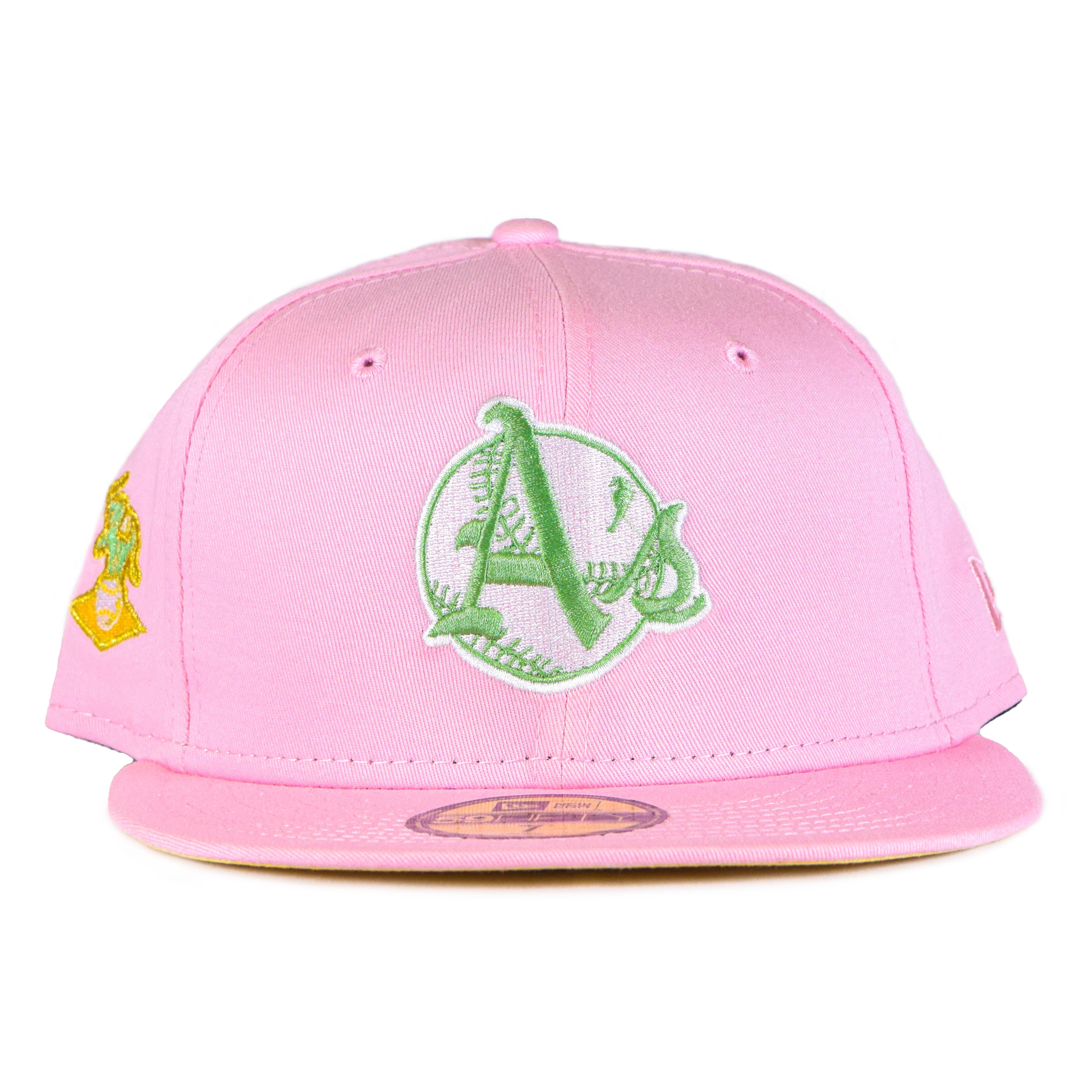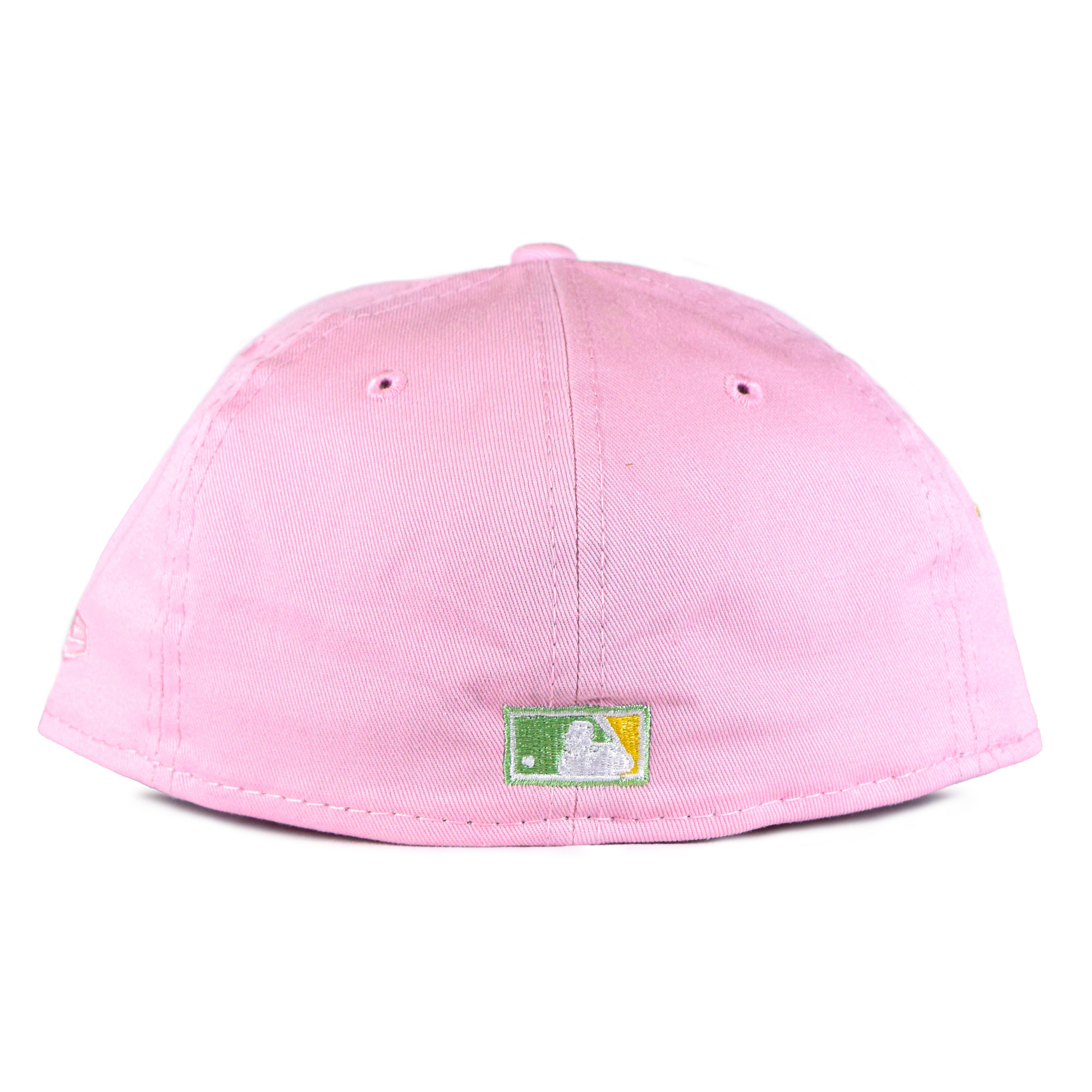 This New Era Oakland Athletics 59FIFTY fitted hat has a pink pastel six panel high crown, embroidered eyelets  and flat bill with a yellow undervisor and and black sweatband. The front panel, right panel and back of crown features embroideries in yellow and lime green threads.