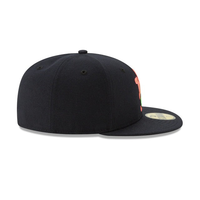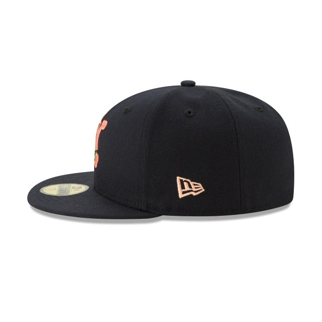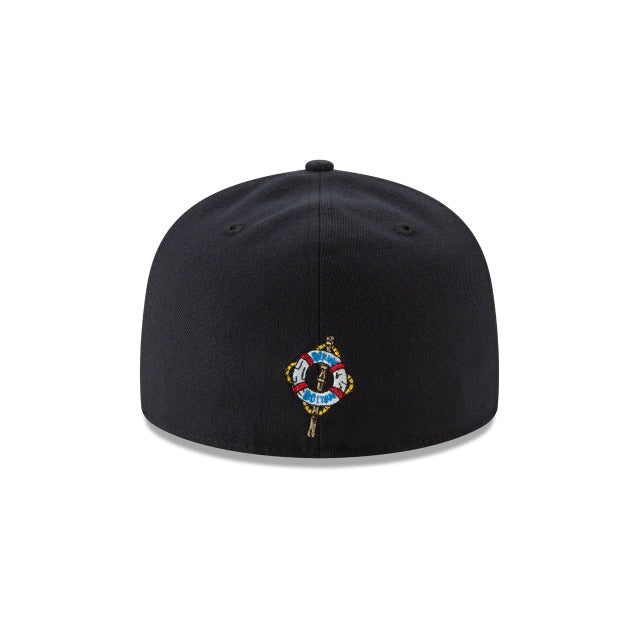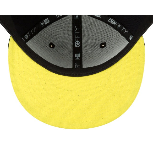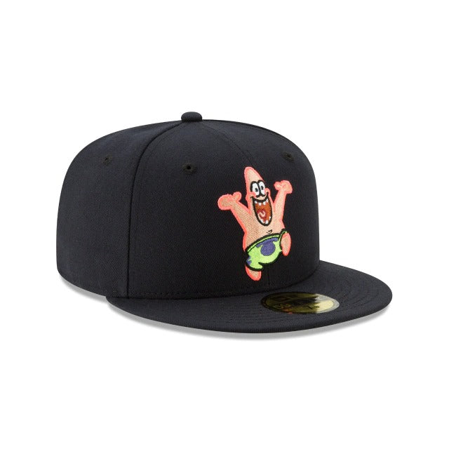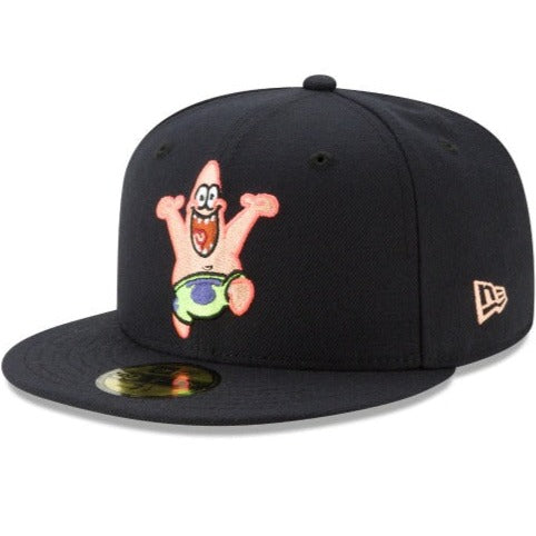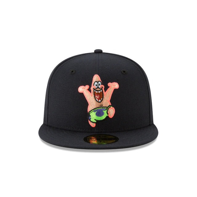 The Patrick Star 59FIFTY Fitted Cap features an embroidered Patrick character at the front panels that is offset by a matching New Era flag on the left-wear side and a Bikini Bottom sign embroidered at the rear. Additional details include a yellow undervisor and a custom Nickelodeon tag.
