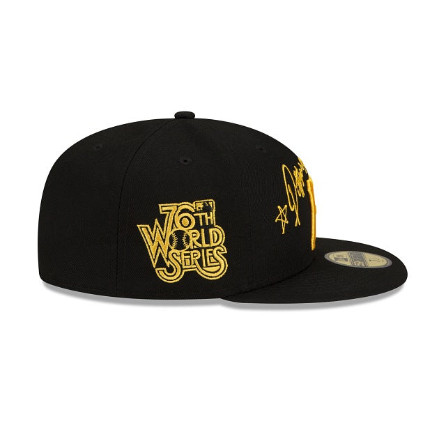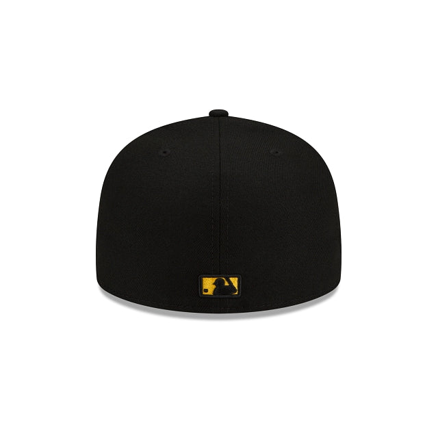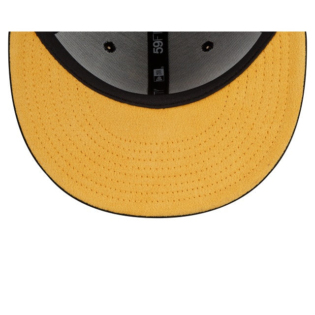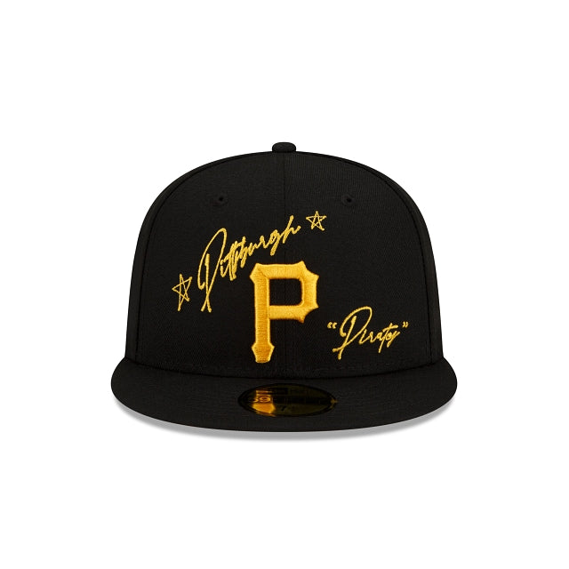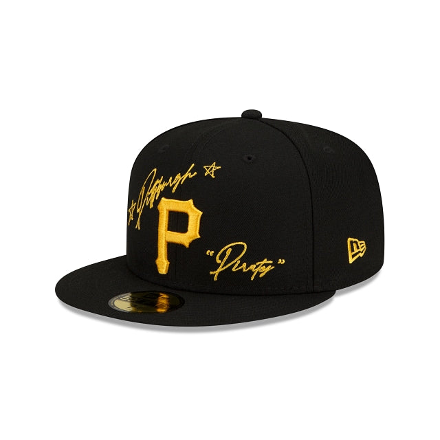 The Pittsburgh Pirates Cursive 59FIFTY Fitted Cap features an embroidered Pirates logo with a matching cursive script at the front panels, a World Series patch embroidered at the right-wear side and the MLB Batterman logo at the rear. Additional details include a gray undervisor.