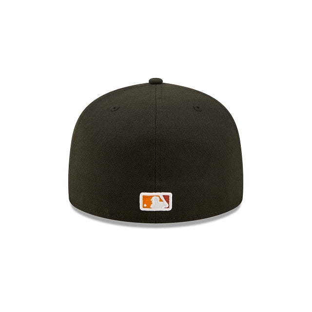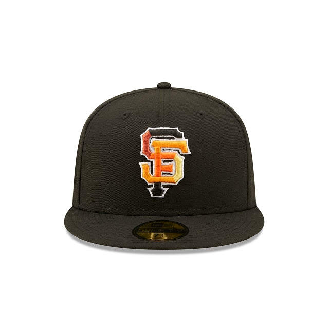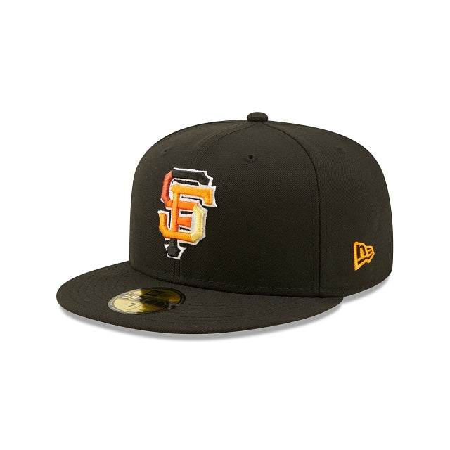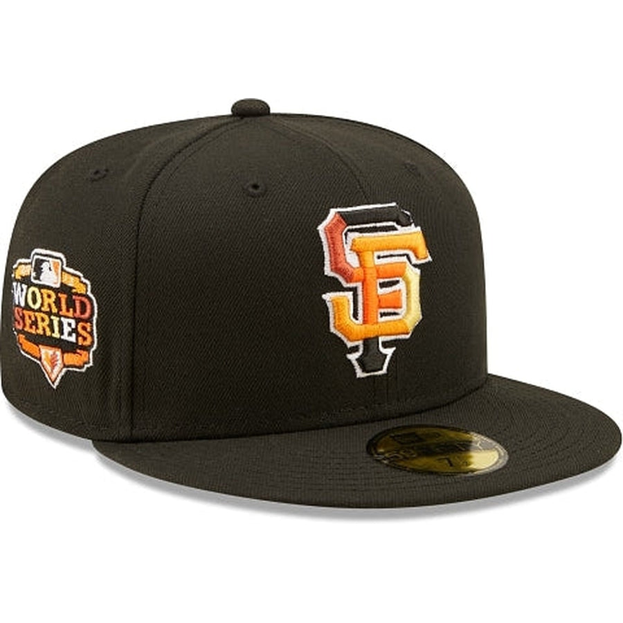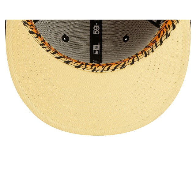 The San Francisco Giants Jungle 59FIFTY Fitted Cap features an embroidered Giants multi-colored logo at the front panels, a 2012 World Series patch at the right-wear side, and a matching MLB Batterman logo at the rear. Additional details include a tiger inspired striped inner sweatband and yellow undervisor.