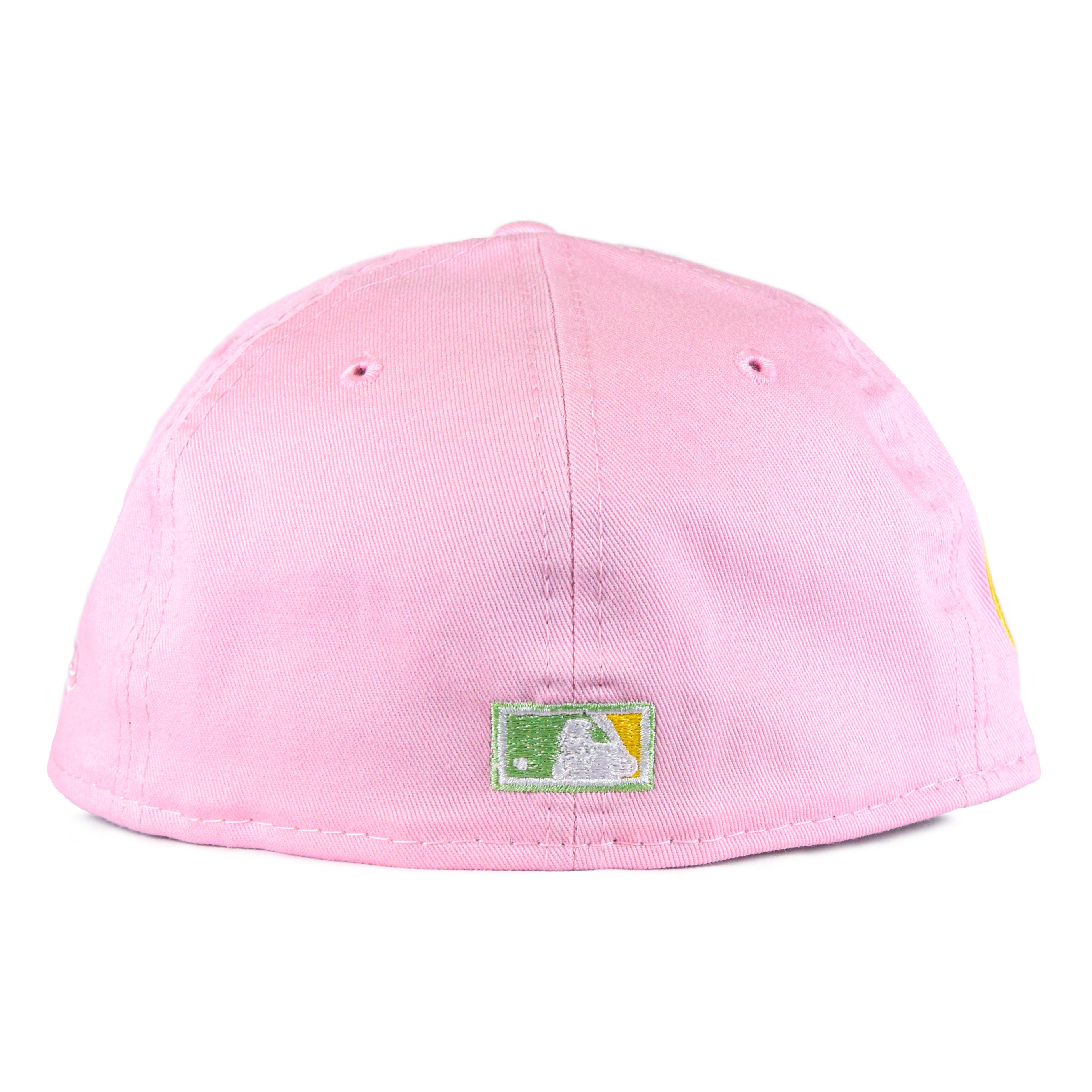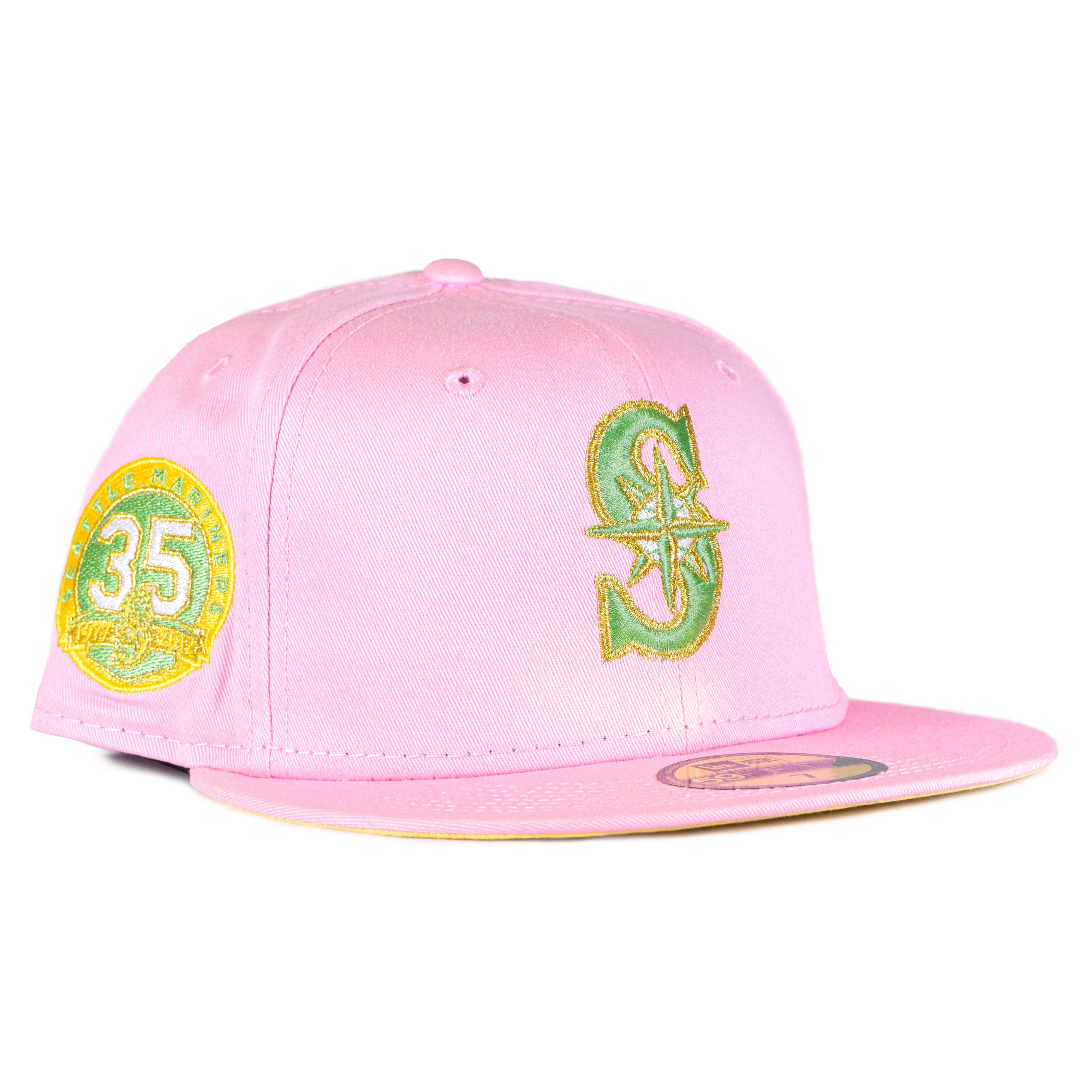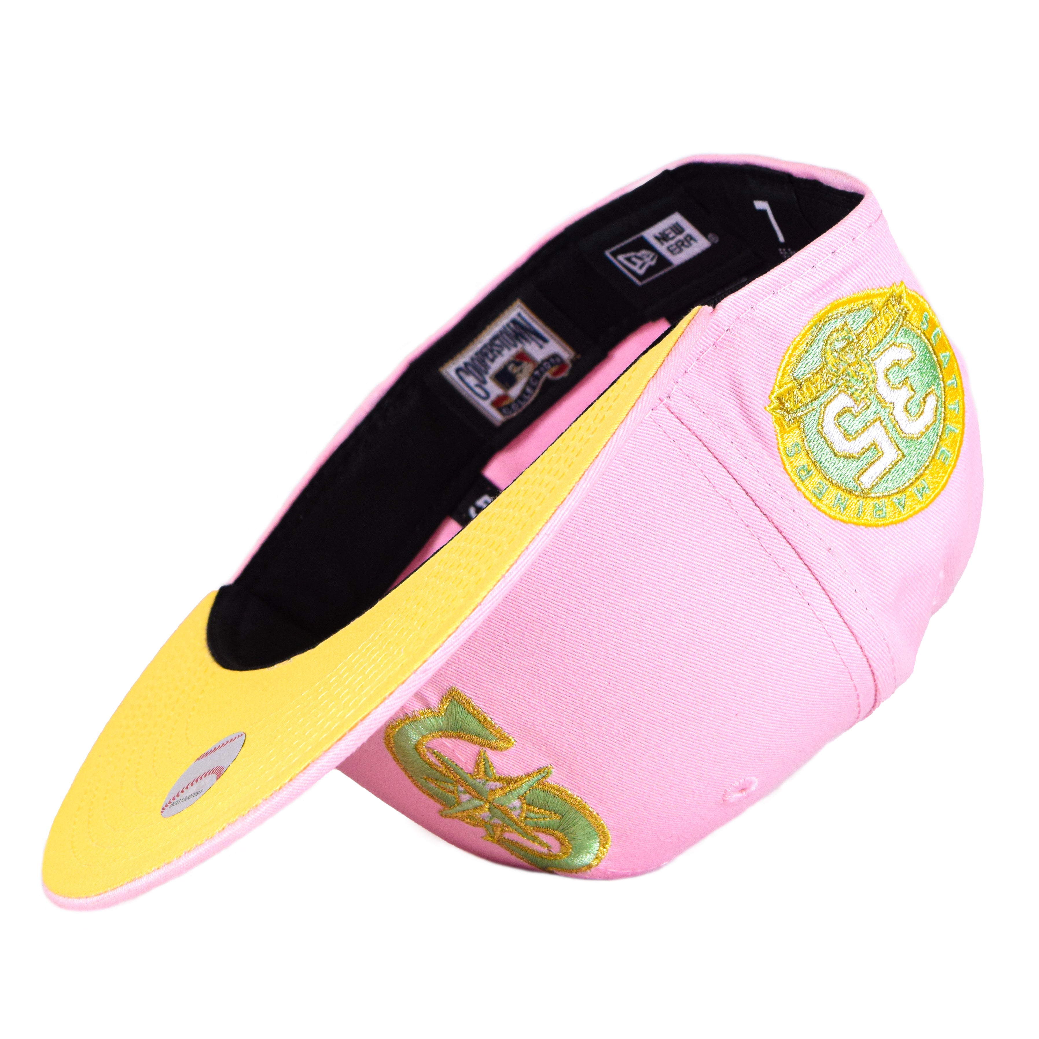 This New Era Seattle Mariners 59FIFTY fitted hat has a pink pastel six panel high crown, embroidered eyelets and flat bill with a yellow undervisor and and black sweatband. The front panel, right panel and back of crown features embroideries in yellow and lime green threads.