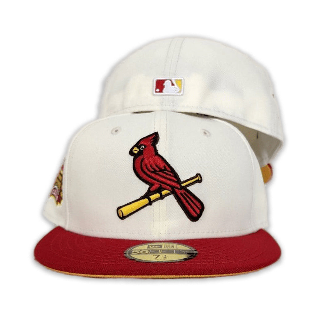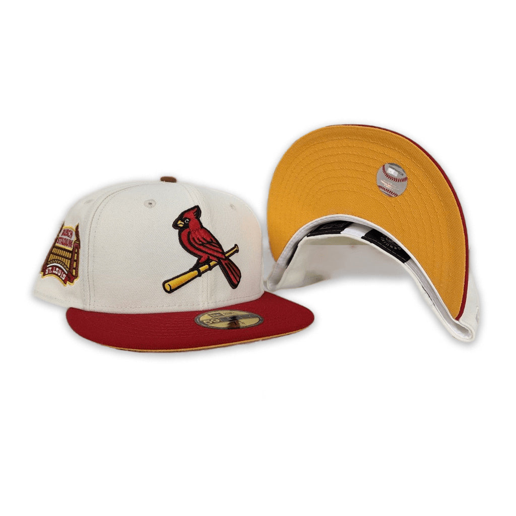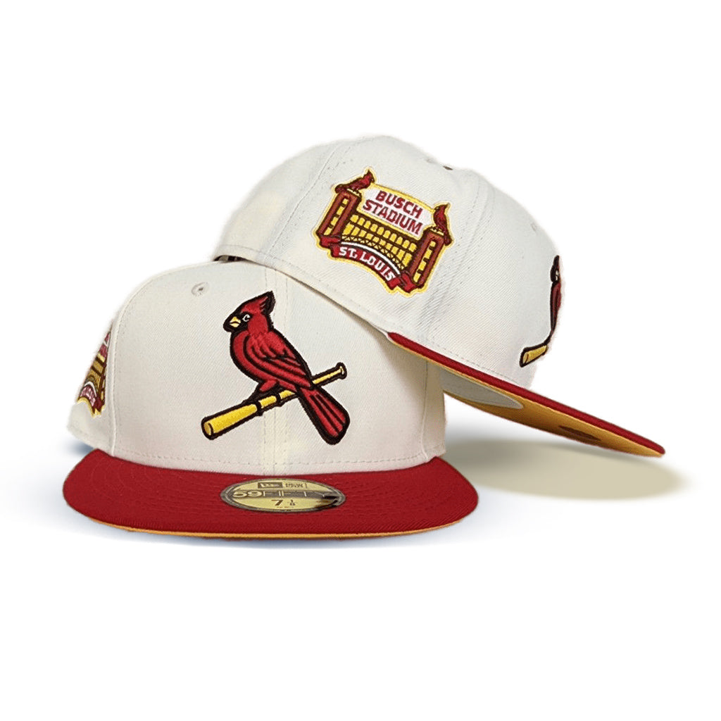 This New Era St. Louis Cardinals 59FIFTY fitted hat has an off-white six panel structured high crown and embroidered eyelets with a red fabric squatchee button. The flat bill of the fitted is red with a yellow undervisor and white sweatband. Additional details include the St. Louis Cardinals logo embroidery on the front panel and a Busch Stadium side patch embroidered on the right panel.