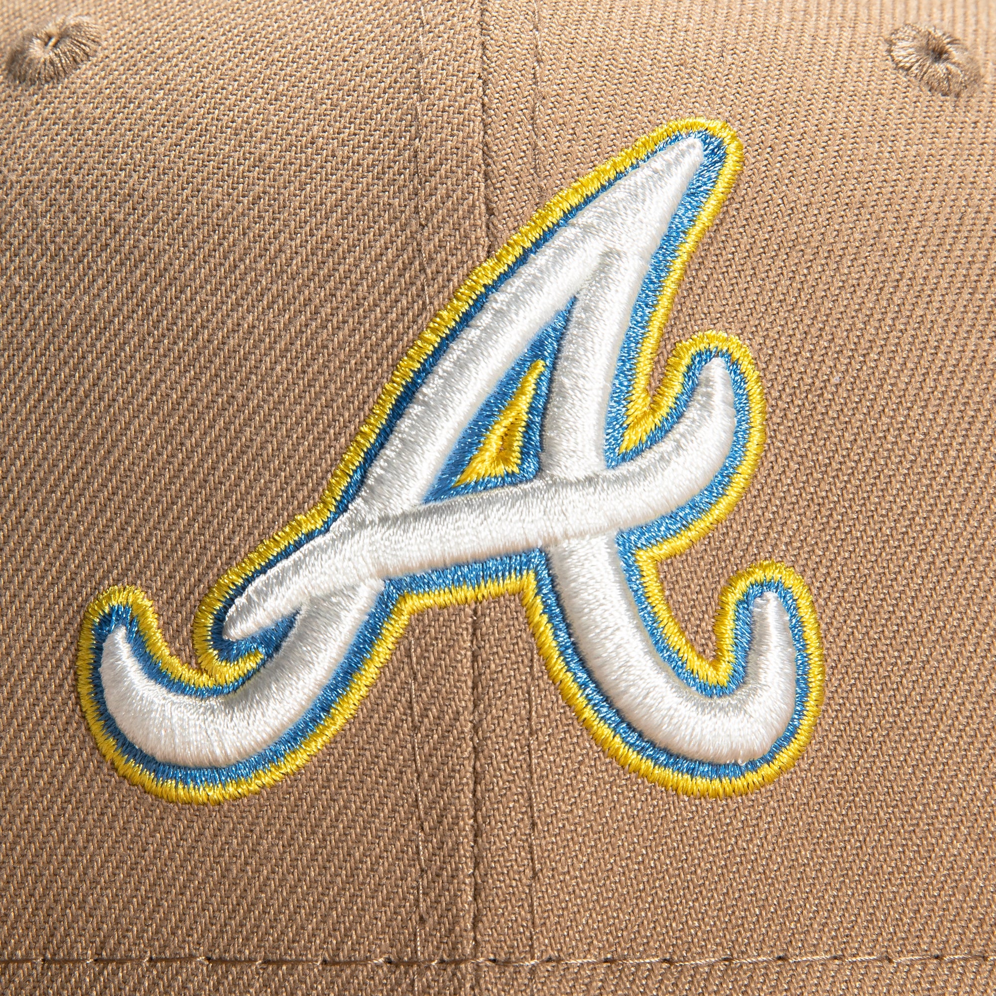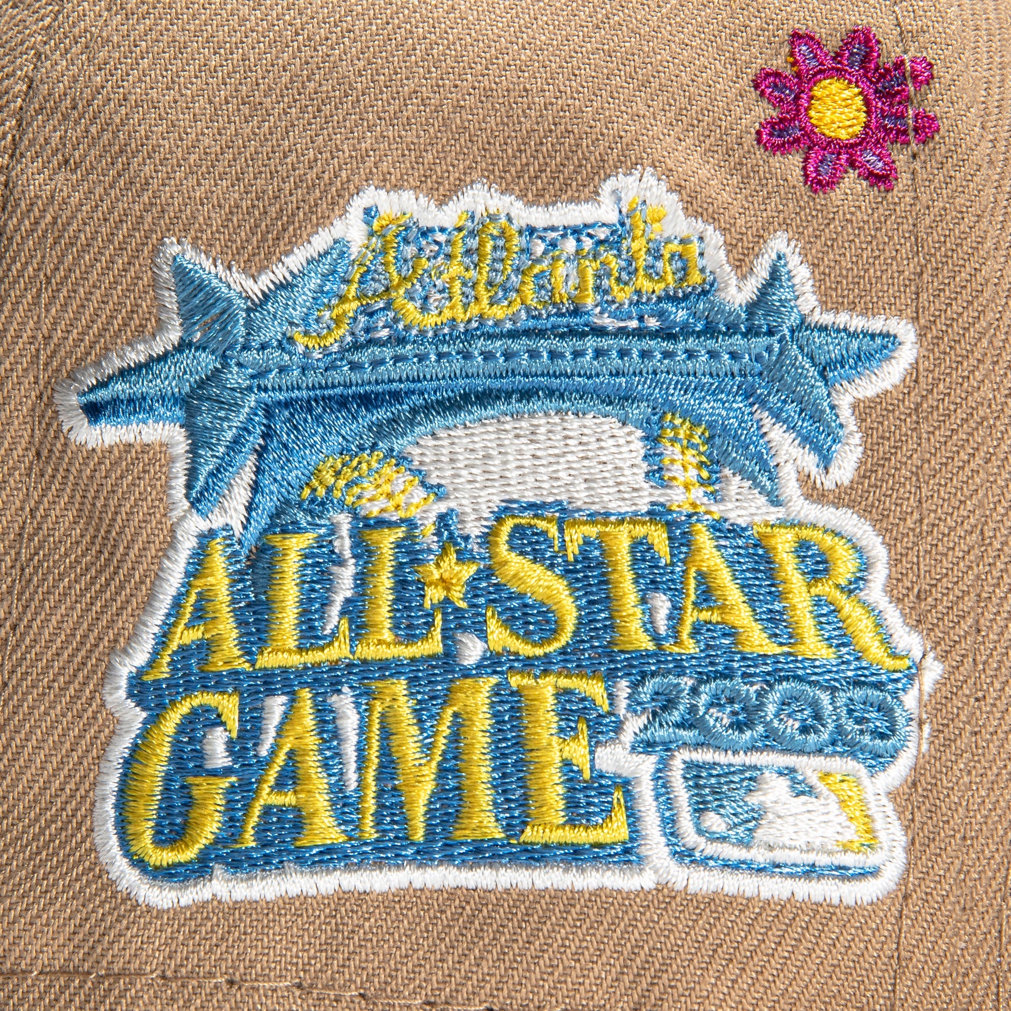This New Era Super Bloom Atlanta Braves 2000 All-Star Game 2022 59FIFTY Fitted Hat is a Hat Club exclusive. It has a tan six panel structured high crown and embroidered eyelets with a tan fabric squatchee button. The fitted cap has a tan flat bill with a yellow undervisor. The front panel features the Atlanta Braves logo embroidery and a 2000 ASG side patch embroidery on the right panel. The left panel of the fitted displays the New Era logo and the official MLB logo embroidery on the rear crown.