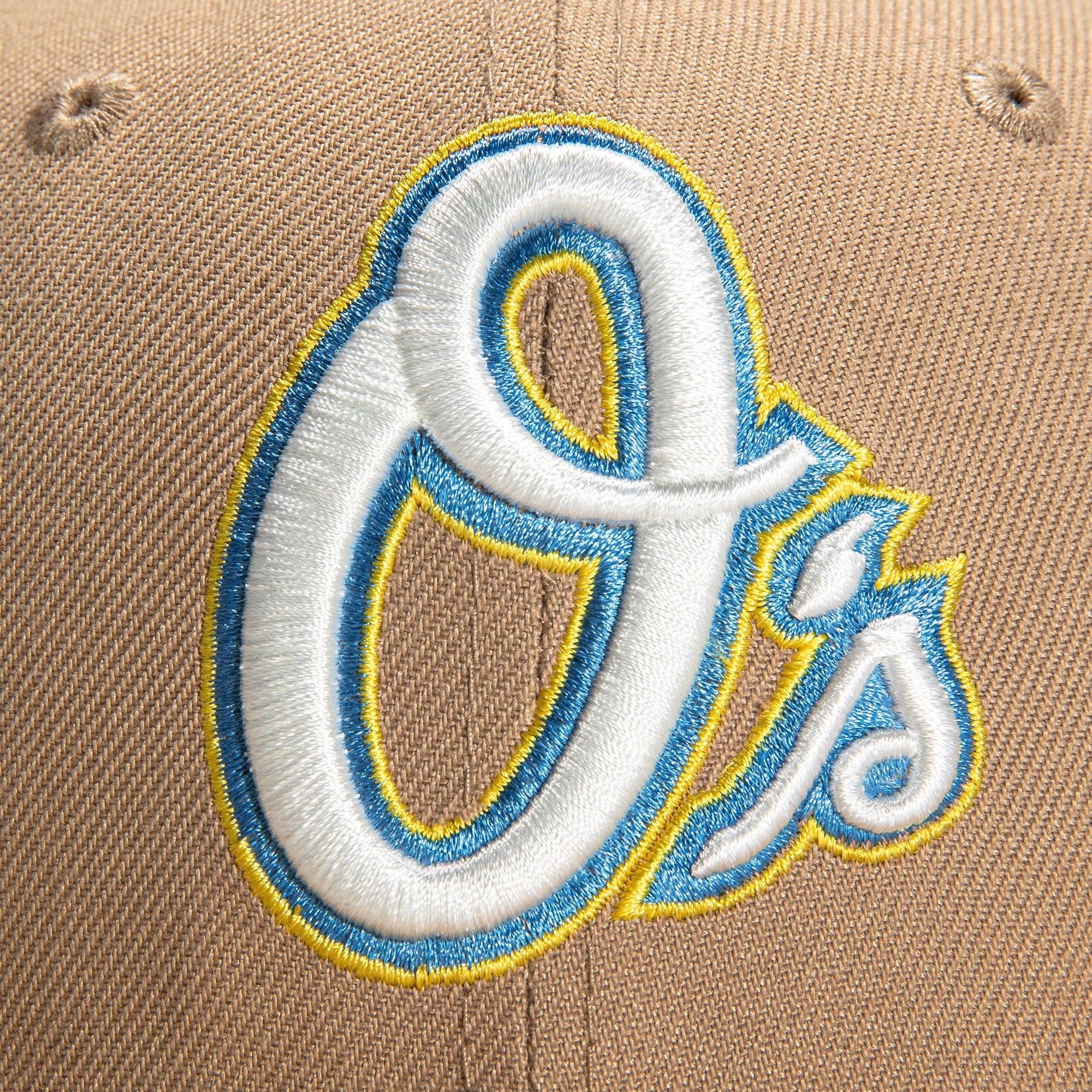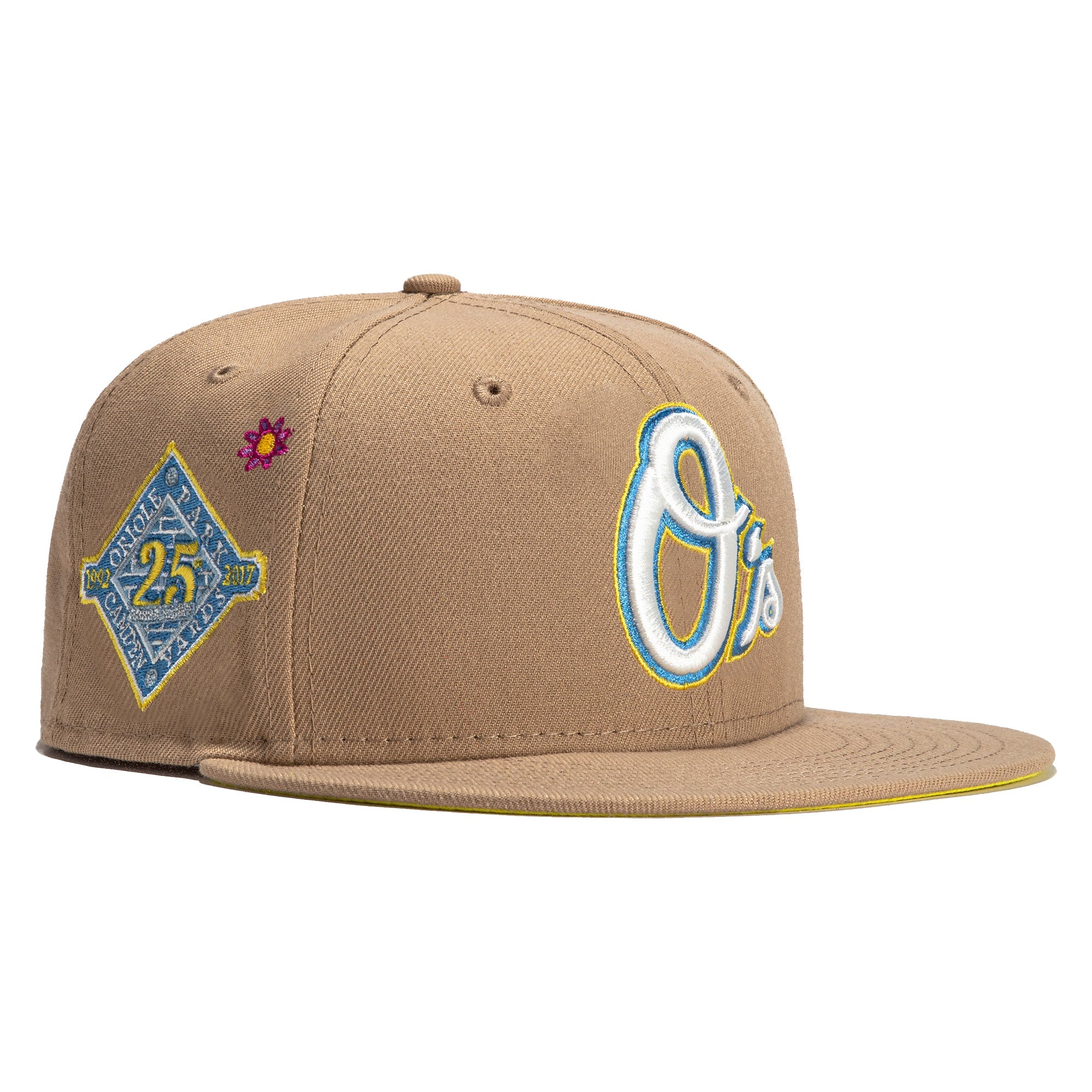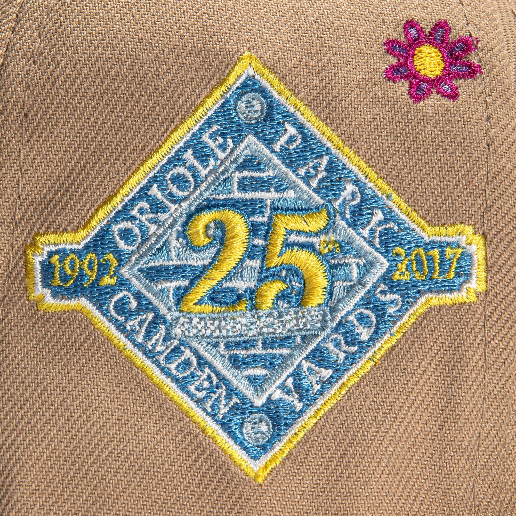 This New Era Super Bloom Baltimore Orioles 25th Anniversary 2022 59FIFTY Fitted Hat is a Hat Club exclusive. It has a tan six panel structured high crown and embroidered eyelets with a tan fabric squatchee button. The fitted cap has a tan flat bill with a yellow undervisor. The front panel features the Baltimore Orioles logo embroidery and a 25th Anniversary side patch embroidery on the right panel. The left panel of the fitted displays the New Era logo and the official MLB logo embroidery on the rear crown.