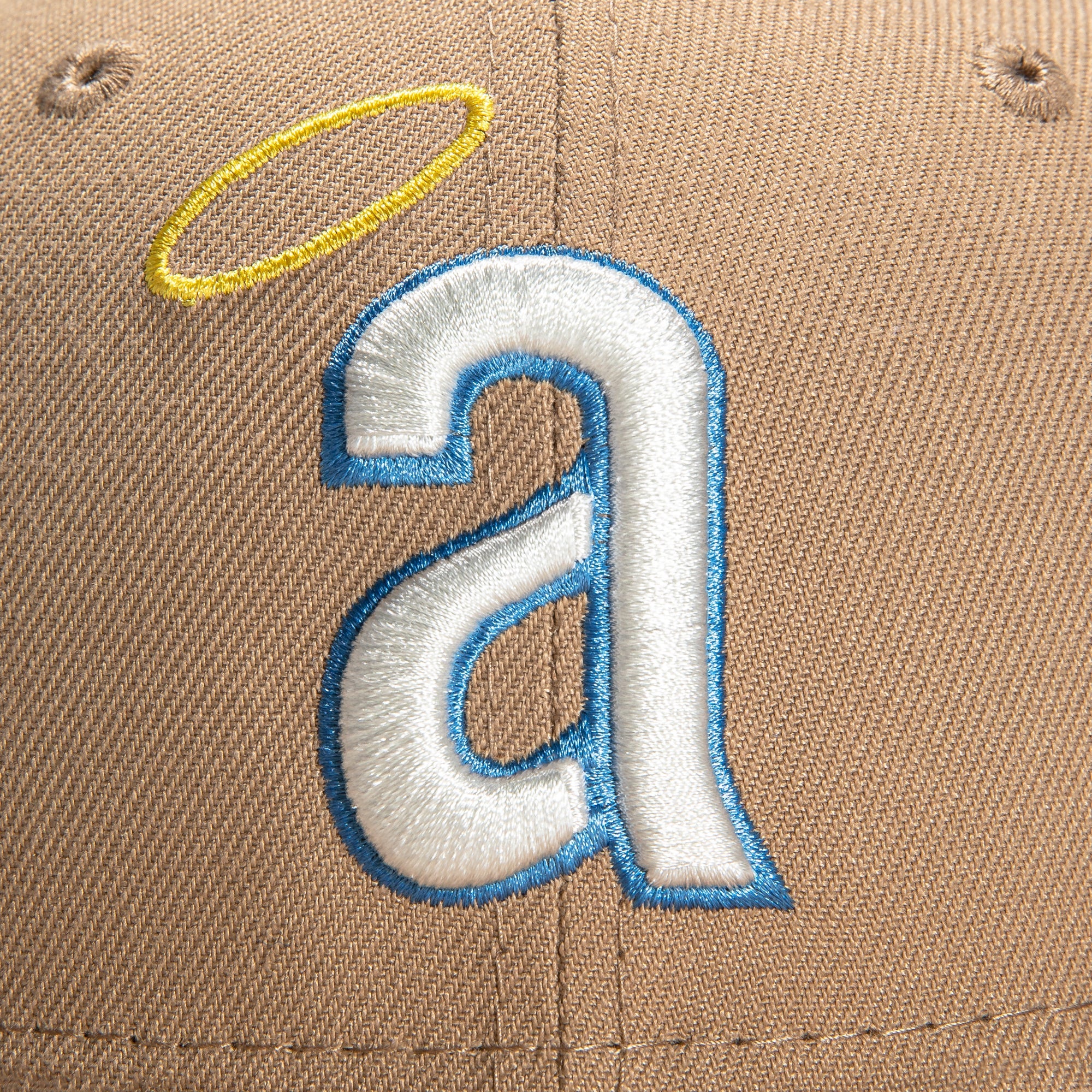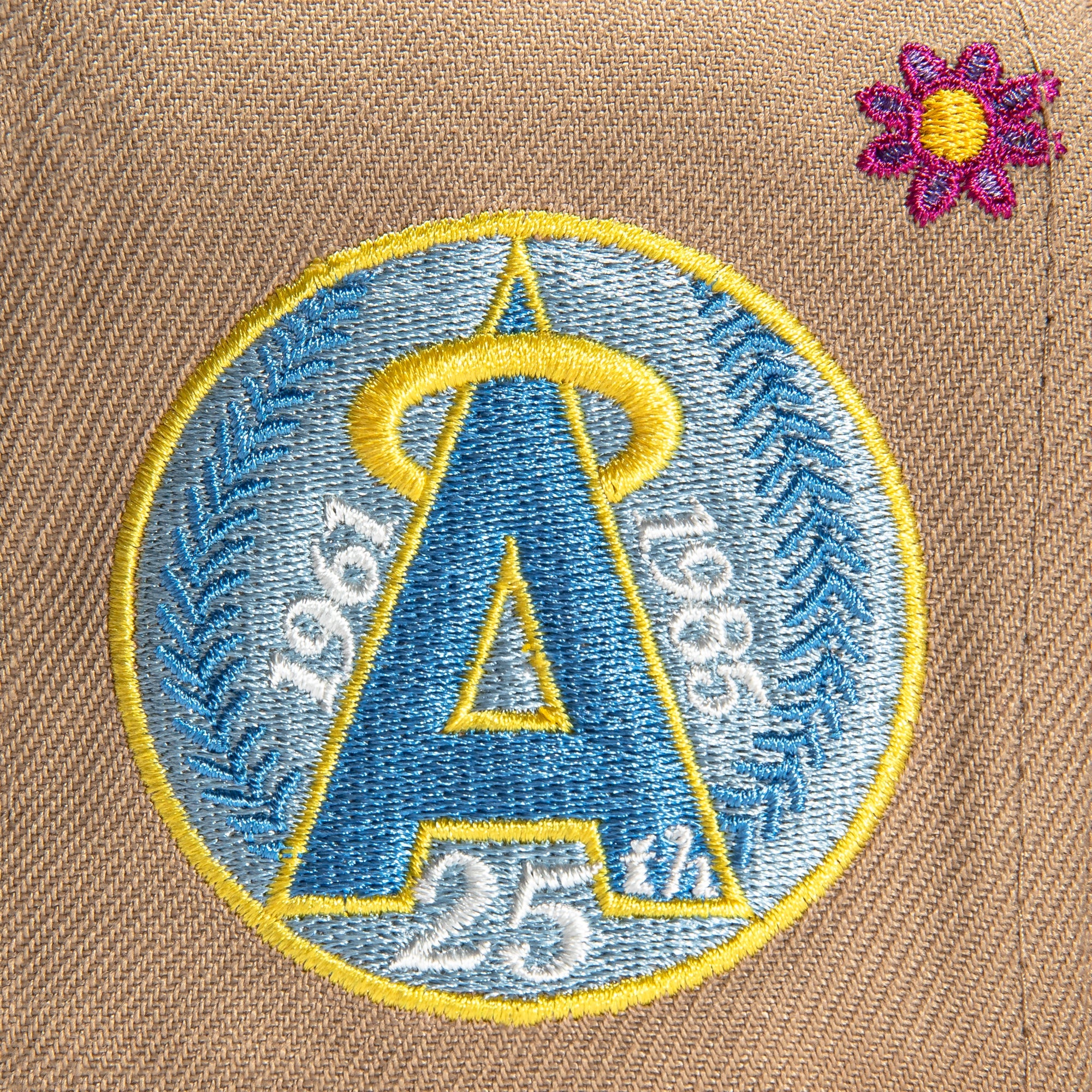 This New Era Super Bloom Los Angeles Angels 25th Anniversary 2022 59FIFTY Fitted Hat is a Hat Club exclusive. It has a tan six panel structured high crown and embroidered eyelets with a tan fabric squatchee button. The fitted cap has a tan flat bill with a yellow undervisor. The front panel features the Los Angeles Angels logo embroidery and a 25th Anniversary side patch embroidery on the right panel. The left panel of the fitted displays the New Era logo and the official MLB logo embroidery on the rear crown.