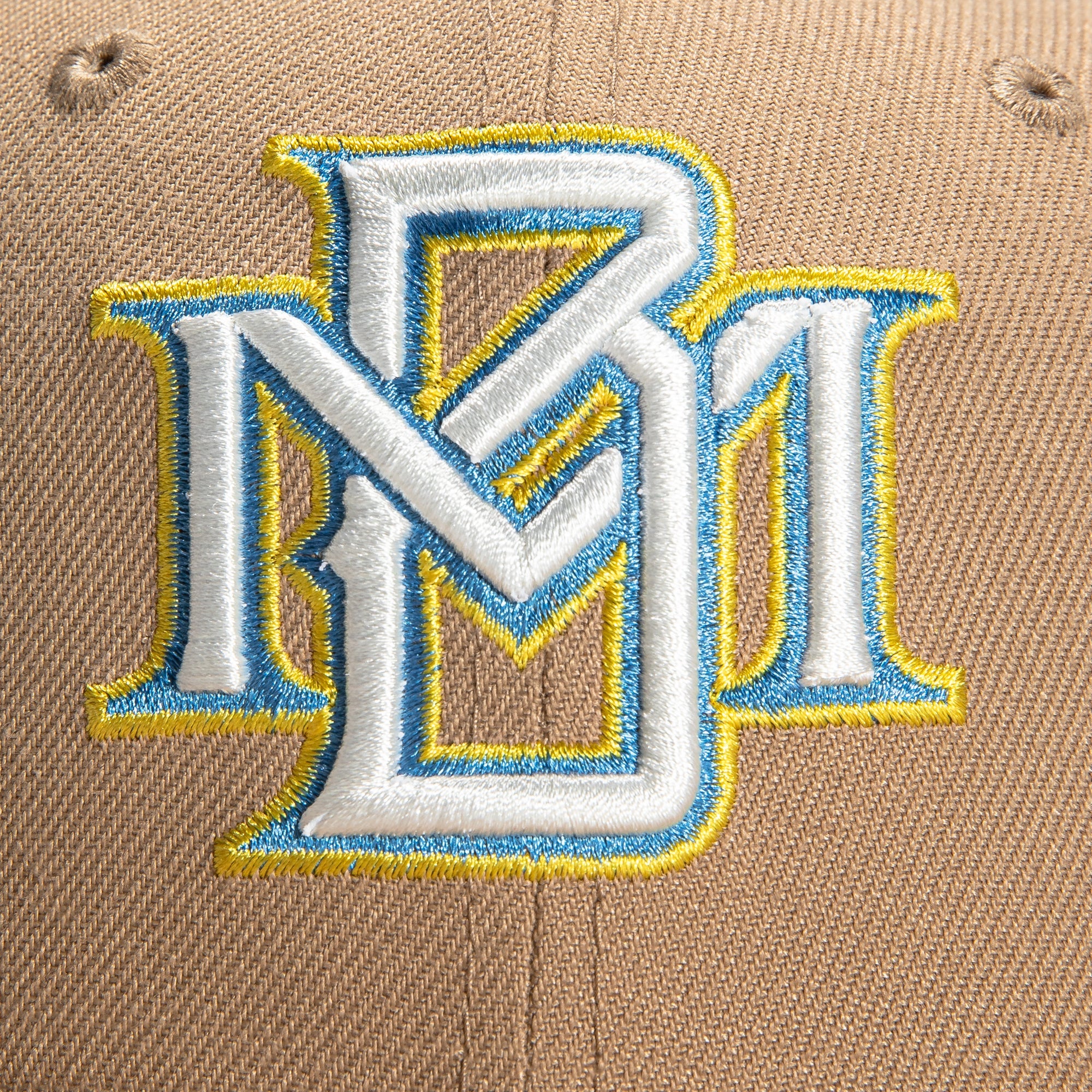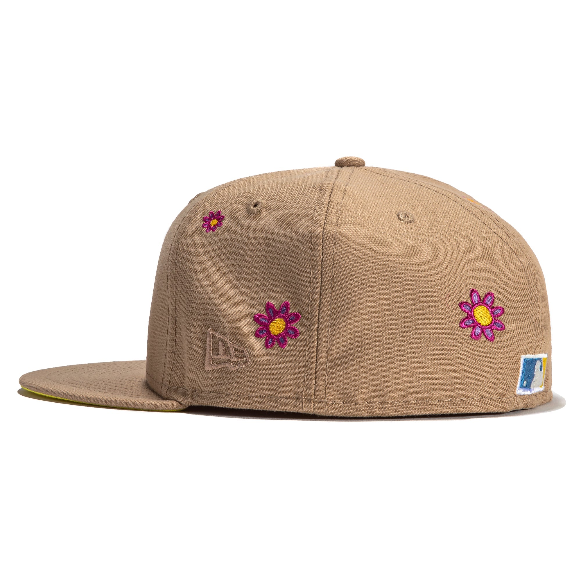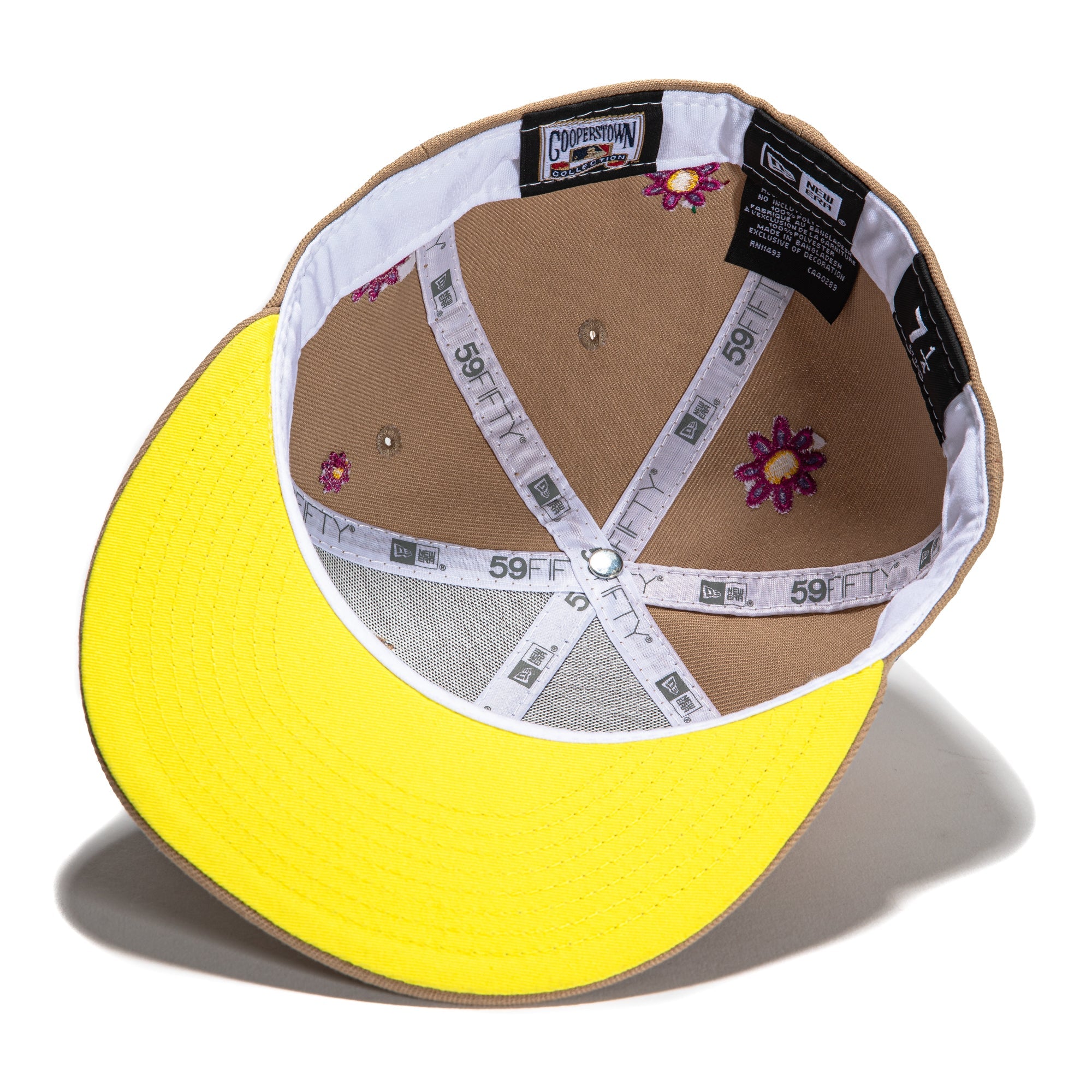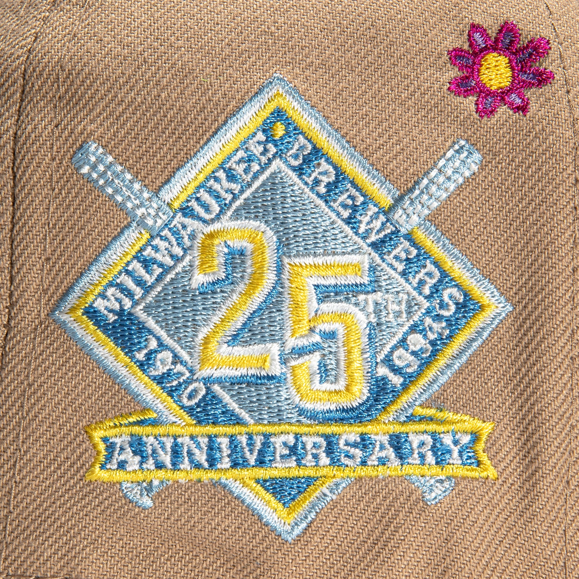 This New Era Super Bloom Milwaukee Brewers 25th Anniversary 2022 59FIFTY Fitted Hat is a Hat Club exclusive. It has a tan six panel structured high crown and embroidered eyelets with a tan fabric squatchee button. The fitted cap has a tan flat bill with a yellow undervisor. The front panel features the Milwaukee Brewers logo embroidery and a 25th Anniversary side patch embroidery on the right panel. The left panel of the fitted displays the New Era logo and the official MLB logo embroidery on the rear crown.