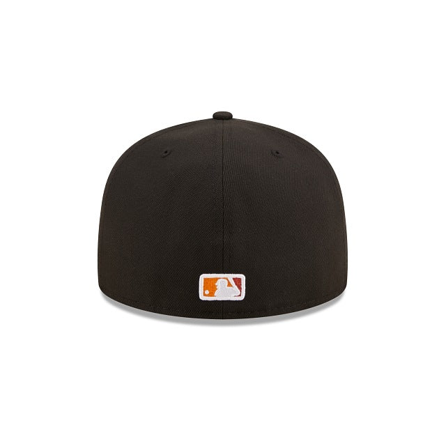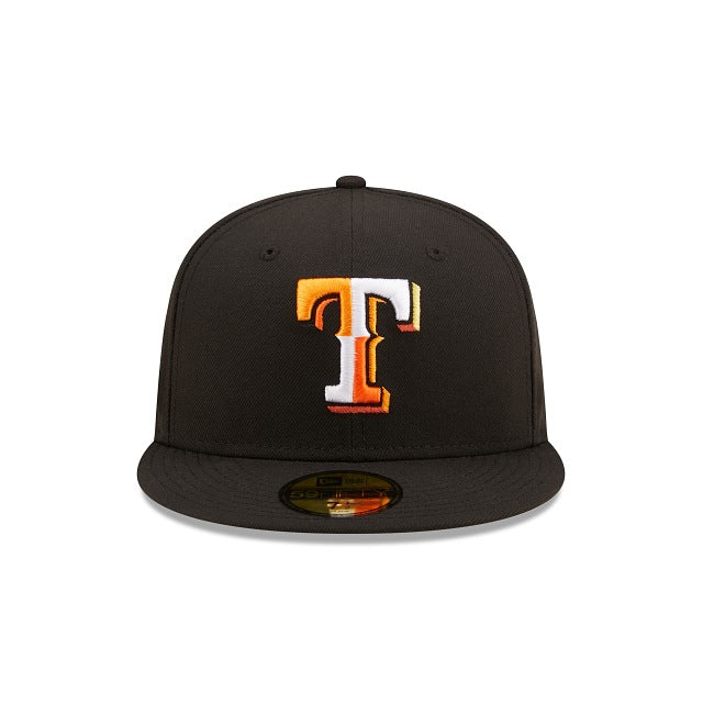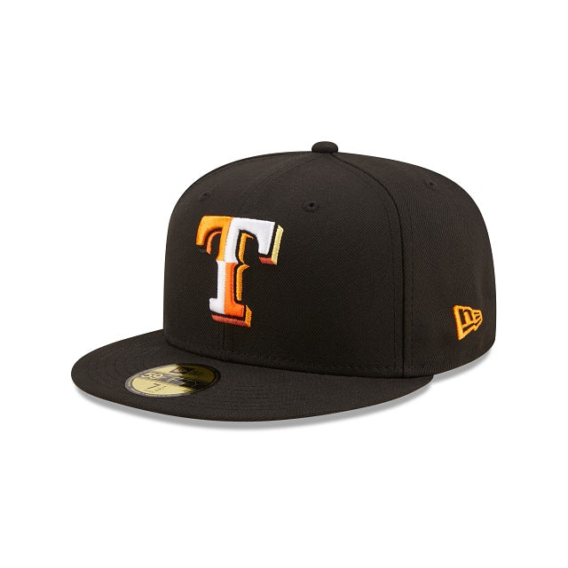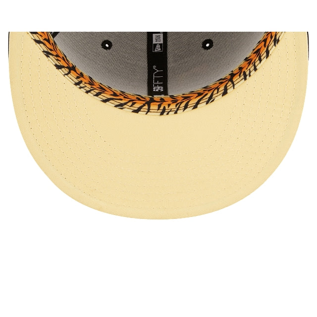The Texas Rangers Jungle 59FIFTY Fitted Cap features an embroidered Rangers multi-colored logo at the front panels, a 1995 All-Star Game patch at the right-wear side, and a matching MLB Batterman logo at the rear. Additional details include a tiger inspired striped inner sweatband and yellow undervisor.