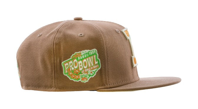This New Era "NFL Legends Pack" 59FIFTY fitted hat is a Shoe Palace exclusive release. The fitted features a brown six panel structured high crown, embroidered eyelets and fabric squatchee button. The flat brim of the cap is also brown with a soft yellow undervisor and black sweatband. The front panel features the NFL team logo embroidered in a lime green and orange colorway with a side patch embroidery on the right panel in the same colors.
