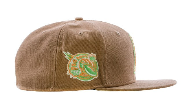 This New Era "NFL Legends Pack" 59FIFTY fitted hat is a Shoe Palace exclusive release. The fitted features a brown six panel structured high crown, embroidered eyelets and fabric squatchee button. The flat brim of the cap is also brown with a soft yellow undervisor and black sweatband. The front panel features the NFL team logo embroidered in a lime green and orange colorway with a side patch embroidery on the right panel in the same colors.