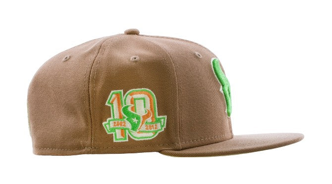 This New Era "NFL Legends Pack" 59FIFTY fitted hat is a Shoe Palace exclusive release. The fitted features a brown six panel structured high crown, embroidered eyelets and fabric squatchee button. The flat brim of the cap is also brown with a soft yellow undervisor and black sweatband. The front panel features the NFL team logo embroidered in a lime green and orange colorway with a side patch embroidery on the right panel in the same colors.