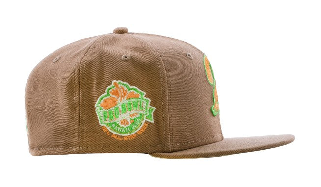 This New Era "NFL Legends Pack" 59FIFTY fitted hat is a Shoe Palace exclusive release. The fitted features a brown six panel structured high crown, embroidered eyelets and fabric squatchee button. The flat brim of the cap is also brown with a soft yellow undervisor and black sweatband. The front panel features the NFL team logo embroidered in a lime green and orange colorway with a side patch embroidery on the right panel in the same colors.