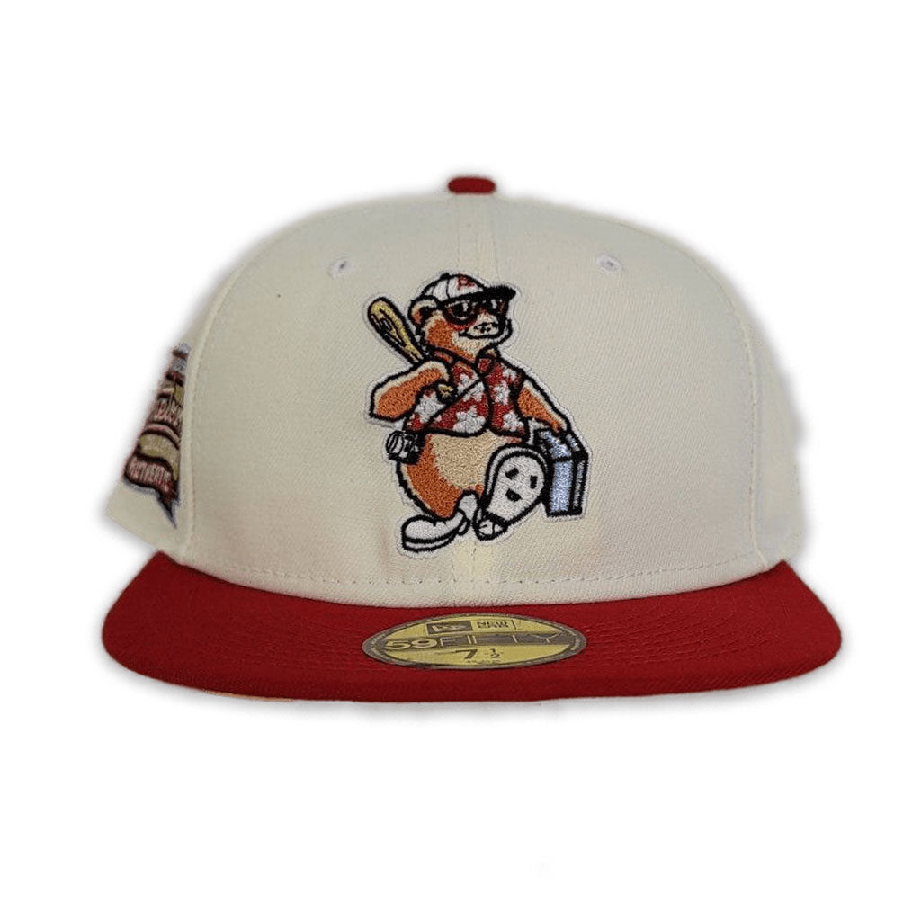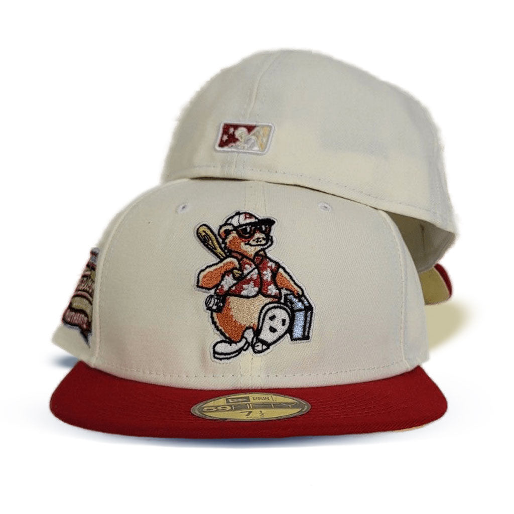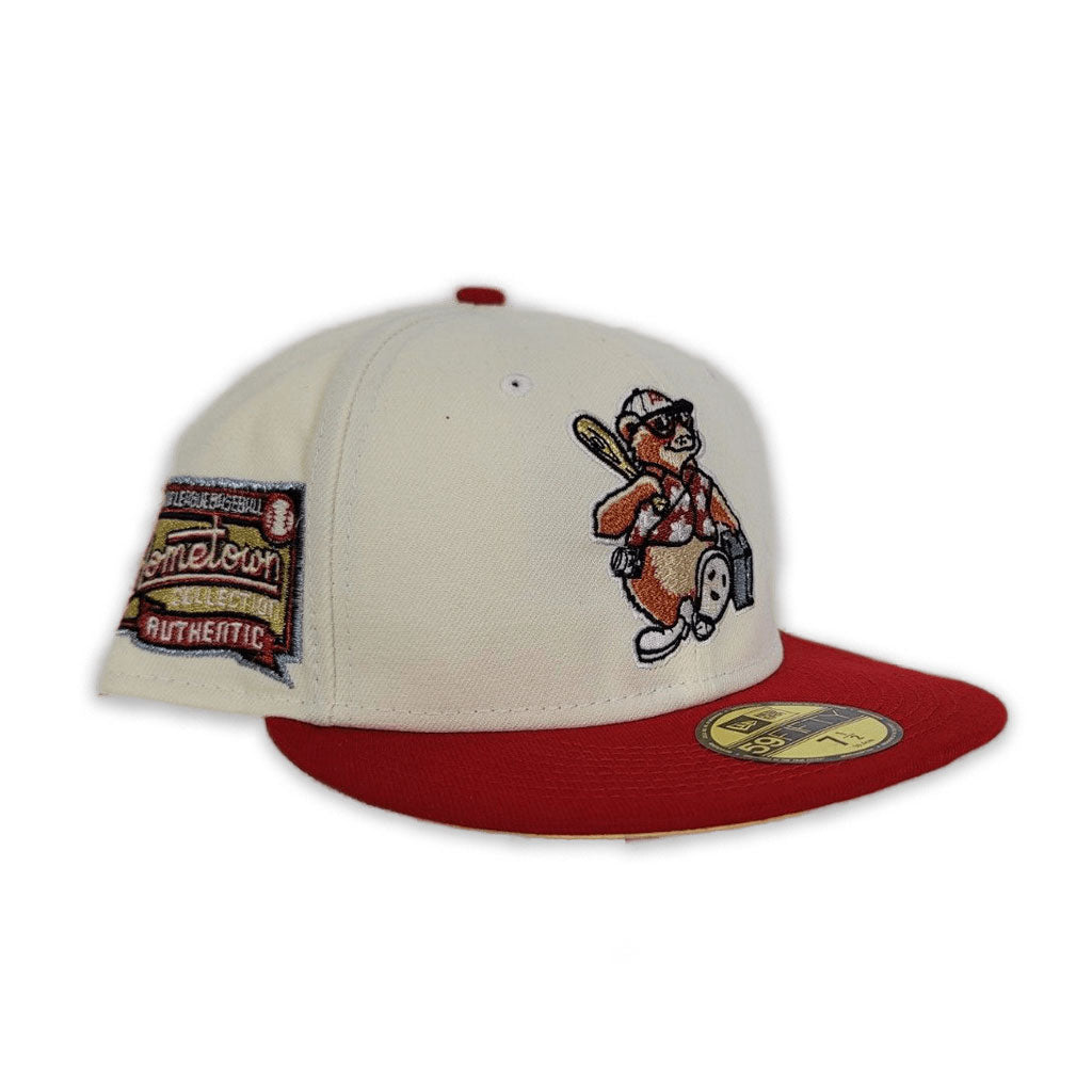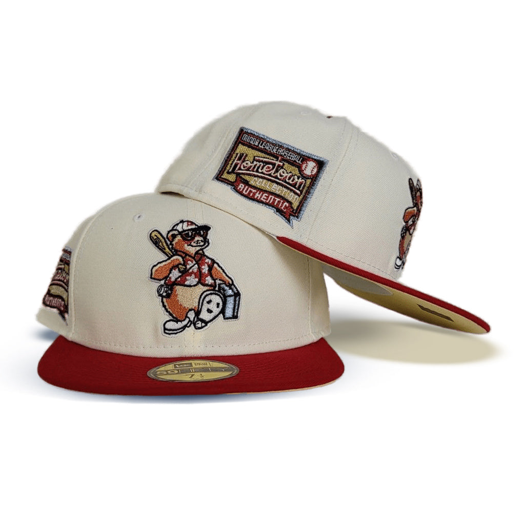 This New Era Asheville Tourists 59FIFTY fitted hat has a Off-White six panel structured high crown, Off-White embroidered eyelets and a red fabric squatchee button. The fitted cap also has a red flat bill with a soft yellow undervisor and white sweatband. The front panel features the Asheville Tourists logo embroidery and a Hometown Collection side patch embroidery on the right panel. The left panel of the fitted displays the New Era logo and the rear crown features the official MILB logo embroidery.
