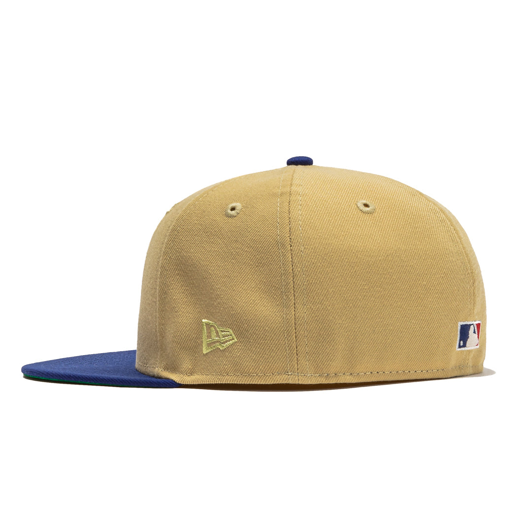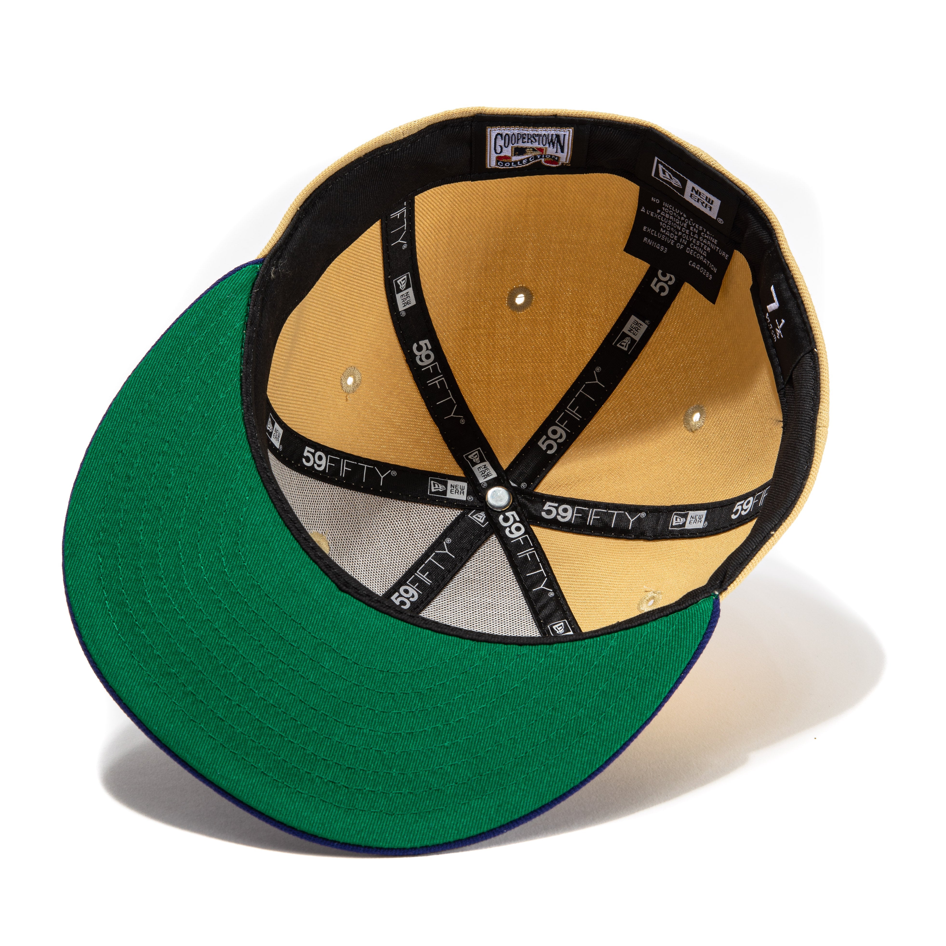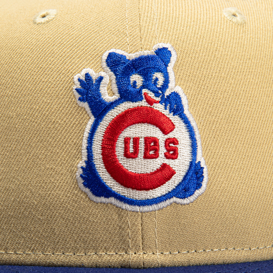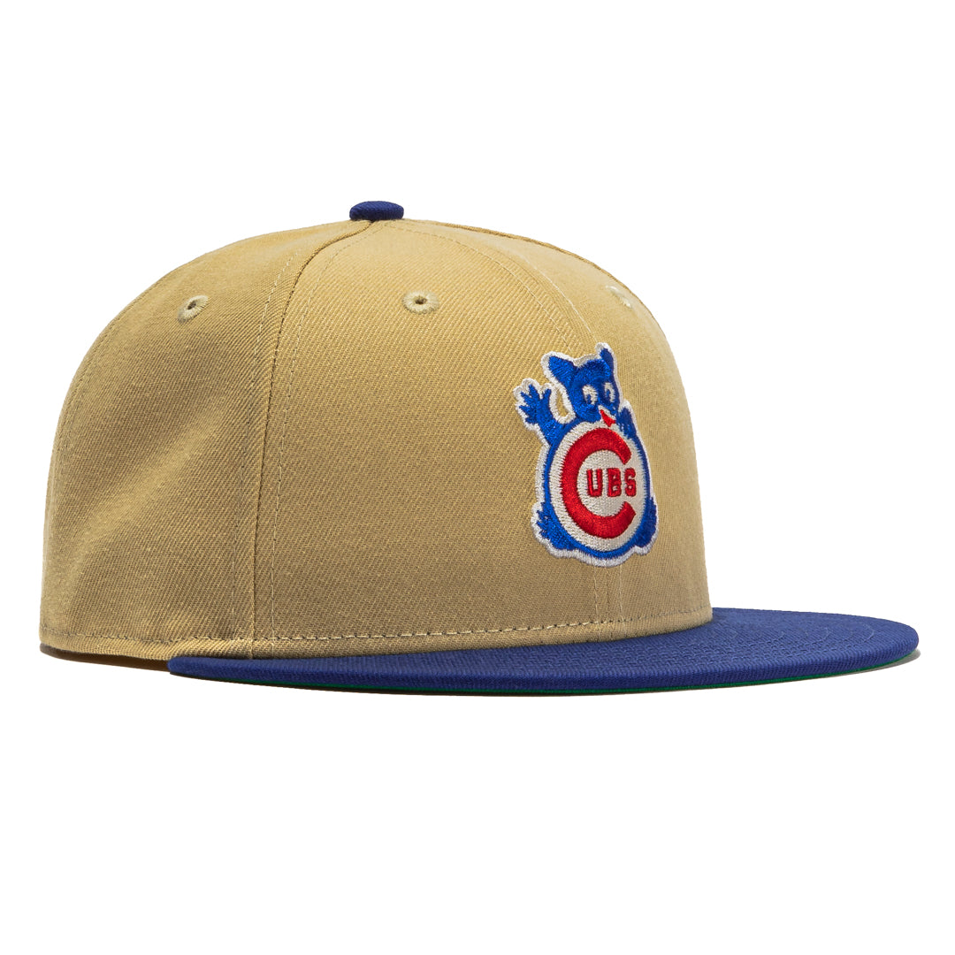 This New Era Chicago Cubs 59FIFTY fitted hat has a tan/stone six panel structured high crown, embroidered eyelets and a black fabric squatchee button. The fitted cap also has a kelly green undervisor and a black sweatband. The front panel features the Chicago Cubs logo embroidery and a side patch embroidery on the right panel. The left panel of the fitted displays the New Era logo and the official MLB logo embroidery on the rear crown.