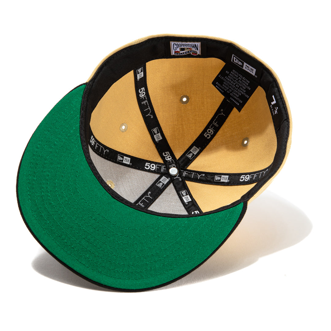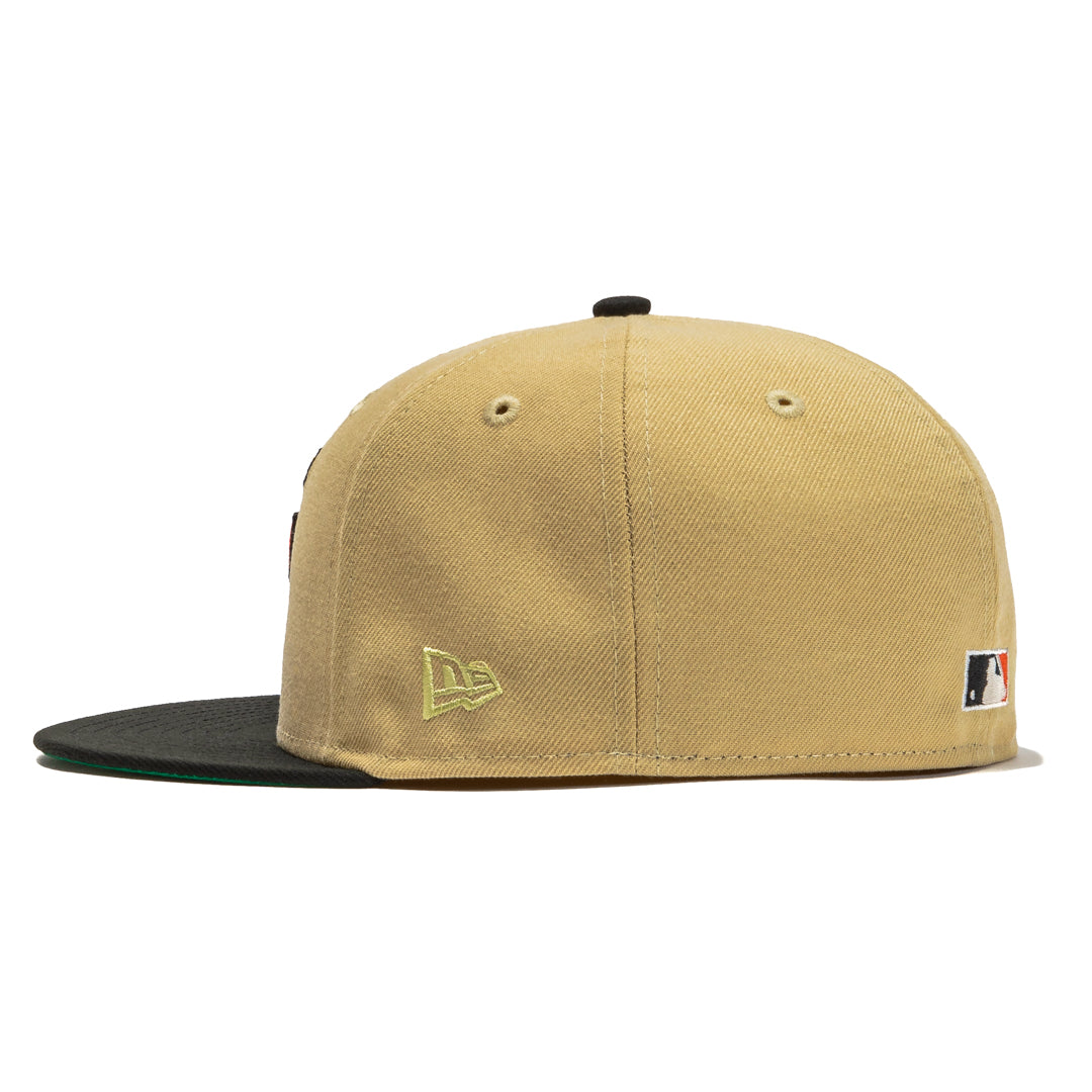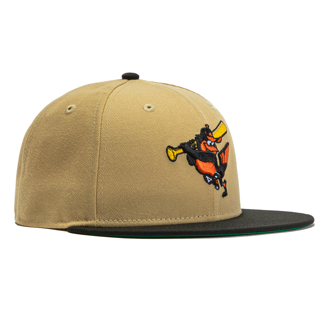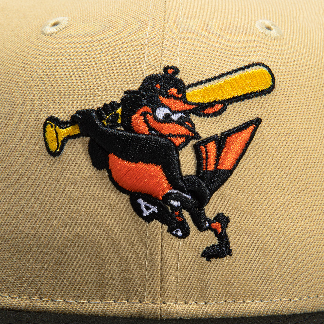 This New Era Baltimore Orioles 59FIFTY fitted hat has a tan/stone six panel structured high crown, embroidered eyelets and a black fabric squatchee button. The fitted cap also has a kelly green undervisor and a black sweatband. The front panel features the Baltimore Orioles logo embroidery and a side patch embroidery on the right panel. The left panel of the fitted displays the New Era logo and the official MLB logo embroidery on the rear crown.