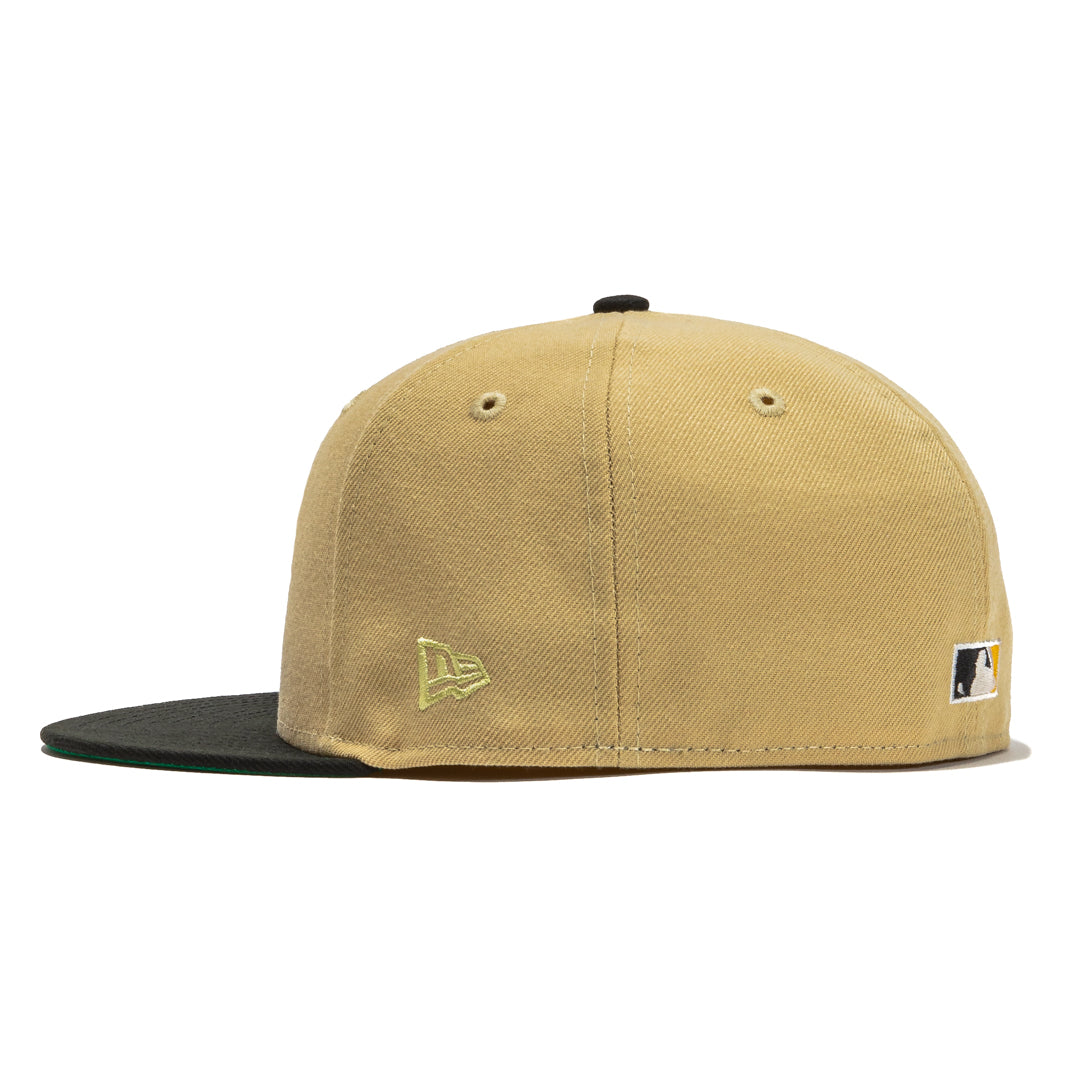 This New Era Pittsburgh Pirates 59FIFTY fitted hat has a tan/stone six panel structured high crown, embroidered eyelets and a black fabric squatchee button. The fitted cap also has a kelly green undervisor and a black sweatband. The front panel features the Pittsburgh Pirates logo embroidery and a side patch embroidery on the right panel. The left panel of the fitted displays the New Era logo and the official MLB logo embroidery on the rear crown.